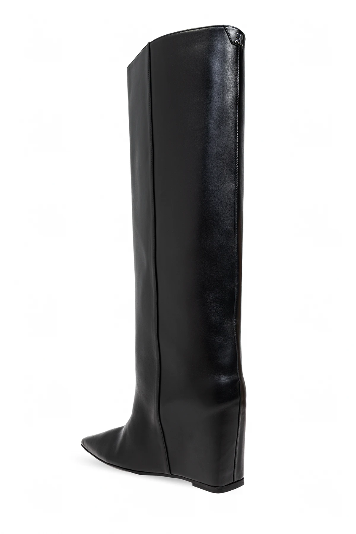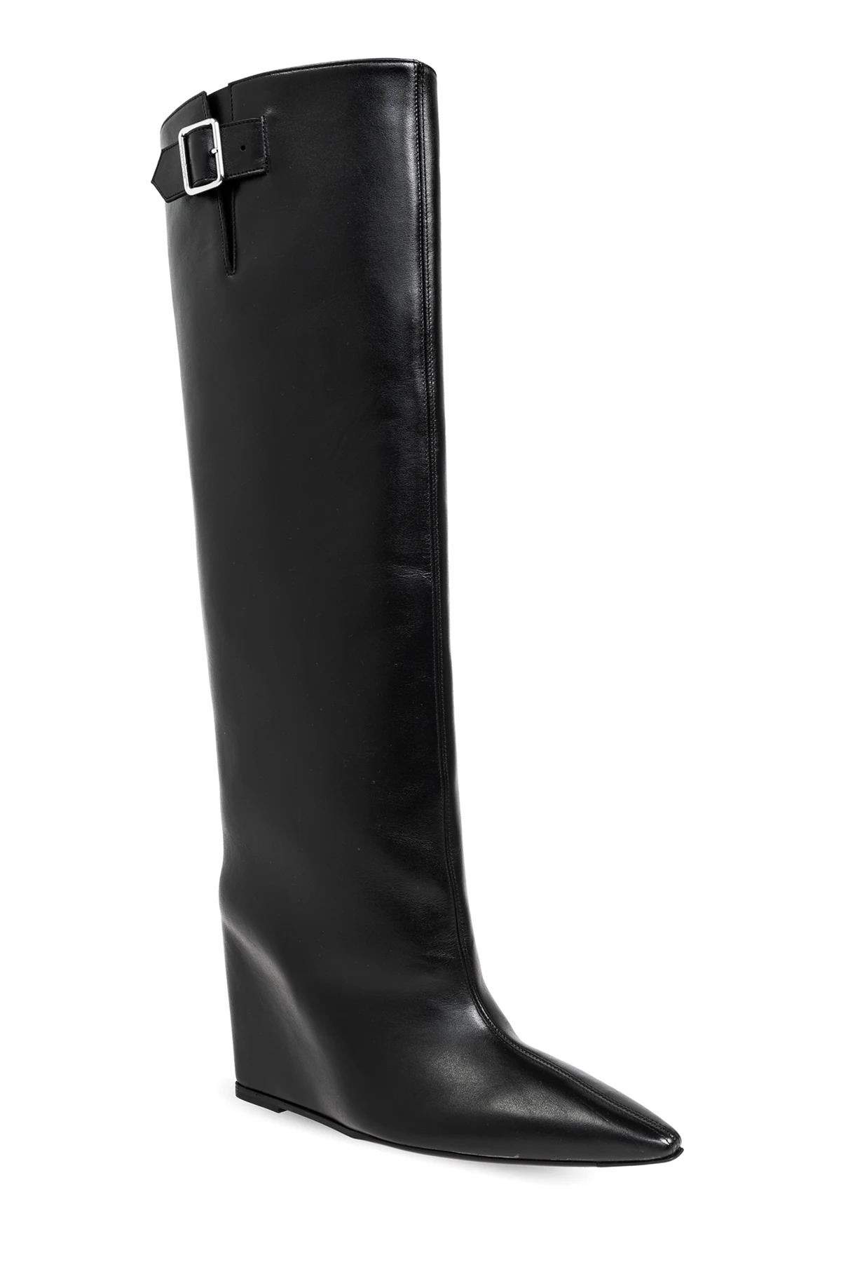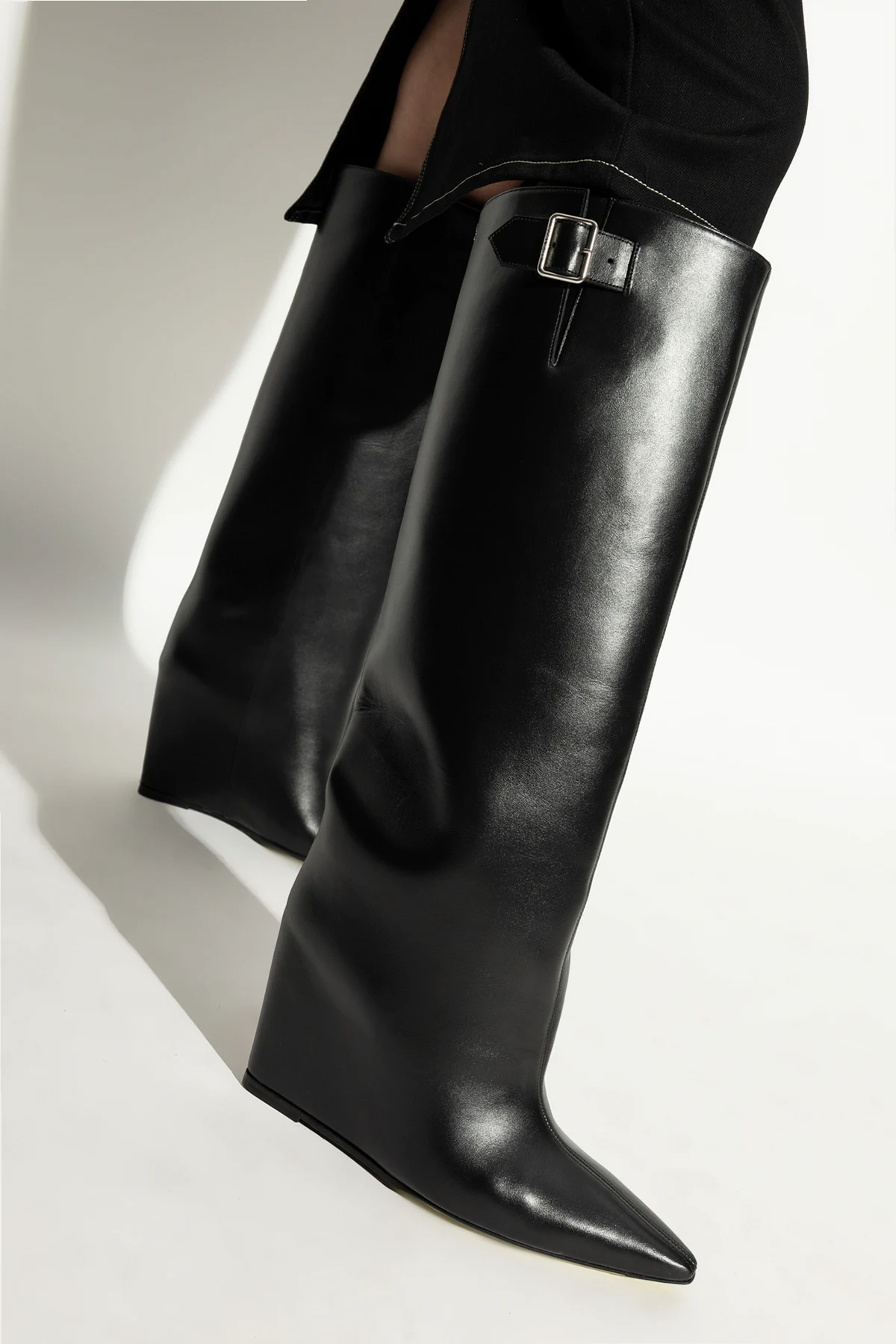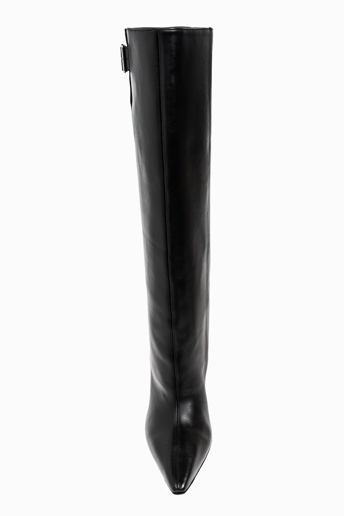 Kozaki sięgające kolan charakteryzują się zaostrzonym noskiem , co dodaje im subtelnej elegancji. Gładka, jednolita powierzchnia bez dodatkowych wzorów potęguje ich nowoczesny charakter, a metalowa klamra na górze cholewki stanowi zarówno funkcjonalne zapięcie, jak i stylowy akcent.