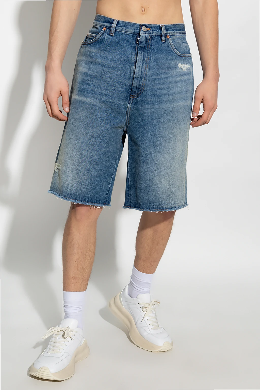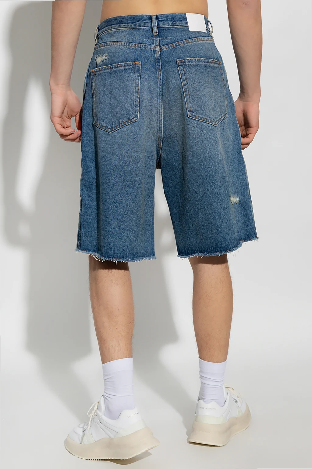Niebieskie, jeansowe szorty z przetarciami MM6 Maison Margiela. Zapinane na zamek, zaczep i guzik. Z tyłu biała naszywka z wytłoczonym logo. Pięć wsuwanych kieszeni: trzy z przodu i dwie z tyłu.
