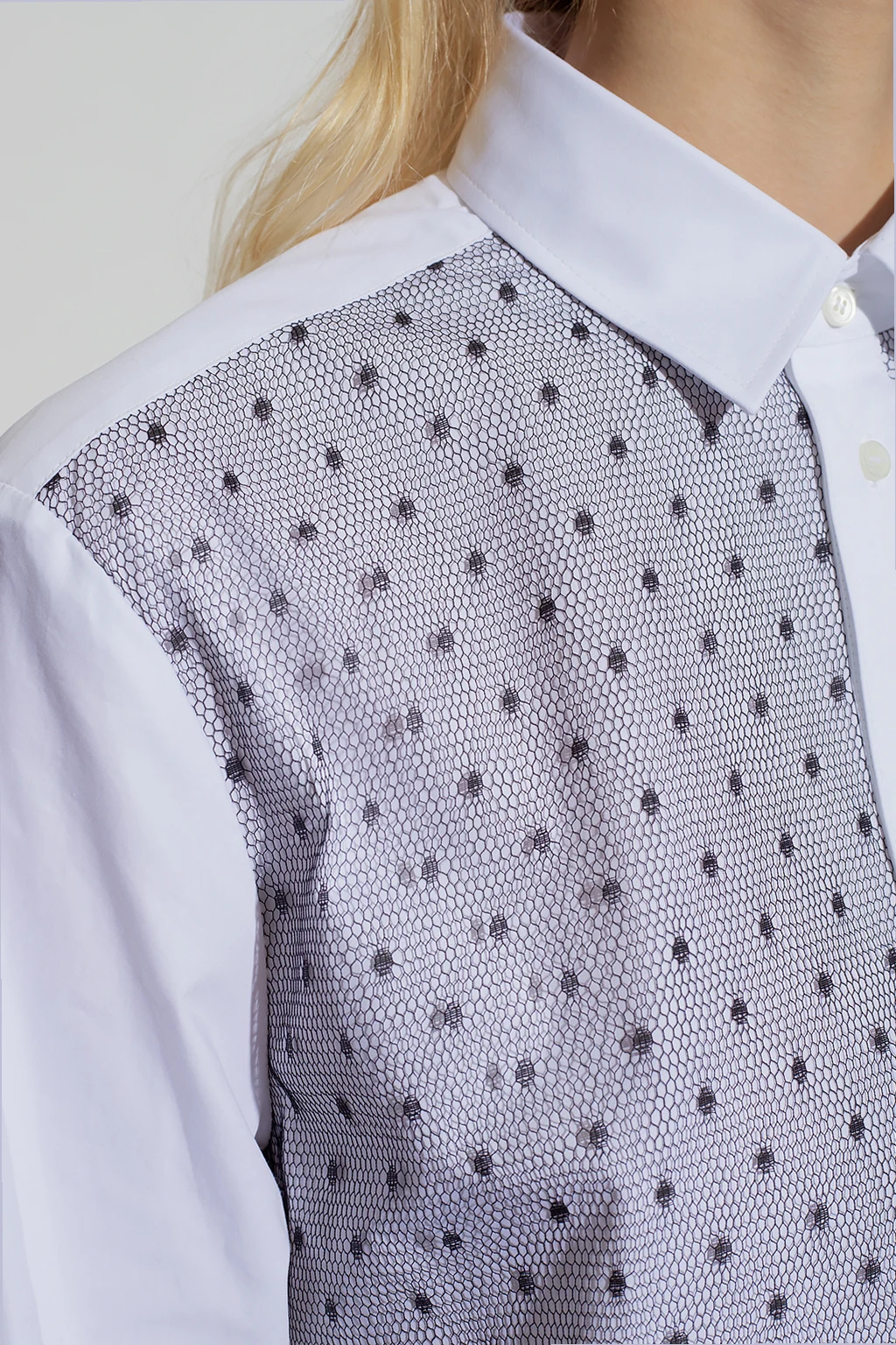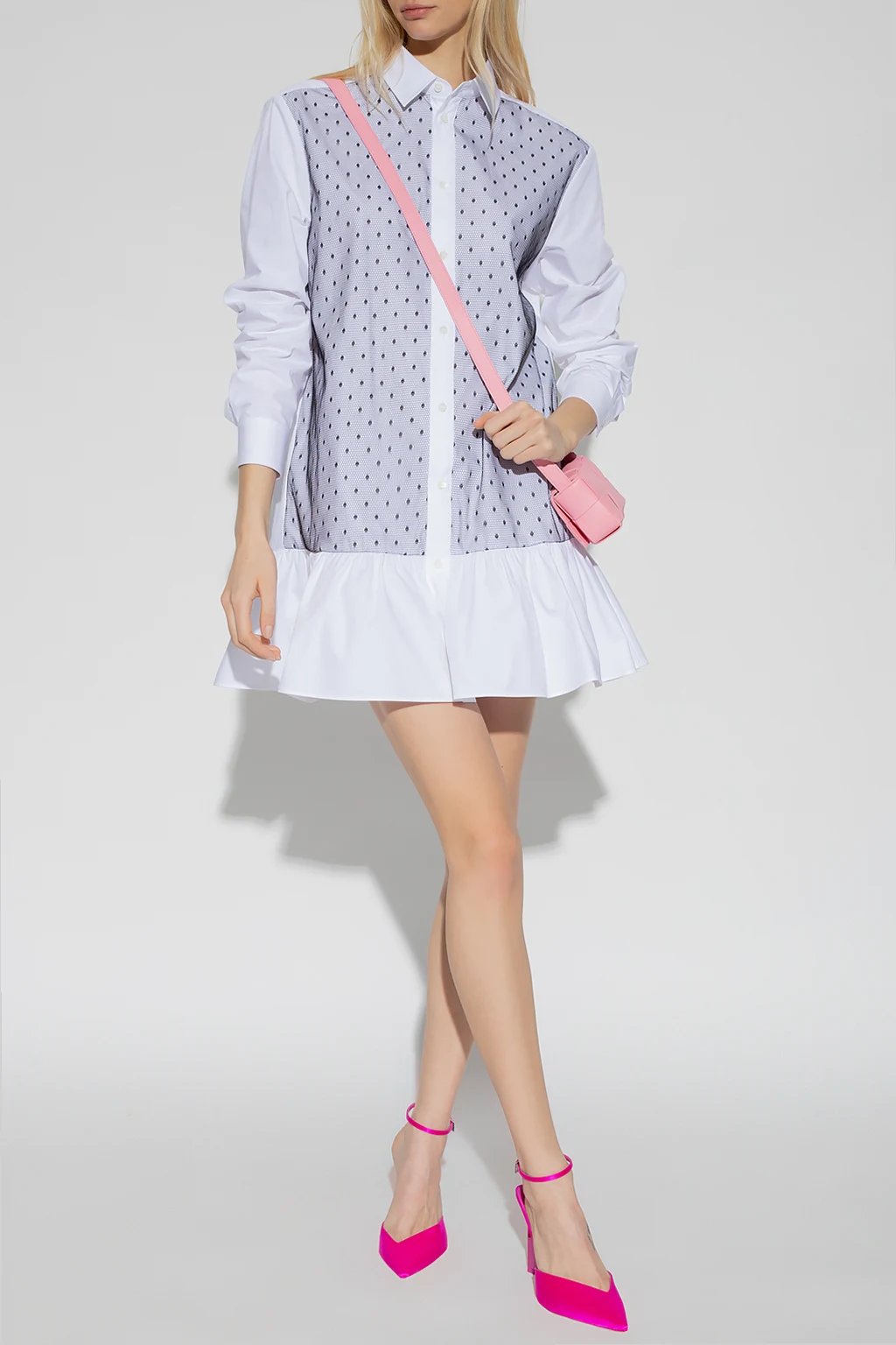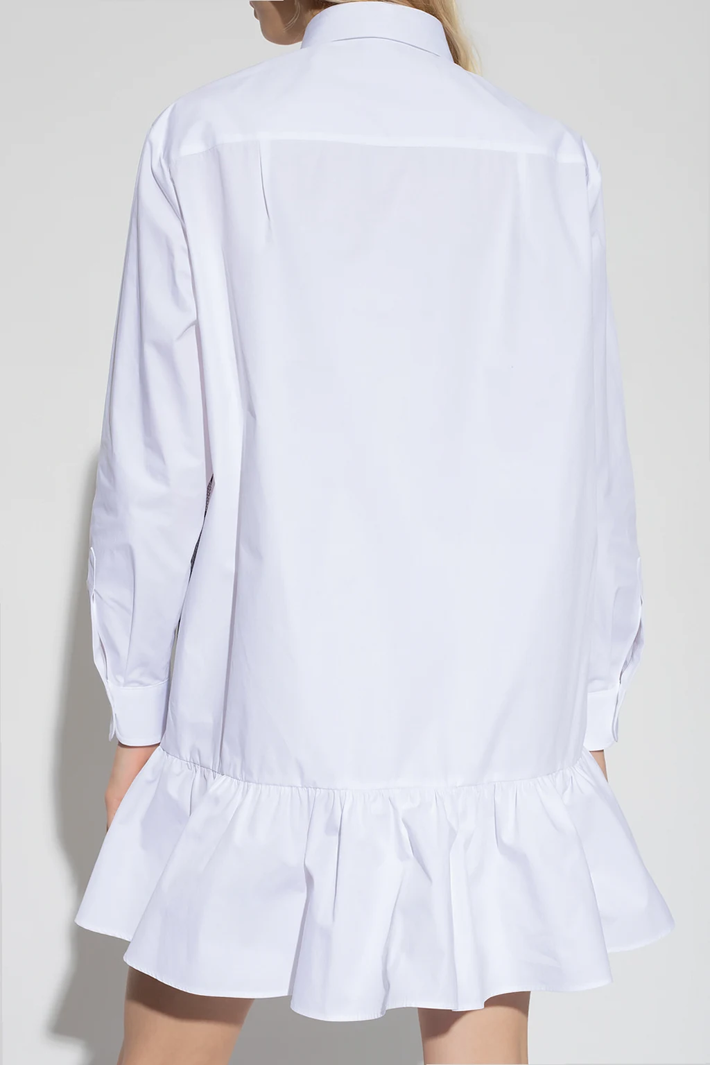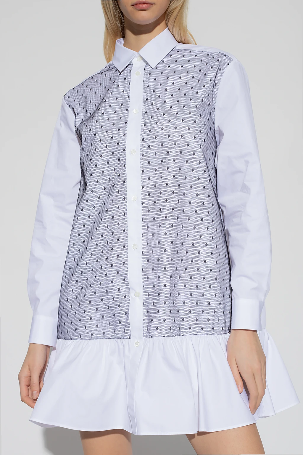 Biała, krótka sukienka o kroju koszuli Red Valentino. Wykonana z bawełny. Zapinana na guziki. Przód ozdobiony czarnym tiulem z charakterystycznym dla marki wzorem w kropki ‘Point d’Esprit’. Dwie wsuwane kieszenie. Długie rękawy zakończone mankietami z zapięciem na guzik. Dół wykończony falbaną.