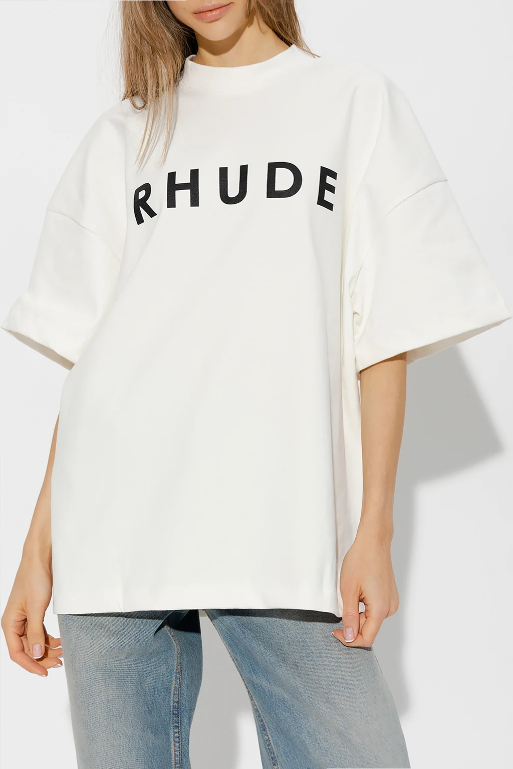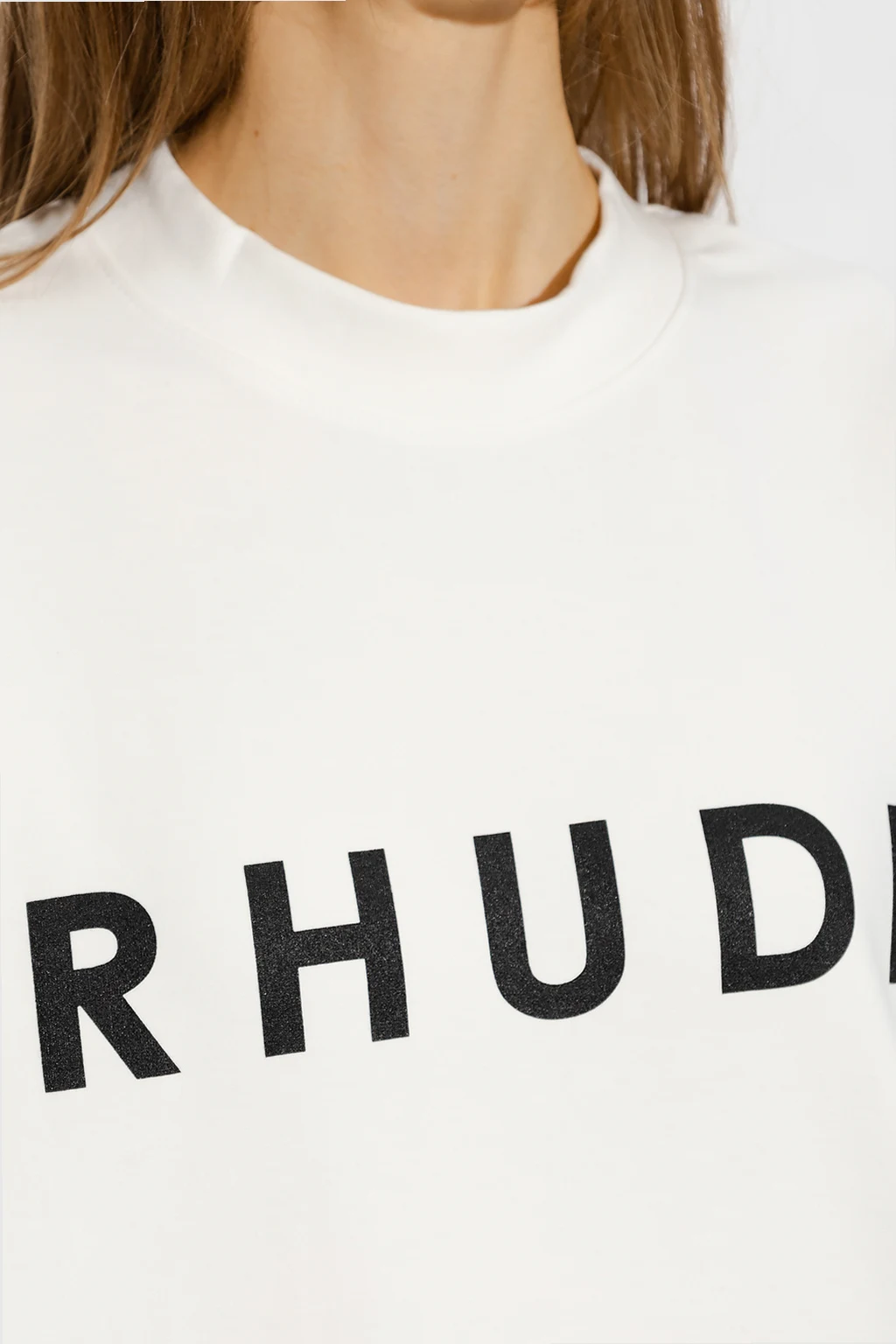 Biały, bawełniany t-shirt Rhude. Z przodu ozdobiony nadrukowanym czarnym logo. Okrągły dekolt. Krótkie rękawy.