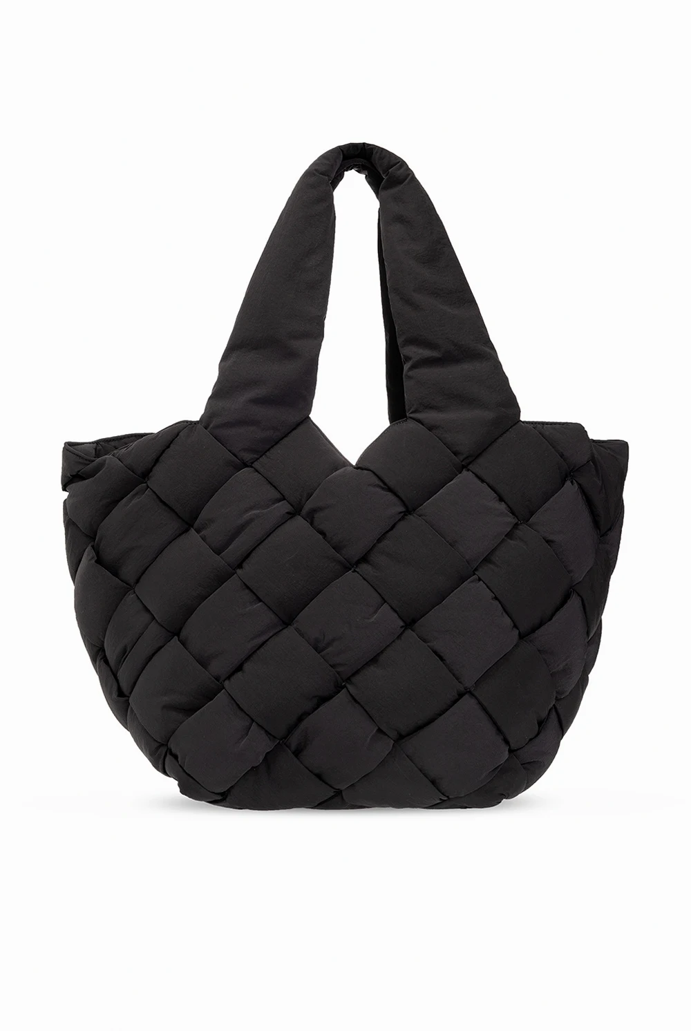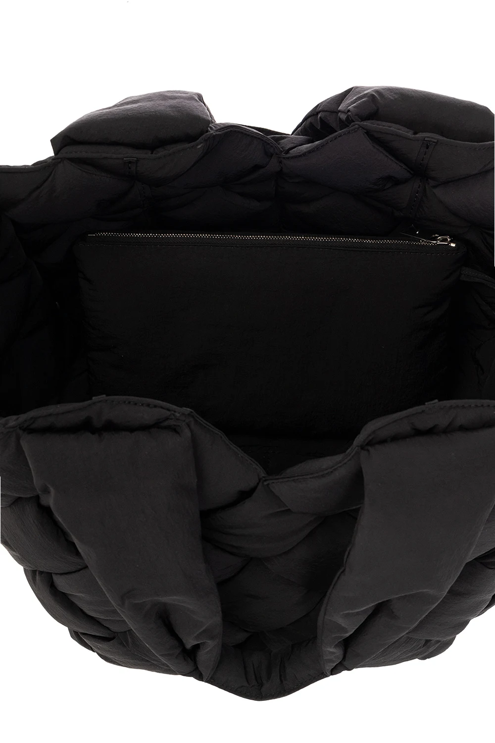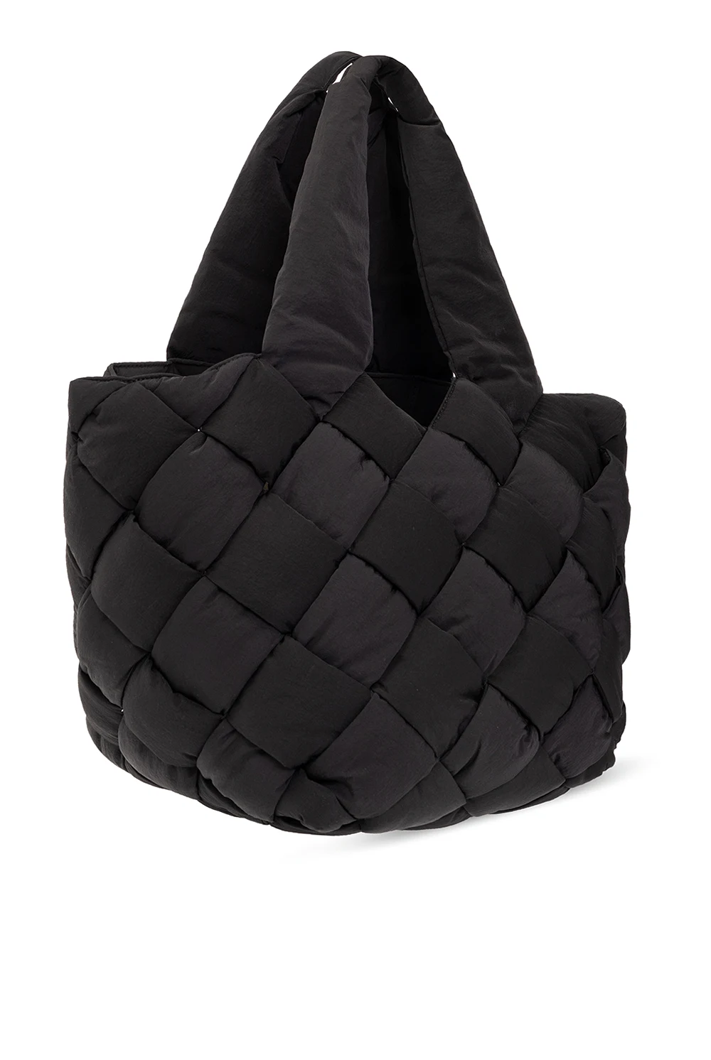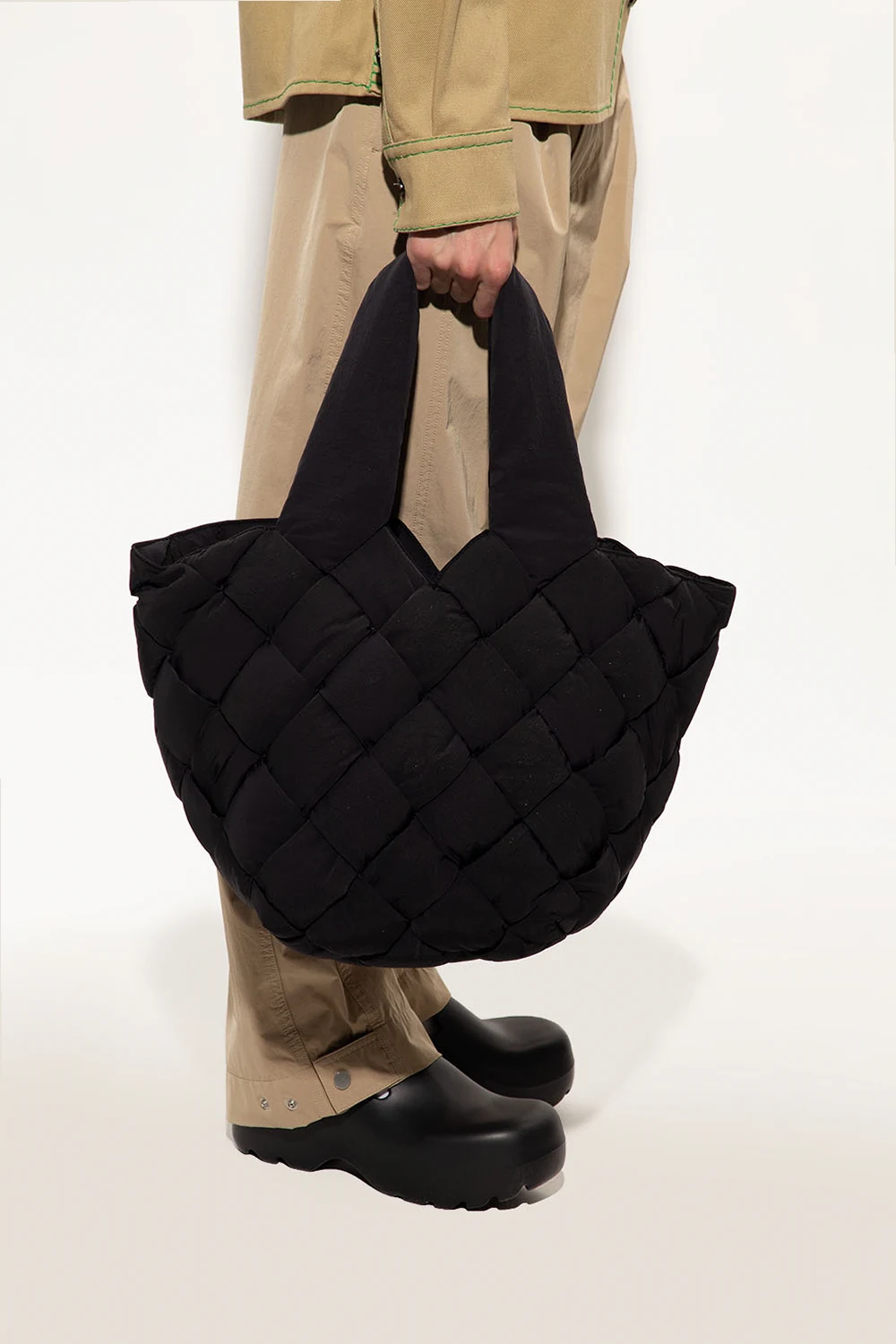 Czarna torba typu ‘shopper’, model ‘Cassette Small’ Bottega Veneta. Wykonana z wypełnionego materiału technicznego. Ozdobiona charakterystyczną dla marki plecionką ‘Intreccio’. Pas na ramię z możliwością regulacji długości. Dwie półokrągłe rączki. Dołączona saszetka na pasku, zamykana na zamek. Metalowe elementy w kolorze srebrnym.
