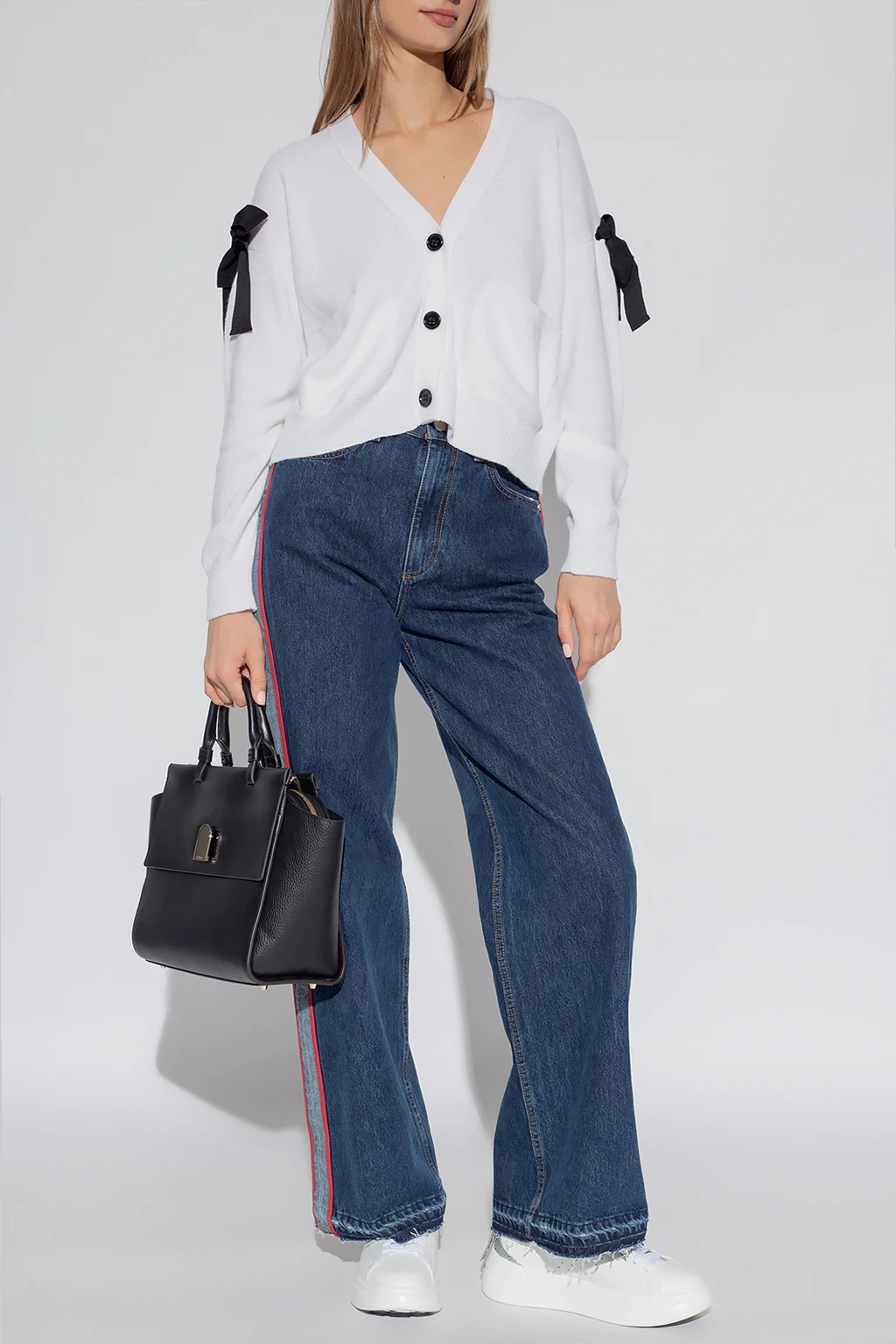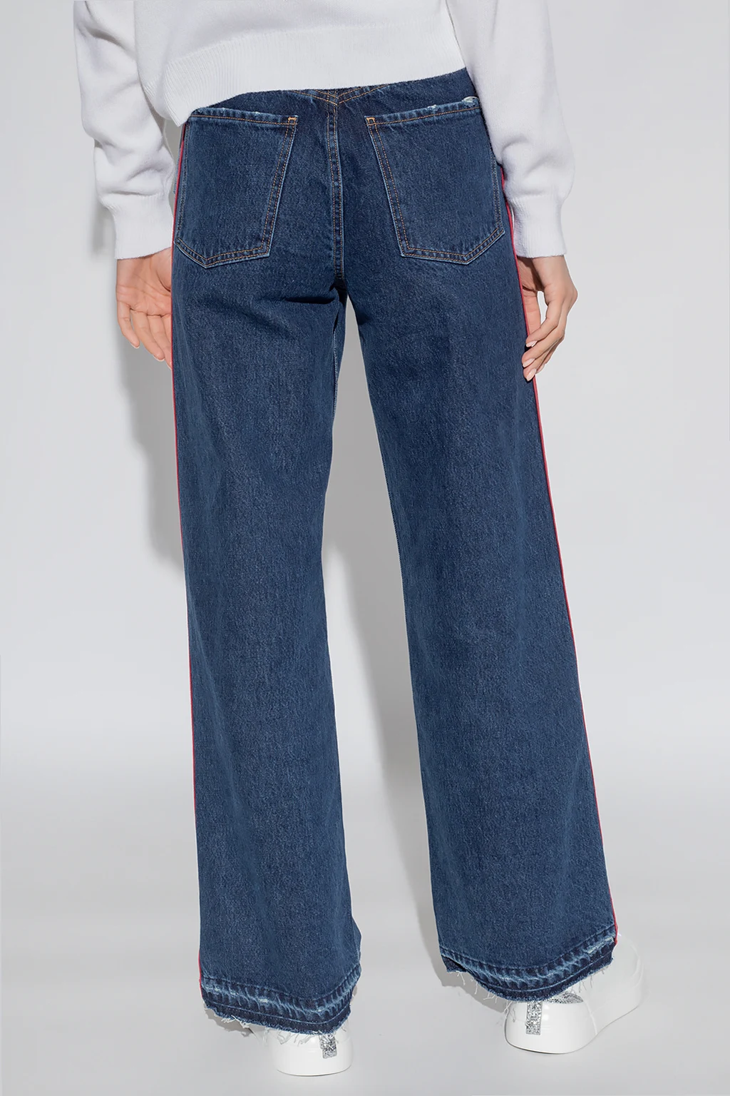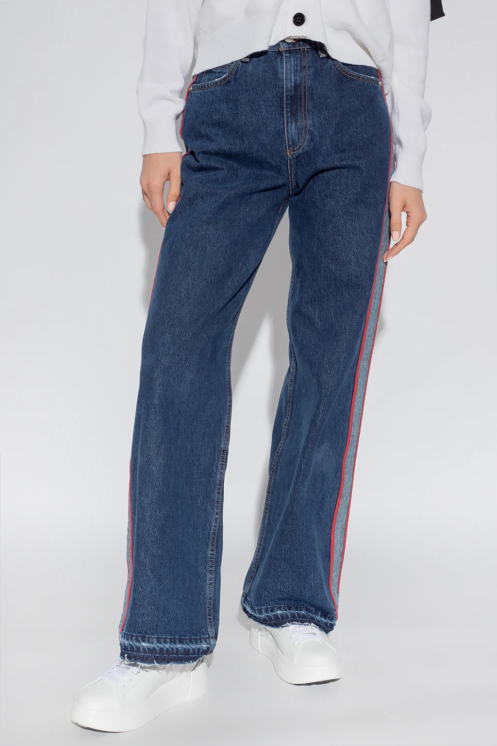 Granatowe jeansy Red Valentino. Wykonane z bawełny. Zapinane na zamek oraz guzik. Ozdobione lampasami w kolorze jasnoniebiesko-czerwonym. Pięć kieszeni wsuwanych. Szerokie nogawki.