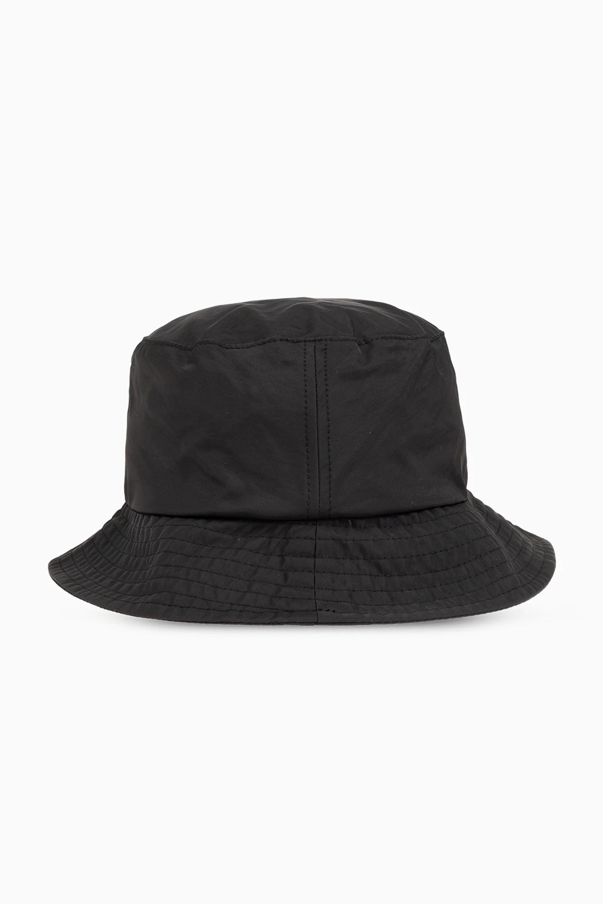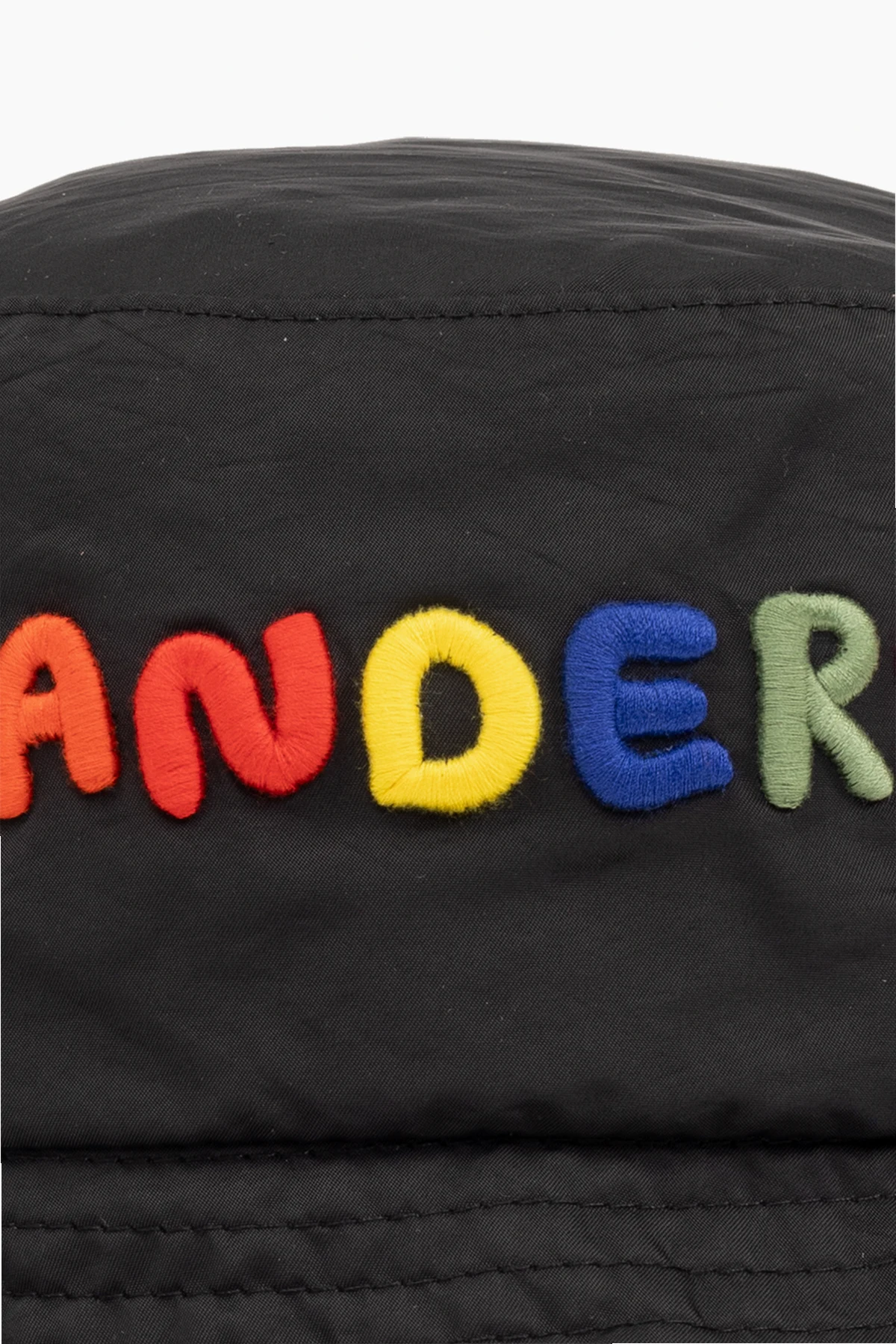 Czarny kapelusz typu ‘bucket’ JW Anderson. Z przodu kolorowe, wyszyte logo.