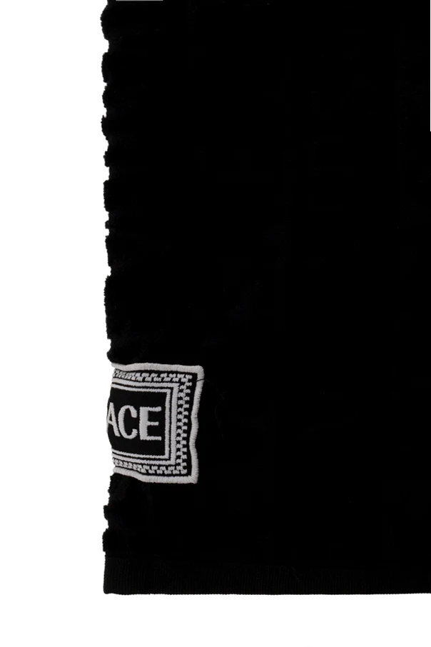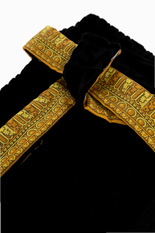 Czarny szlafrok dla psa Versace Home. Wykonany z bawełny. Ozdobiony wzorem z logo. Z przodu czarno-biała naszywka. Dołączony pasek. Z jednej strony czarny z logo. Z drugiej strony żółto-brązowy ze wzorem ‘Barocco’.