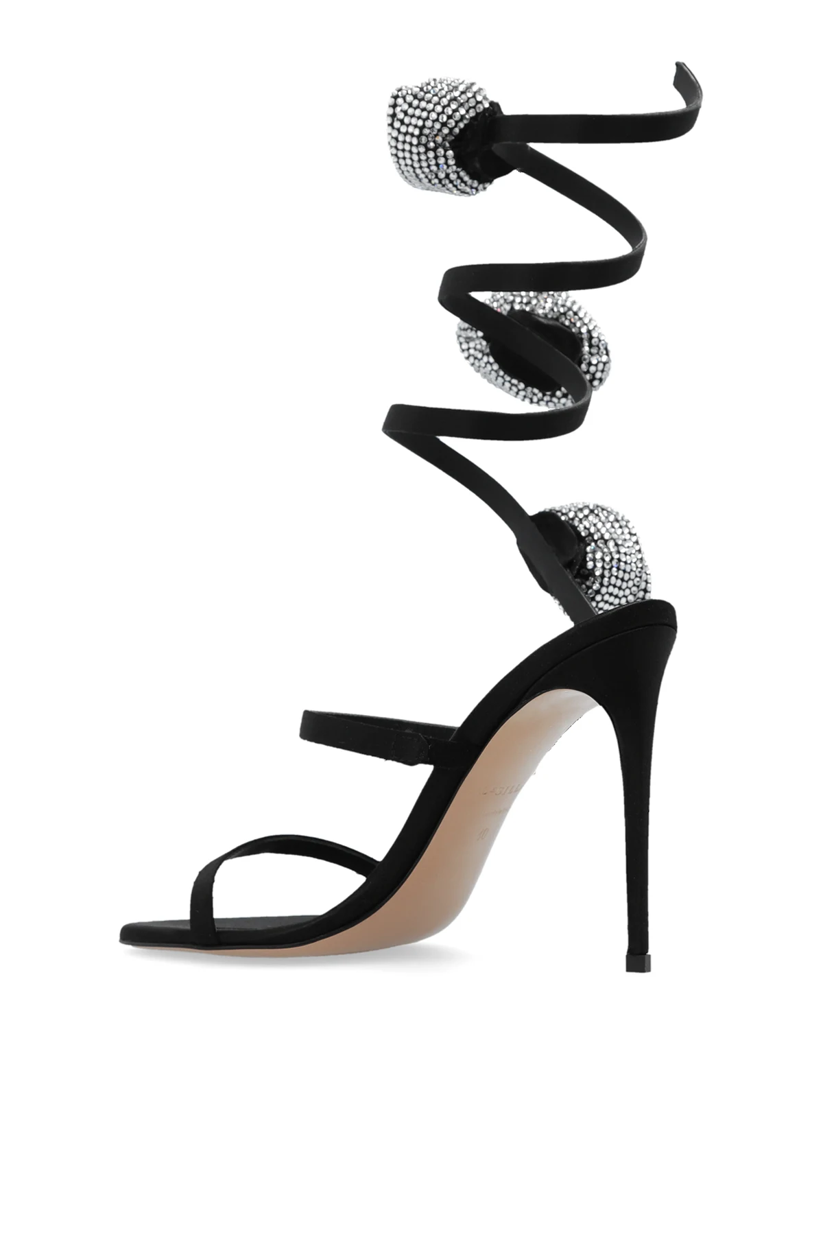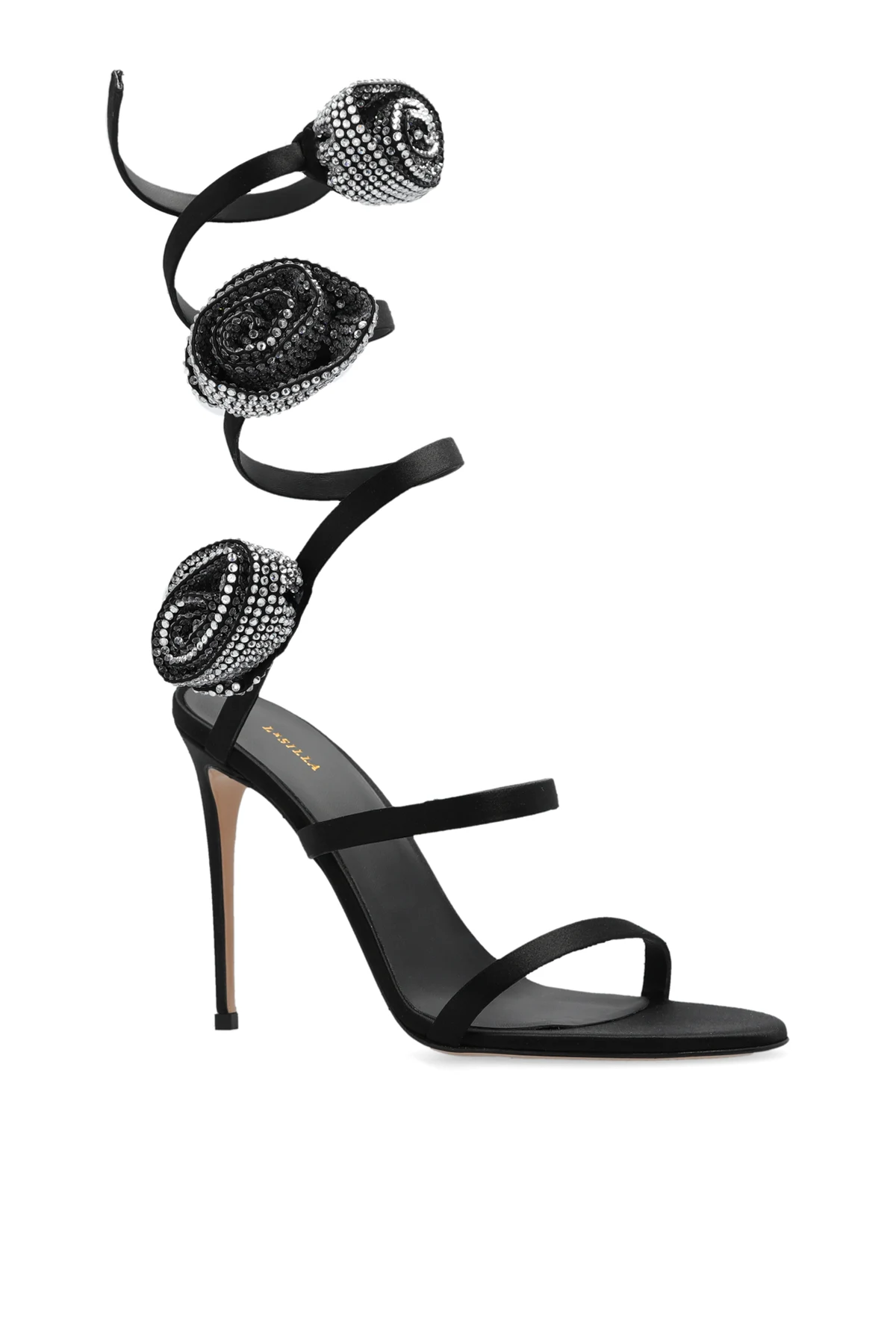 Czarne sandały na obcasie, model ‘Rose’ Le Silla. Wykonane z satynowego materiału, wykończone skórą. Usztywniany pas nad kostkę ozdobiony aplikacjami w kształcie róż z połyskującym wykończeniem. Beżowa, skórzana podeszwa wykończona gumą.