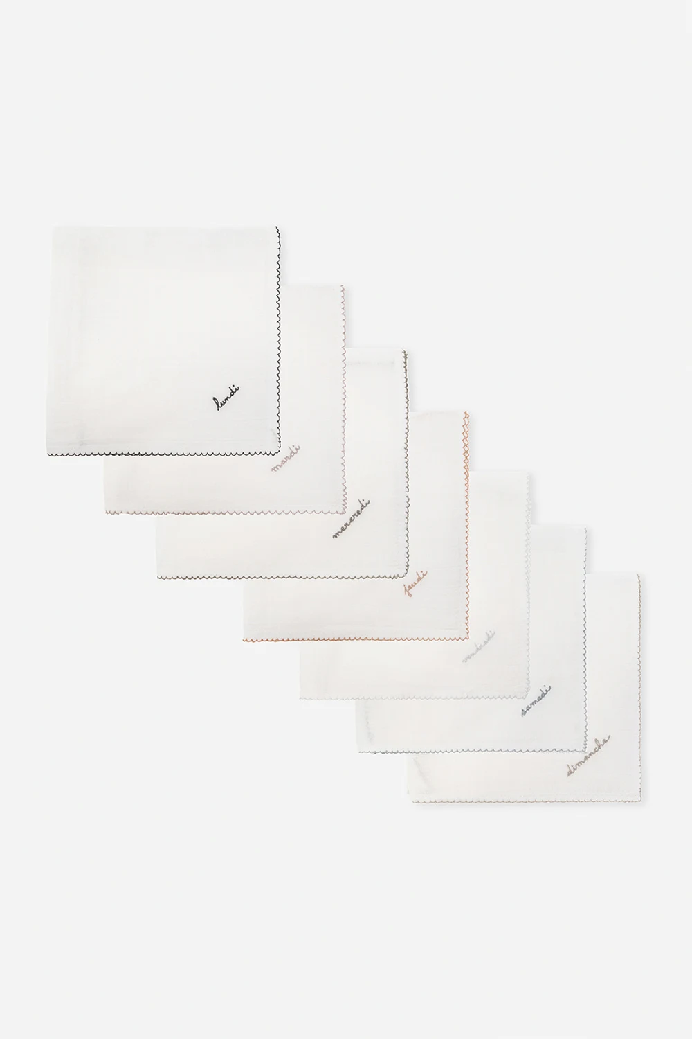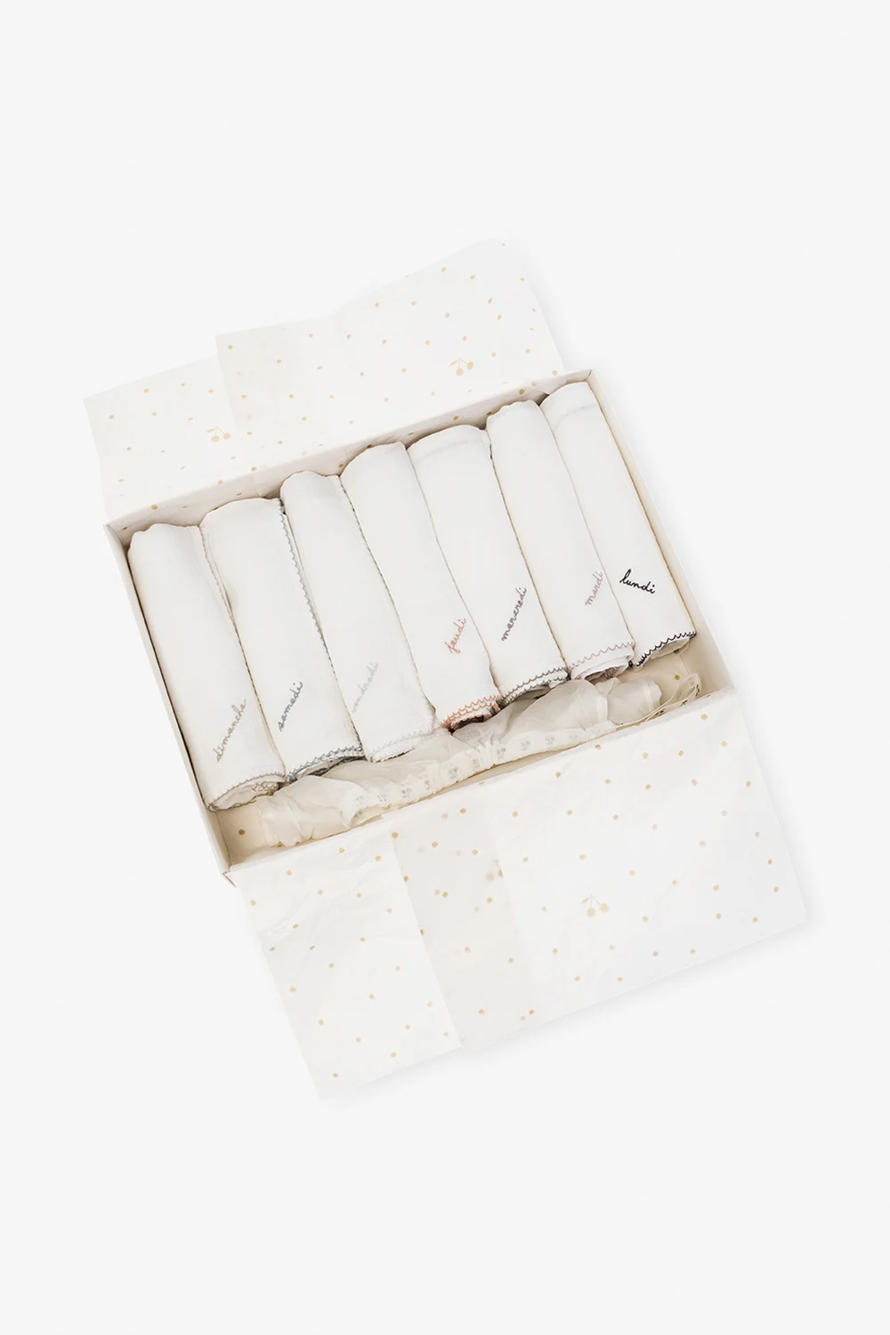 Zestaw upominkowy Bonpoint. Siedmiopak tetrowych pieluch w kolorze białym ozdobionych wyszytymi nazwami dni tygodnia. Dekoracyjne, kontrastowe wykończenia. Dołączona drewniana szczotka i pudełko na mleczne zęby ozdobione logo.