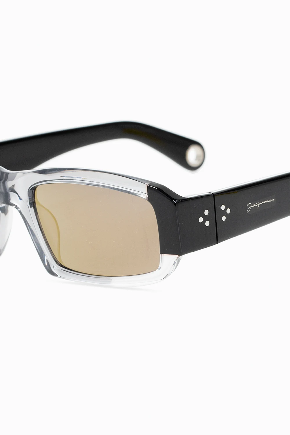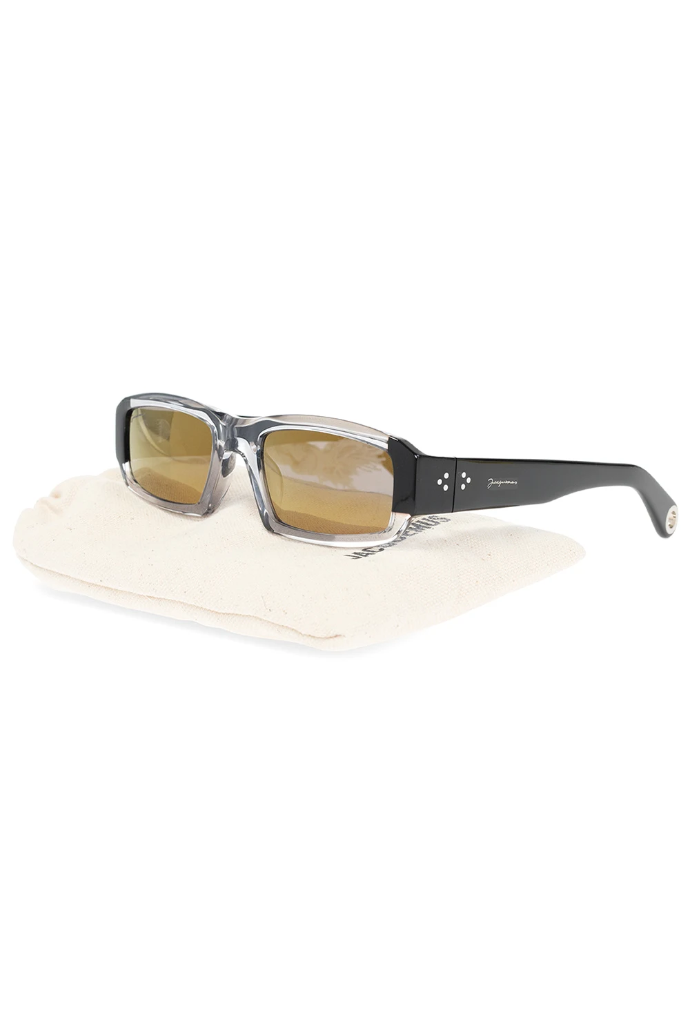 Szaro-czarne, transparentne okulary przeciwsłoneczne, model ‘Altu’ Jacquemus. Żółte, certyfikowane soczewki 100% UVA/UVB. Dołączone etui.