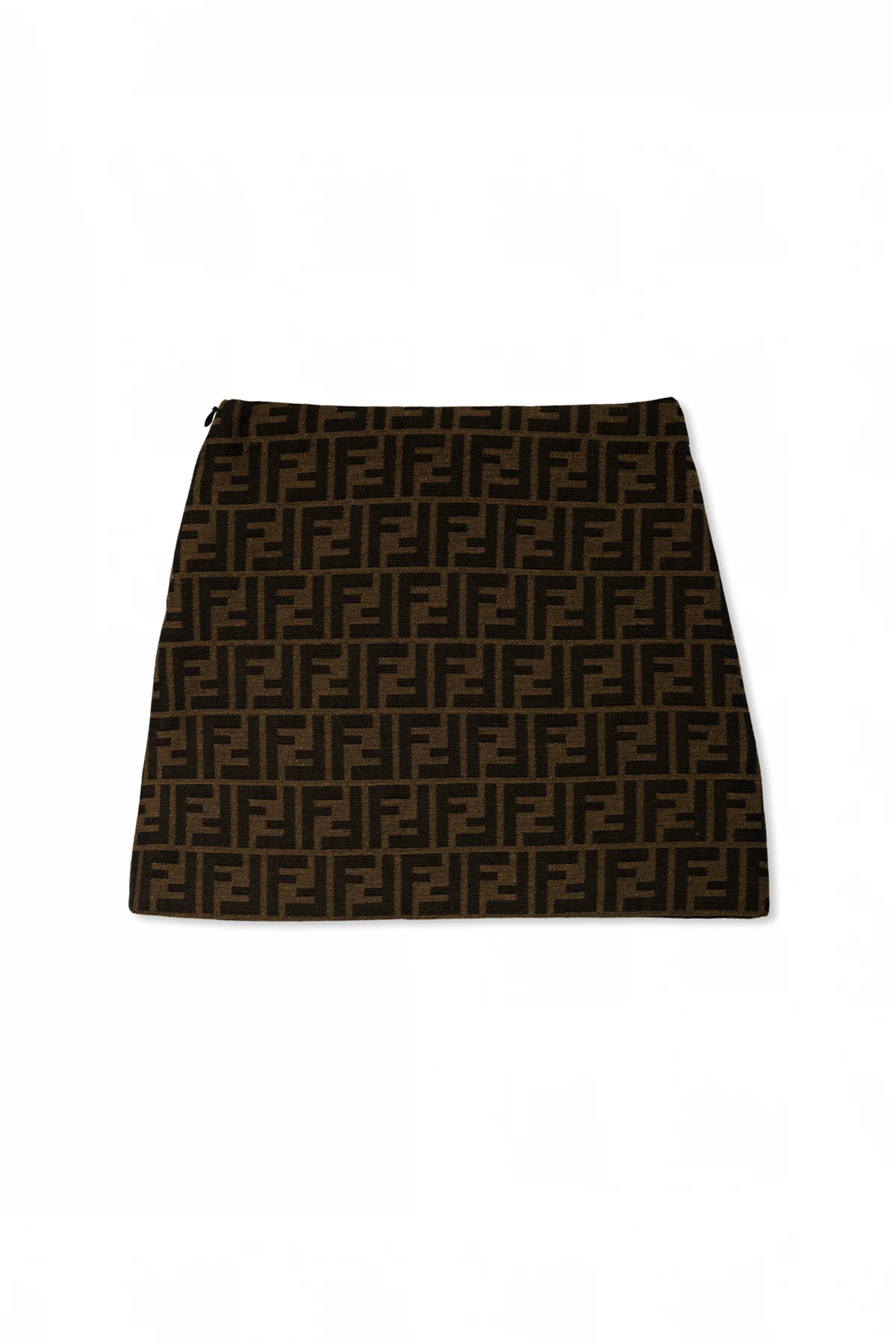 Spódnica wyróżnia się prostym, trapezowym krojem, który subtelnie rozszerza się ku dołowi, nadając jej klasyczny urok. Cała powierzchnia spódnicy pokryta jest charakterystycznym dla Fendi monogramem "FF", układającym się w regularne, poziome rzędy, co tworzy gęsty i stylowy wzór.