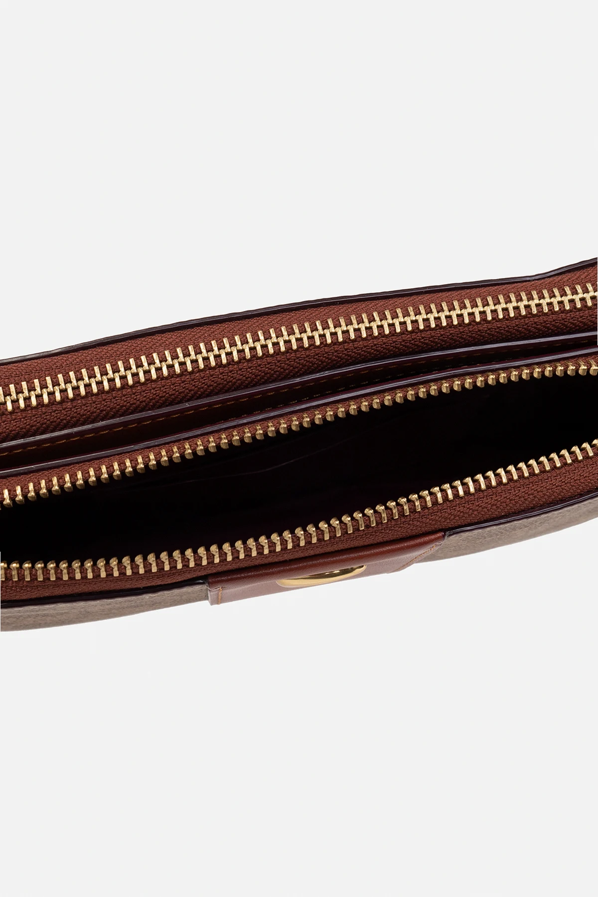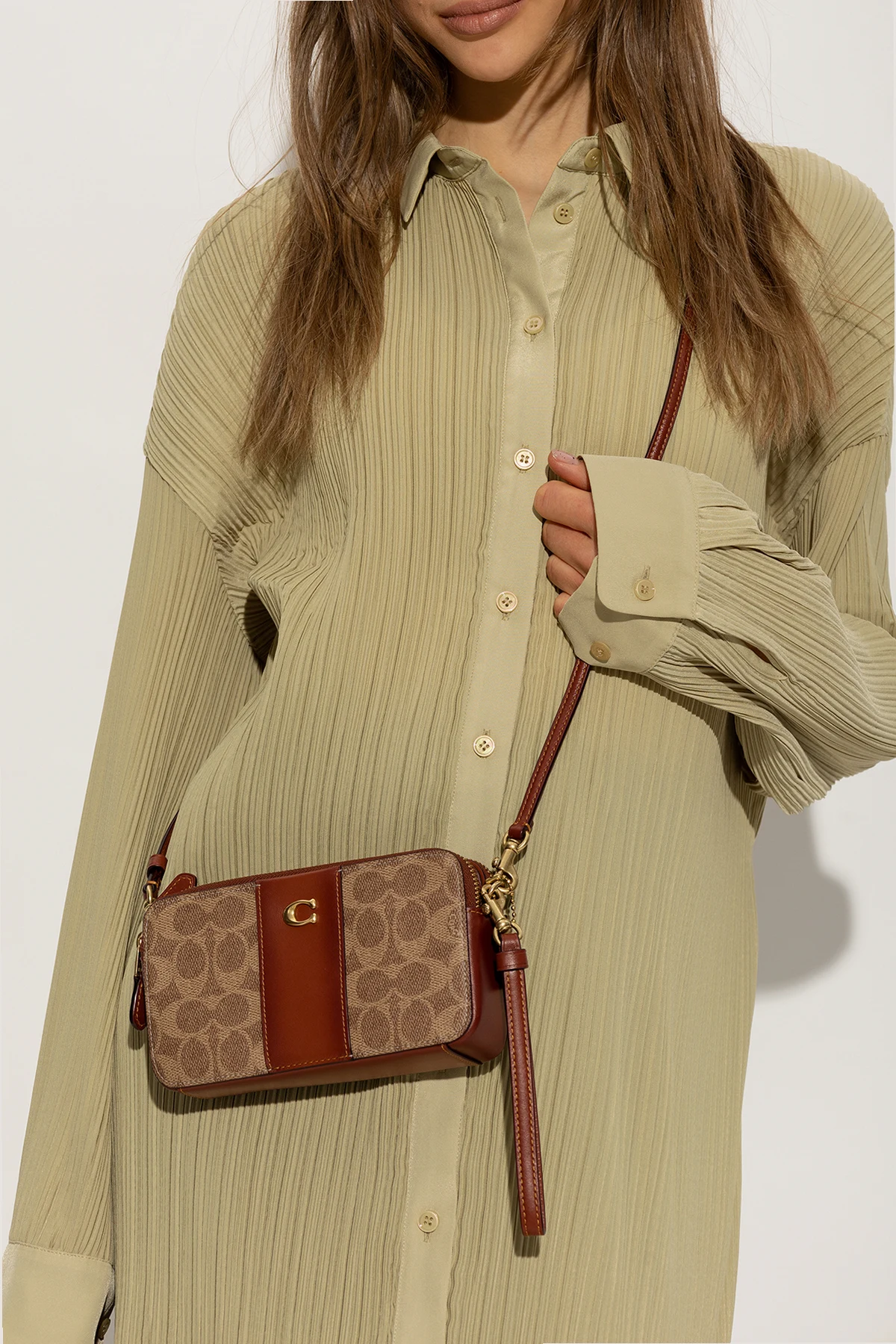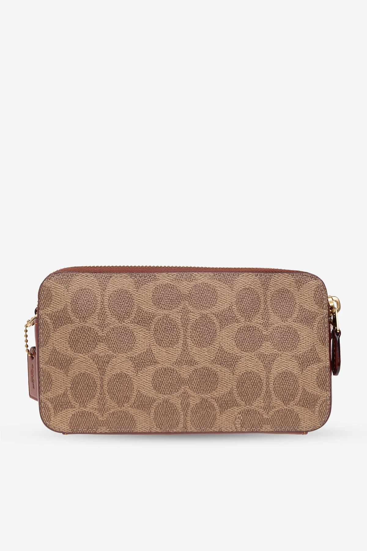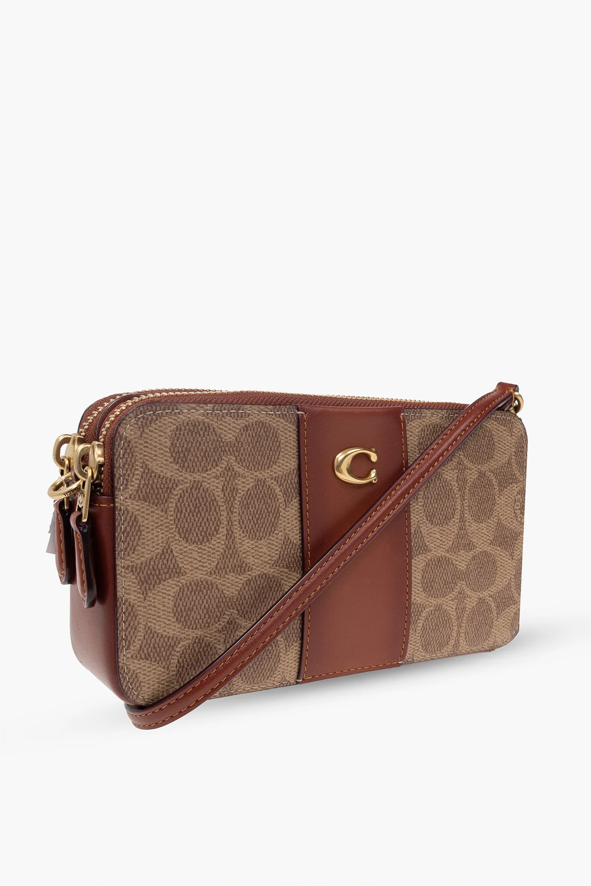 Brązowo-beżowa torba na ramię, model 'Kira' Coach. Wykonana z płótna powlekanego i skóry. Zamykana na zamek. Z przodu metalowa aplikacja w kształcie logo. Ozdobiona wzorem z monogramem. Odpinany pasek na nadgarstek oraz regulowany pasek na ramię. Wewnątrz dwie oddzielne komory, wsuwana kieszeń i cztery miejsca na karty. Metalowe elementy w kolorze złotym.