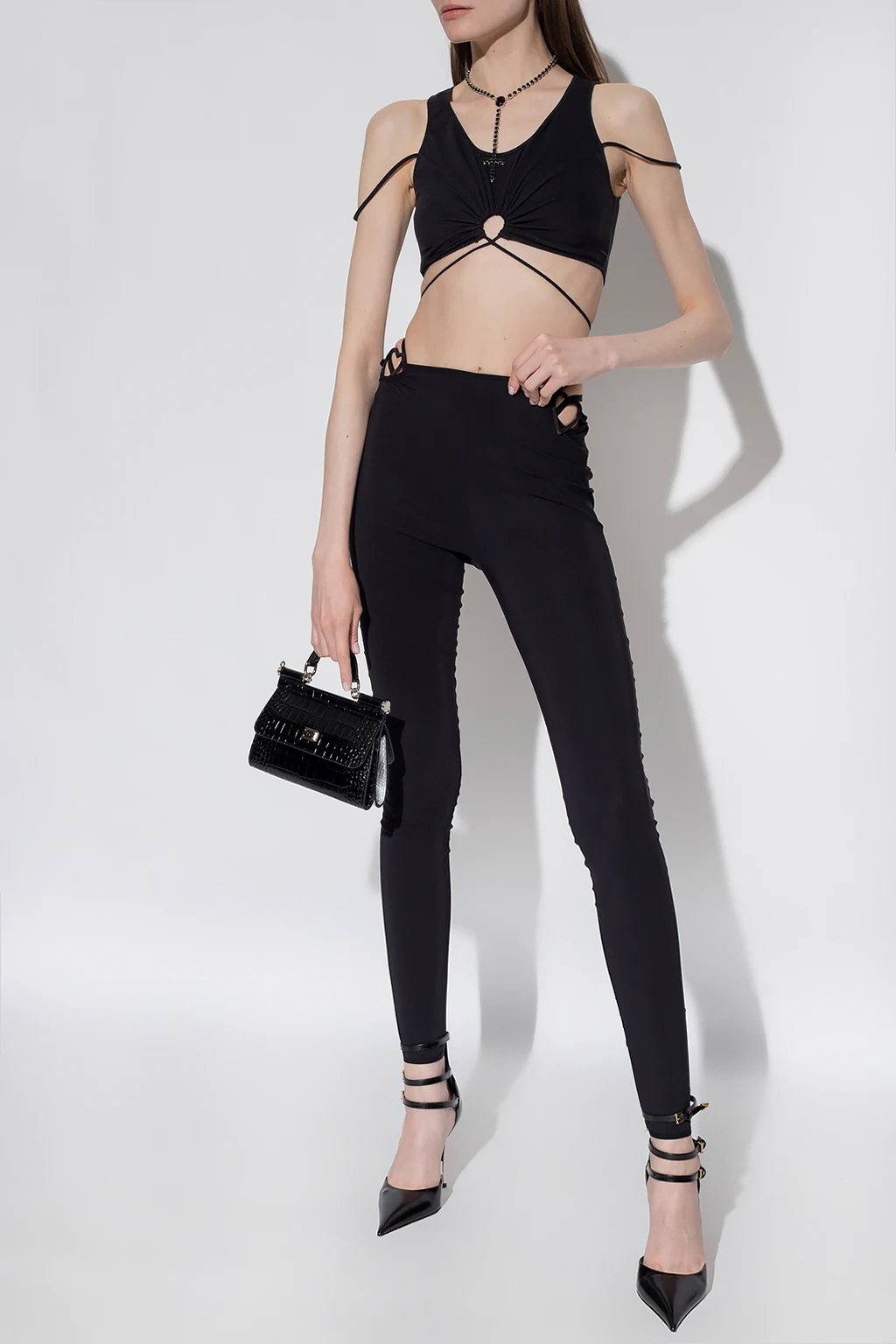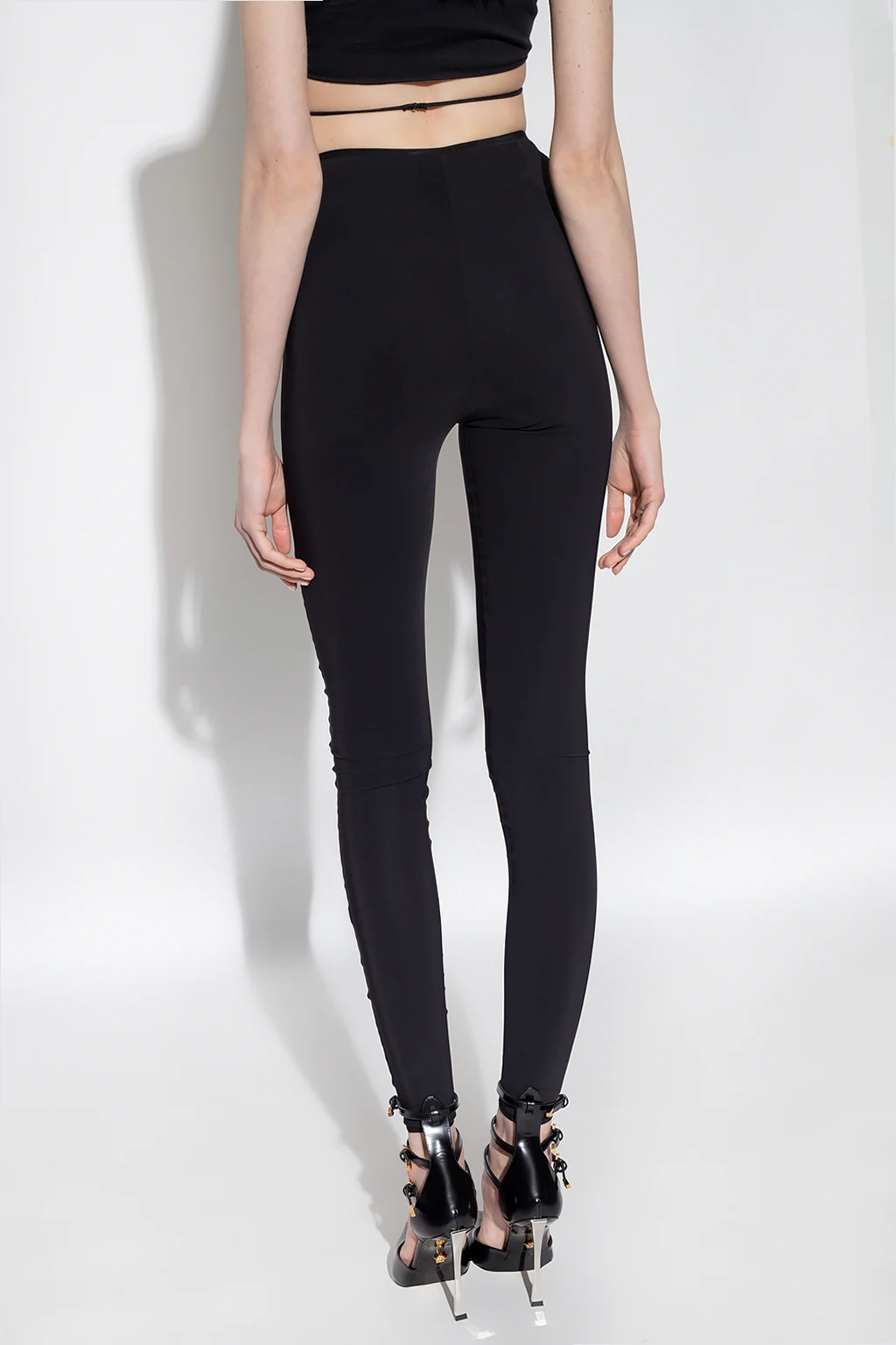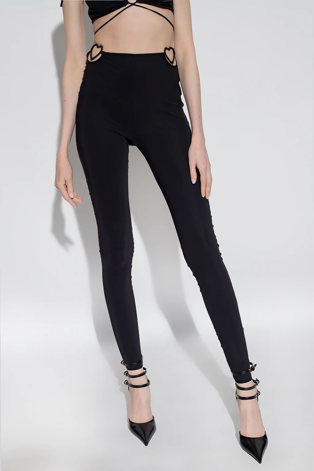 Czarne legginsy Nensi Dojaka. W talii wszyta guma z dekoracyjnymi wycięciami i aplikacją w kształcie serca. Długie nogawki wykończone ściągaczem.