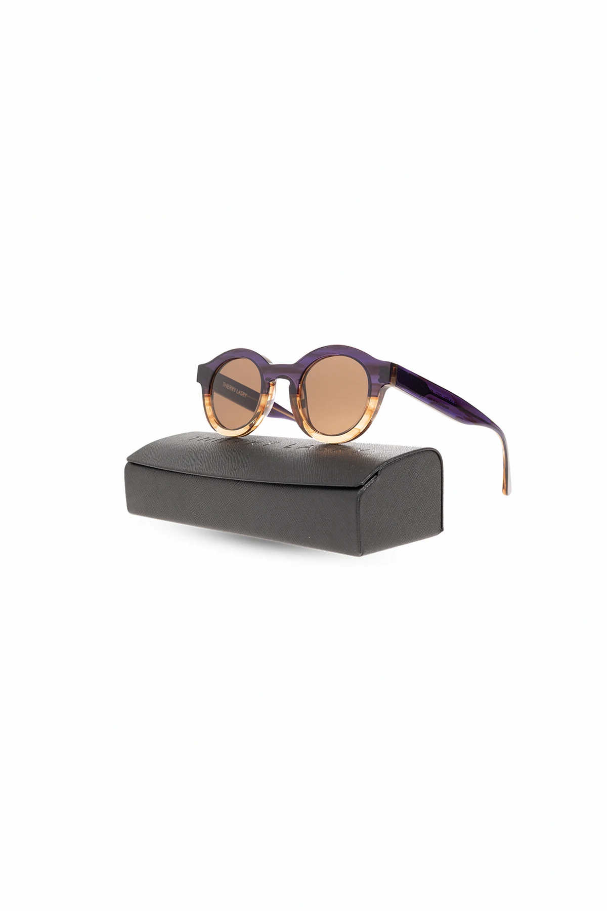 Fioletowo-brązowe, częściowo transparentne okulary przeciwsłoneczne, model ‘Olympy’ Thierry Lasry. Okrągłe oprawki. Brązowe soczewki z ochroną przed promieniowaniem UV. Ręcznie wykonane we Włoszech. Dołączone etui.
