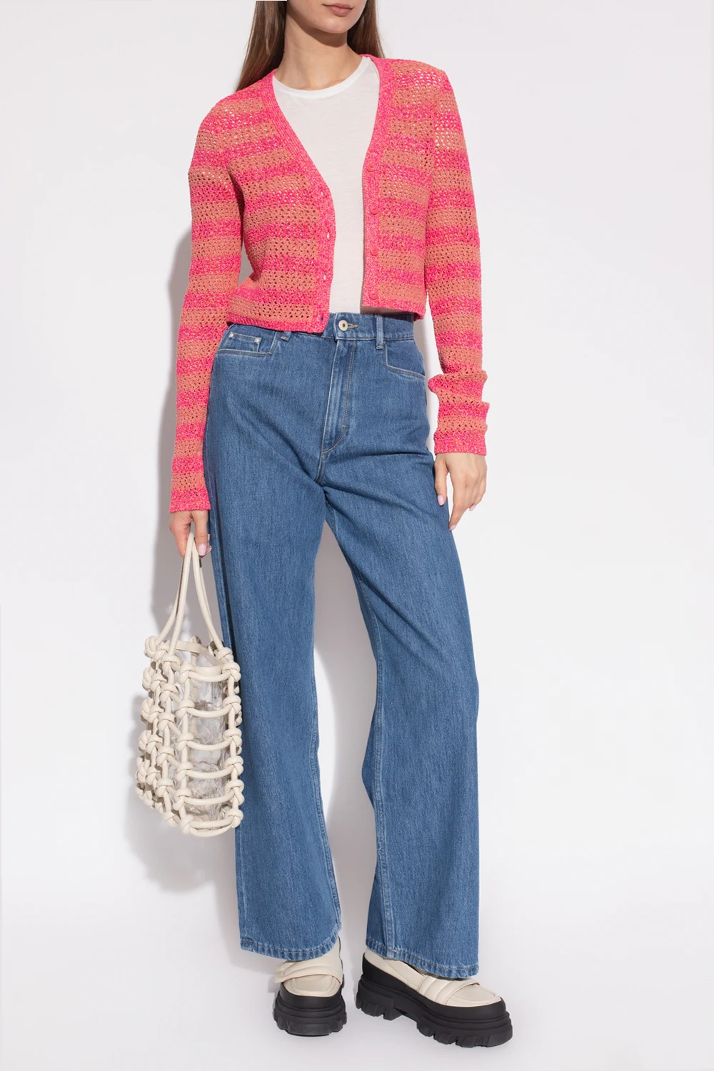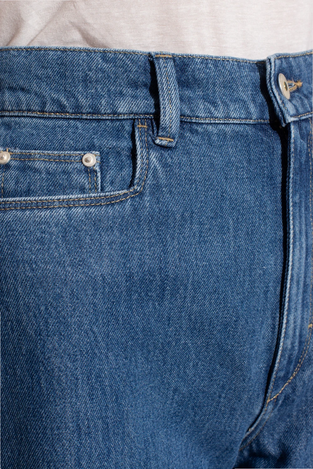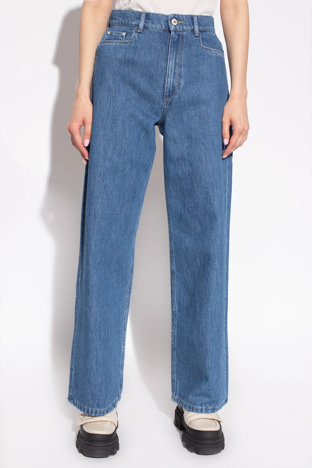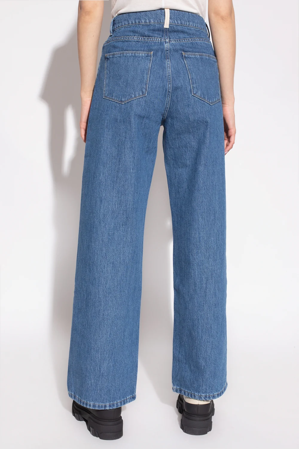 Niebieskie jeansy, model ‘Magnolia’ Wandler. Zapinane na guzik i zamek. Luźny, pudełkowy krój zainspirowany modelami z lat 90-tych. Z tyłu charakterystyczna dla marki biała, skórzana szlufka. Pięć wsuwanych kieszeni: trzy z przodu oraz dwie z tyłu. Długie, szerokie nogawki.