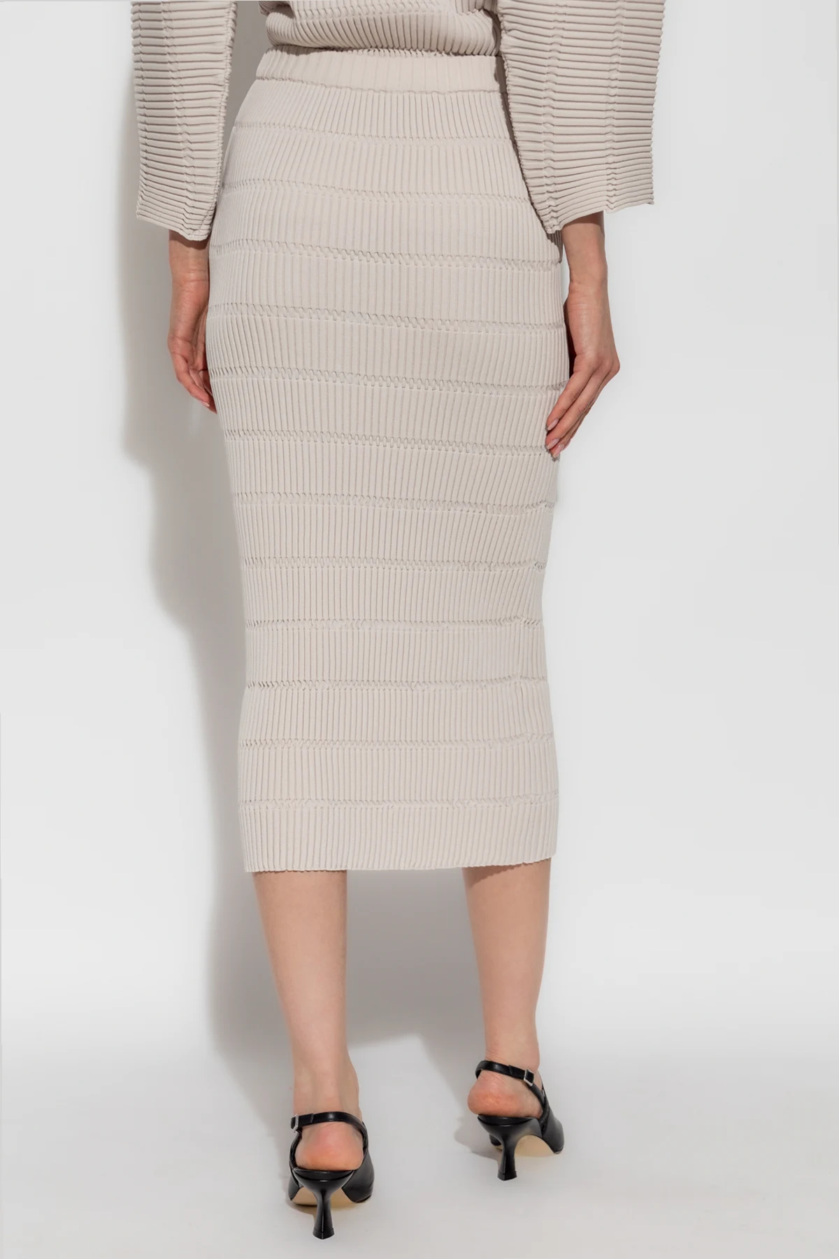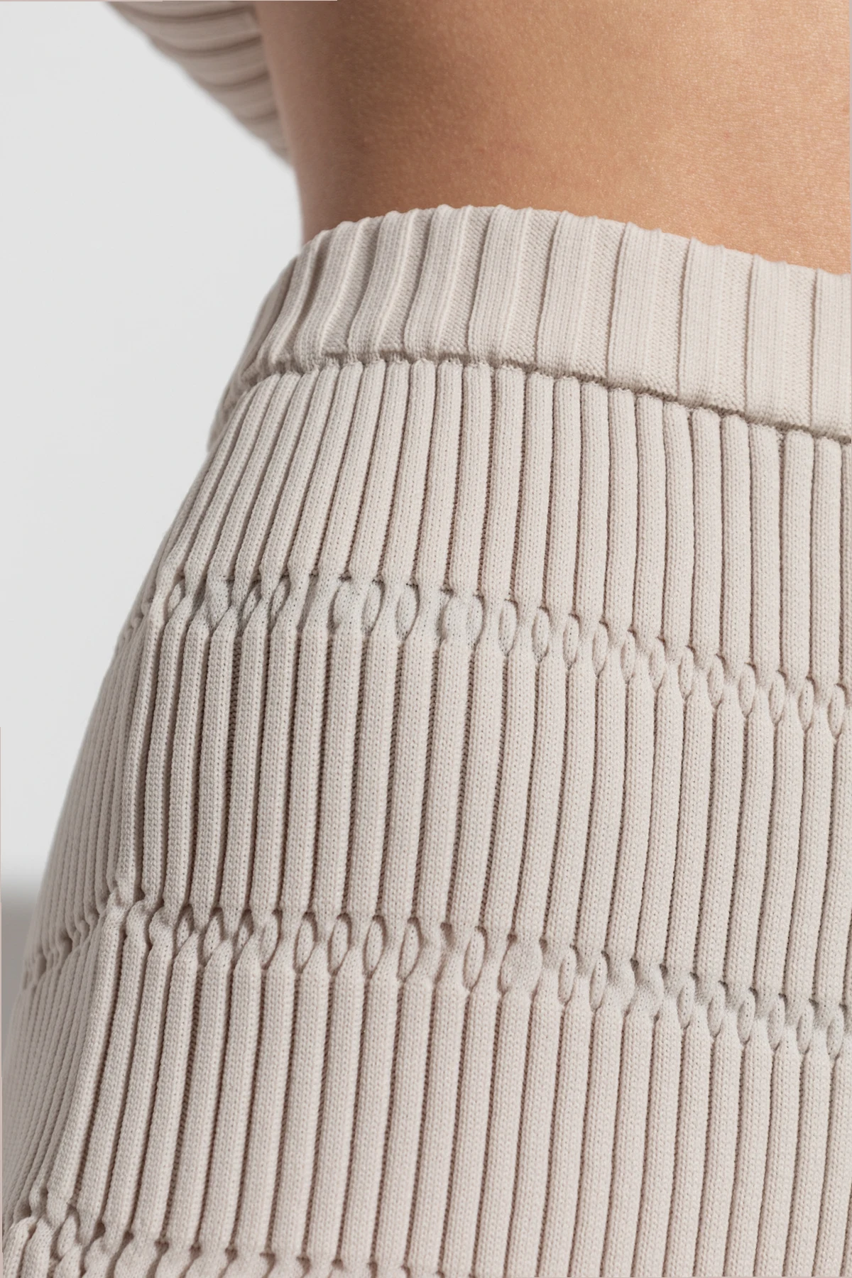 Spódnica jest minimalistyczna, bez widocznych napisów czy logo, co podkreśla jej elegancki styl. W pasie znajduje się guma, co zapewnia idealne dopasowanie do sylwetki. Na zdjęciach produkt zestawiony jest z dopasowanym swetrem o podobnej teksturze i kolorze, tworząc harmonijną stylizację.