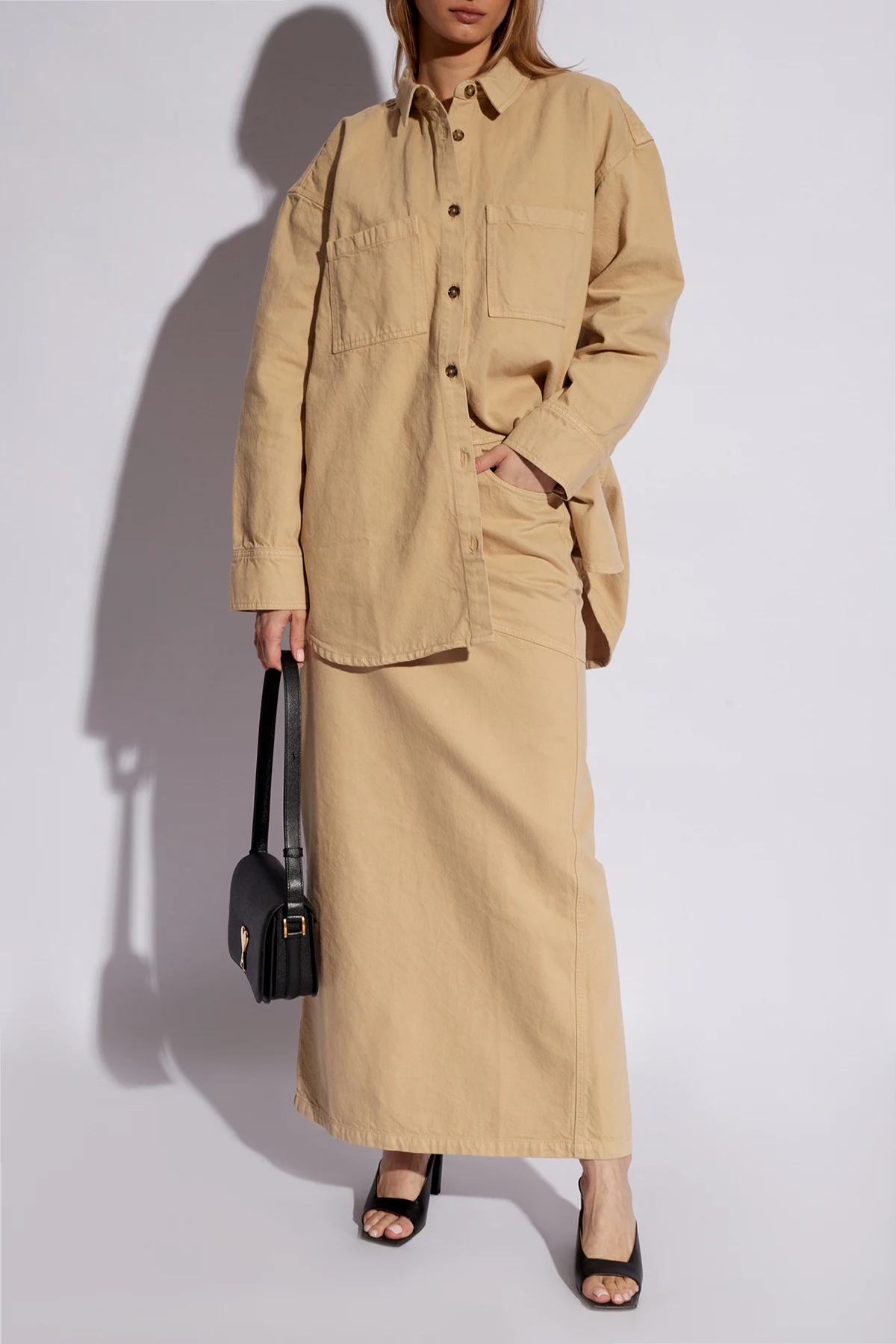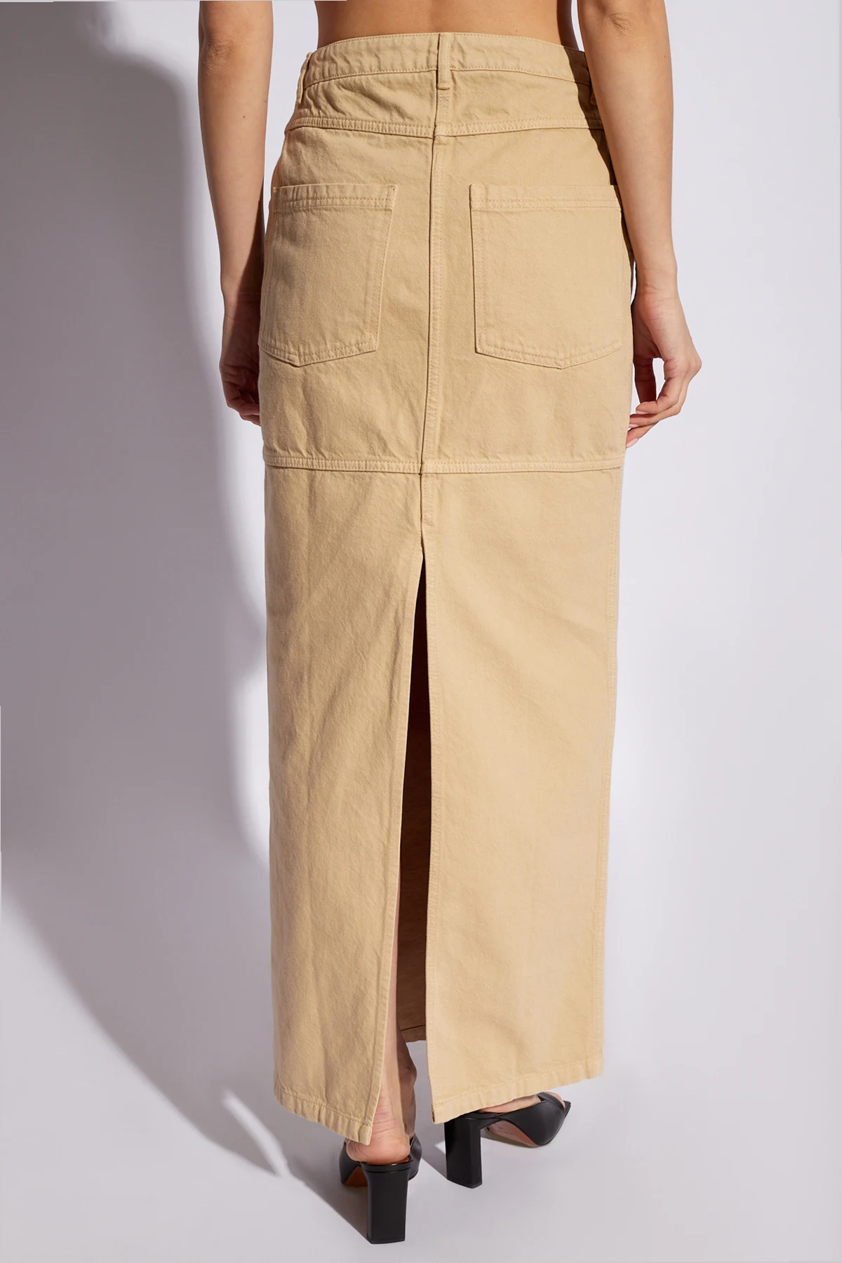 – Jasnobeżowa spódnica maxi marszczona w talii
