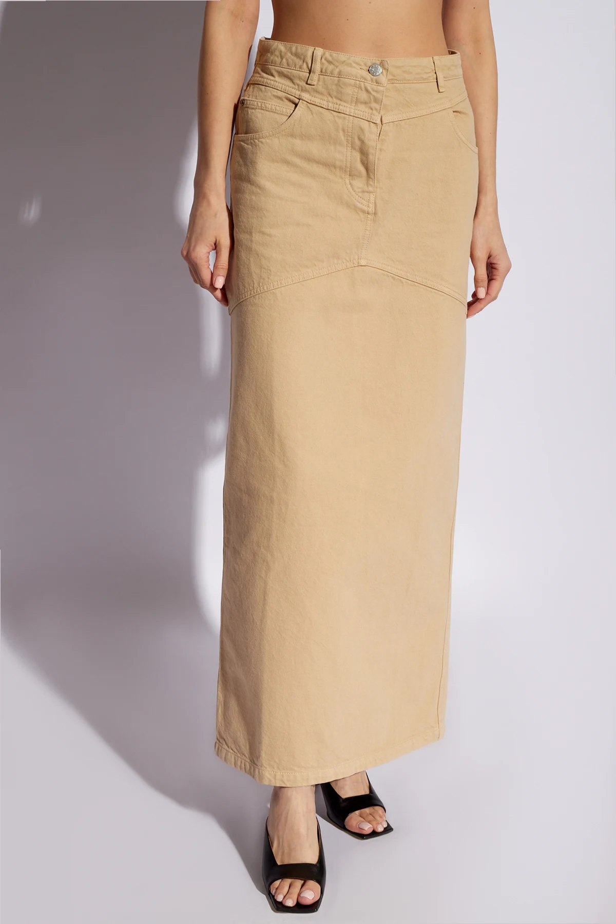 Beżowa spódnica, model ‘Nikita’ HERSKIND. Wykonana z bawełny z certyfikatem OEKO-TEX. Zapinana na guziki. Pięć wsuwanych kieszeni. Prosty krój.