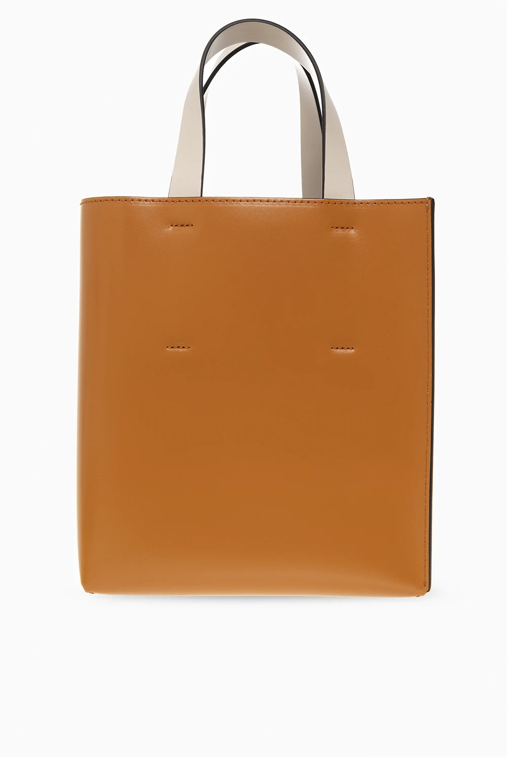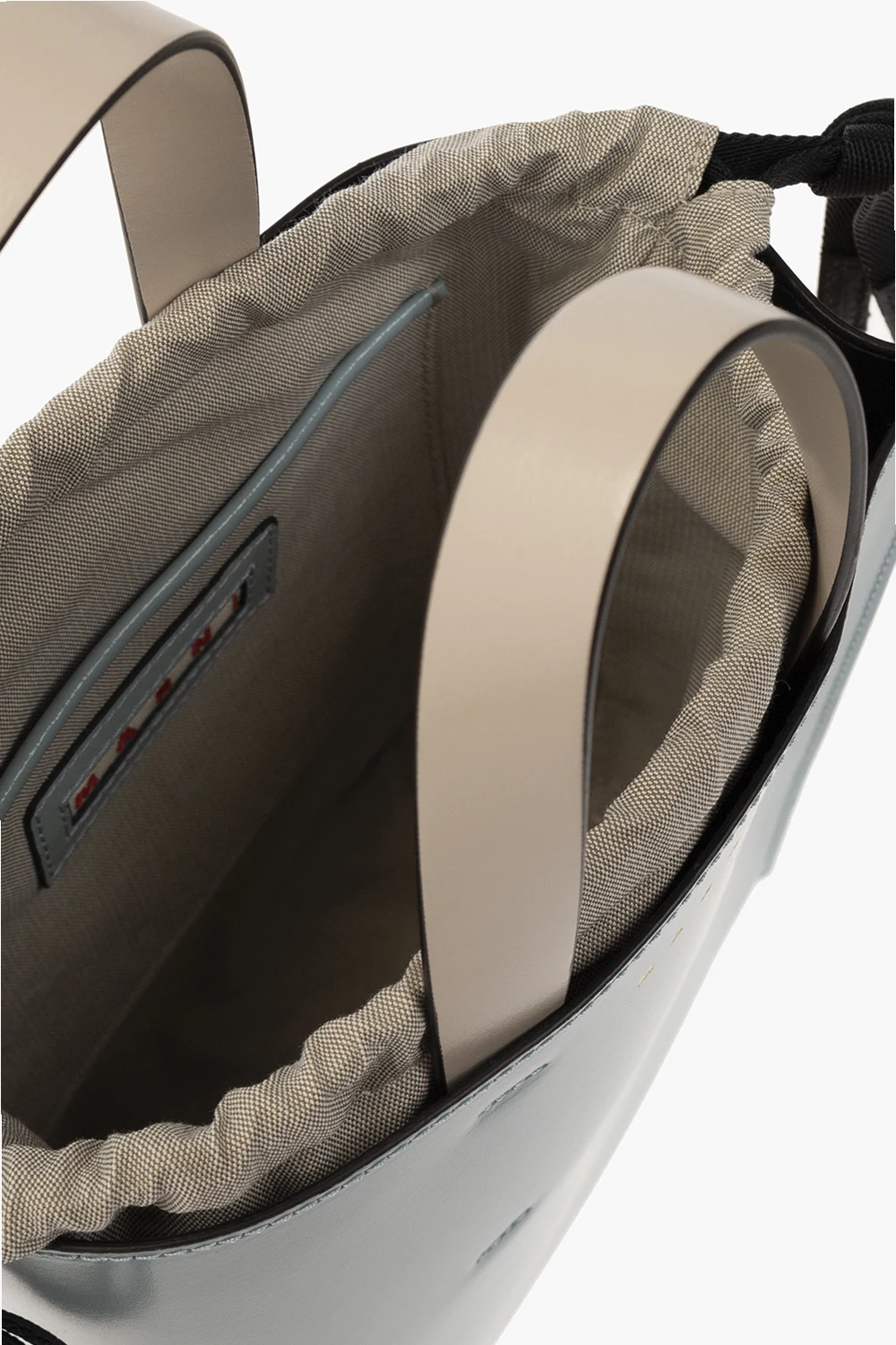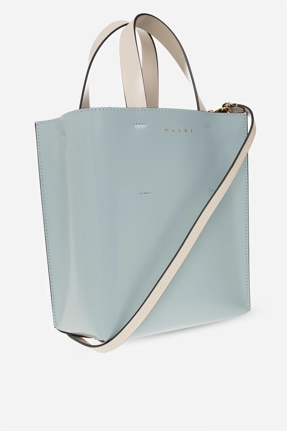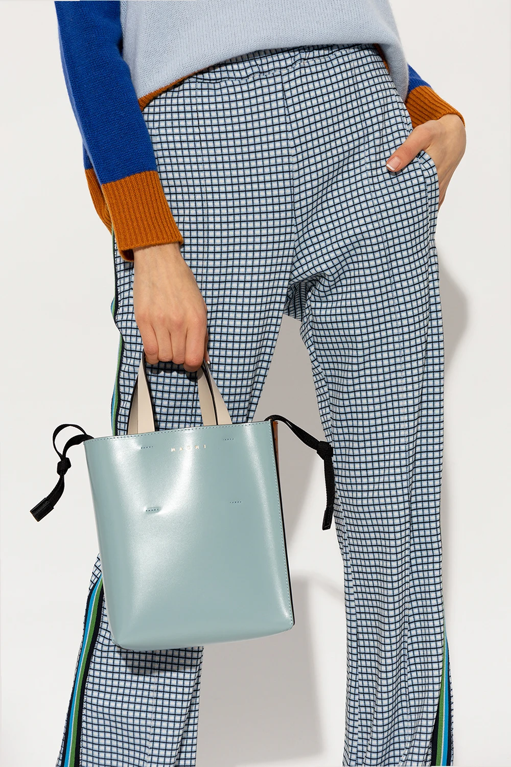 Niebiesko-pomarańczowa torba na ramię, model 'Museo Mini' Marni. Wykonana ze skóry cielęcej. Ozdobiona nadrukowanym wzorem z logo. Dwie półokrągłe rączki. Pas na ramię. Wewnątrz komora oraz wsuwana kieszeń. Metalowe wykończenie w kolorze złotym.