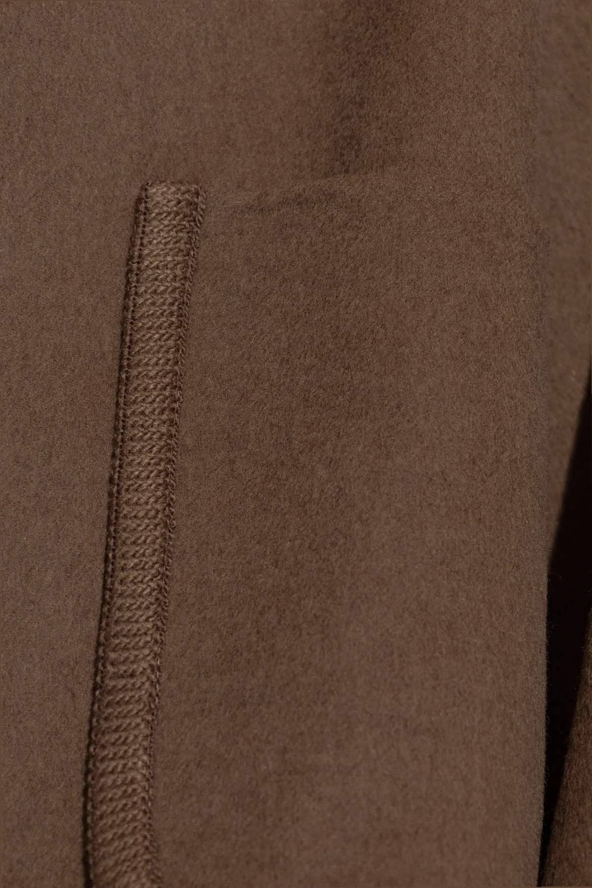 Brązowa barwa, głęboka i nasycona, podkreśla naturalną teksturę wełnianej tkaniny, dodając kurtce szlachetności. Brak tradycyjnego zapięcia akcentuje jej otwarty, swobodny charakter. Dwie duże, płaskie kieszenie na wysokości talii nie tylko zwiększają jej funkcjonalność, ale również wzbogacają estetyczny wygląd. Dopracowane w każdym szczególe, od delikatnego ściągacza na dolnej krawędzi, po starannie wykonane szwy, świadczą o mistrzowskiej kunszcie projektanta.