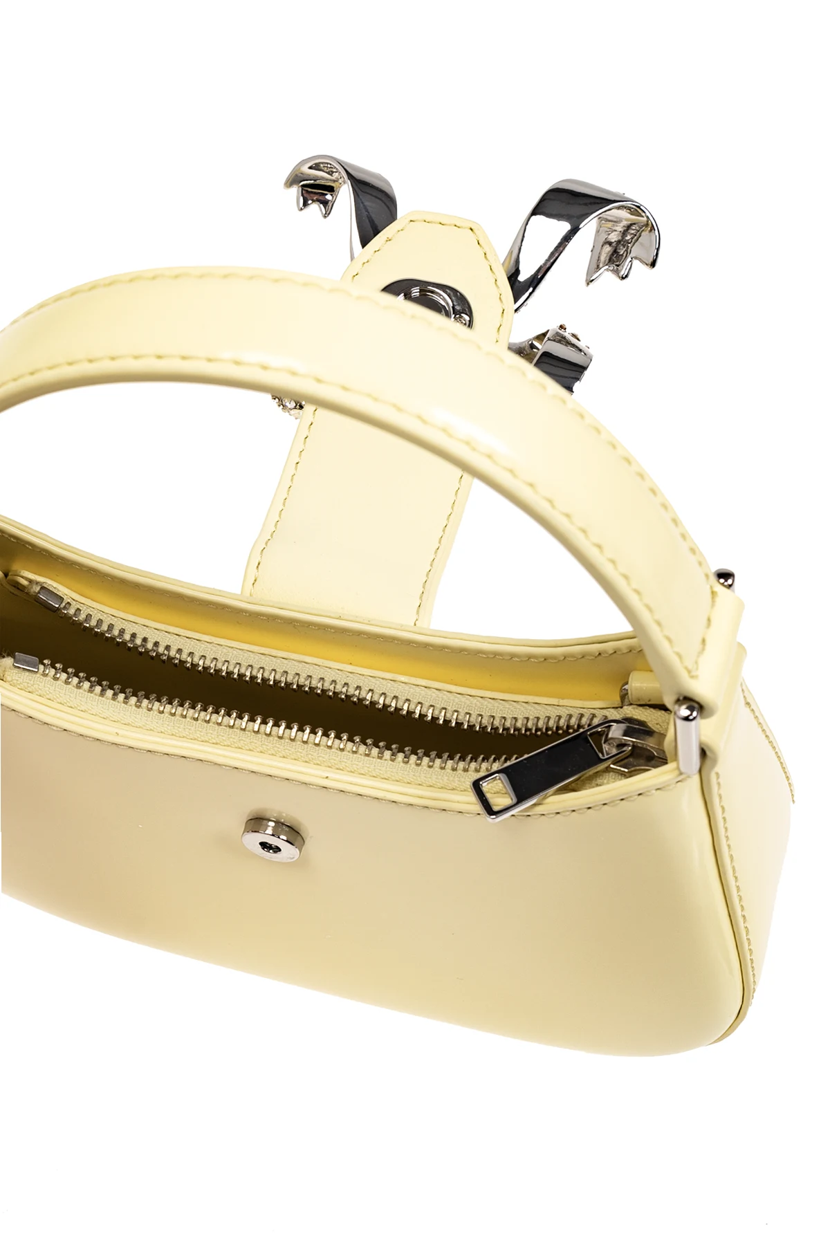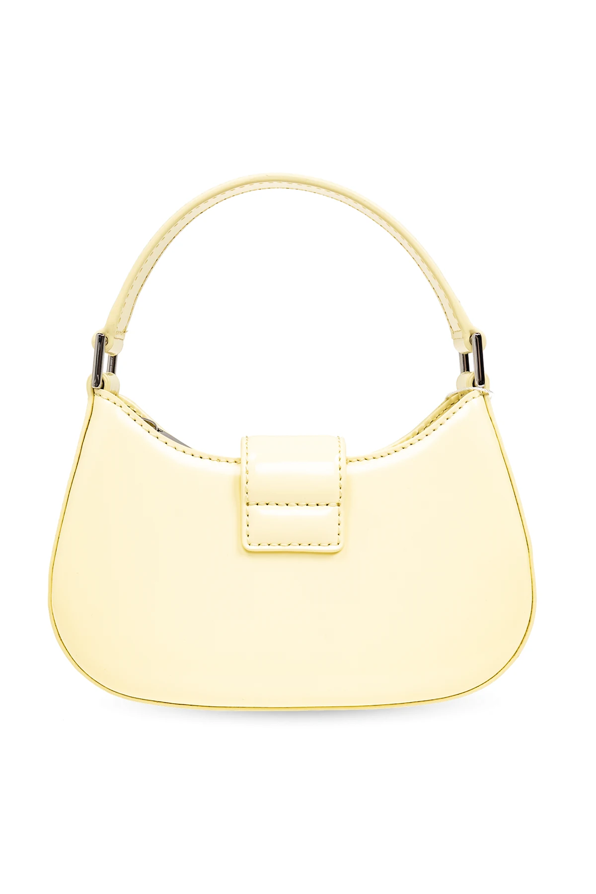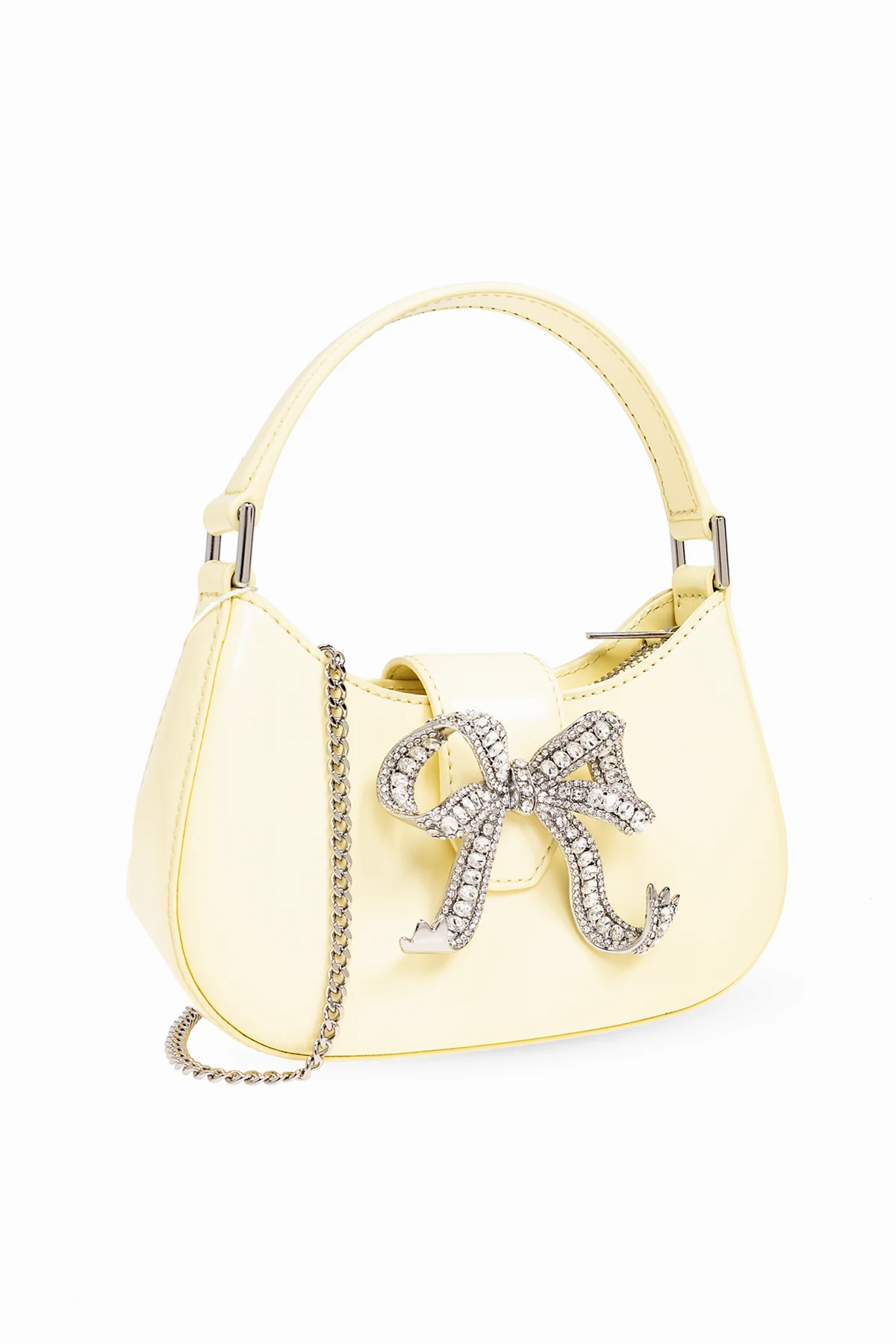 Zachwycająca, jasnożółta torba na ramię ‘Bow’ od Self Portrait jest ucieleśnieniem luksusu i wyrafinowanego gustu. Jej półokrągły kształt z delikatnie zakrzywioną górną krawędzią i spłaszczonym dnem sprawia, że produkt wyróżnia się na tle standardowych akcesoriów. Dominujący pastelowy odcień żółtego, połączony z charakterystyczną, centralnie umieszczoną, metalową aplikacją w kształcie kokardy, wysadzaną połyskującymi kryształami, nadaje torbie niepowtarzalnego charakteru.