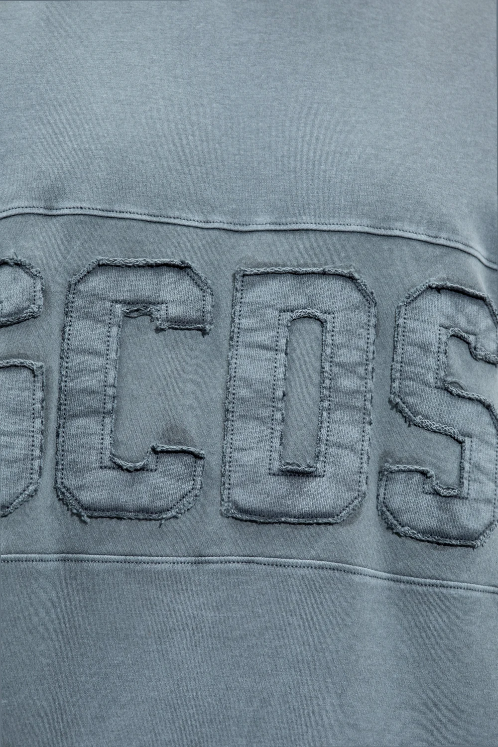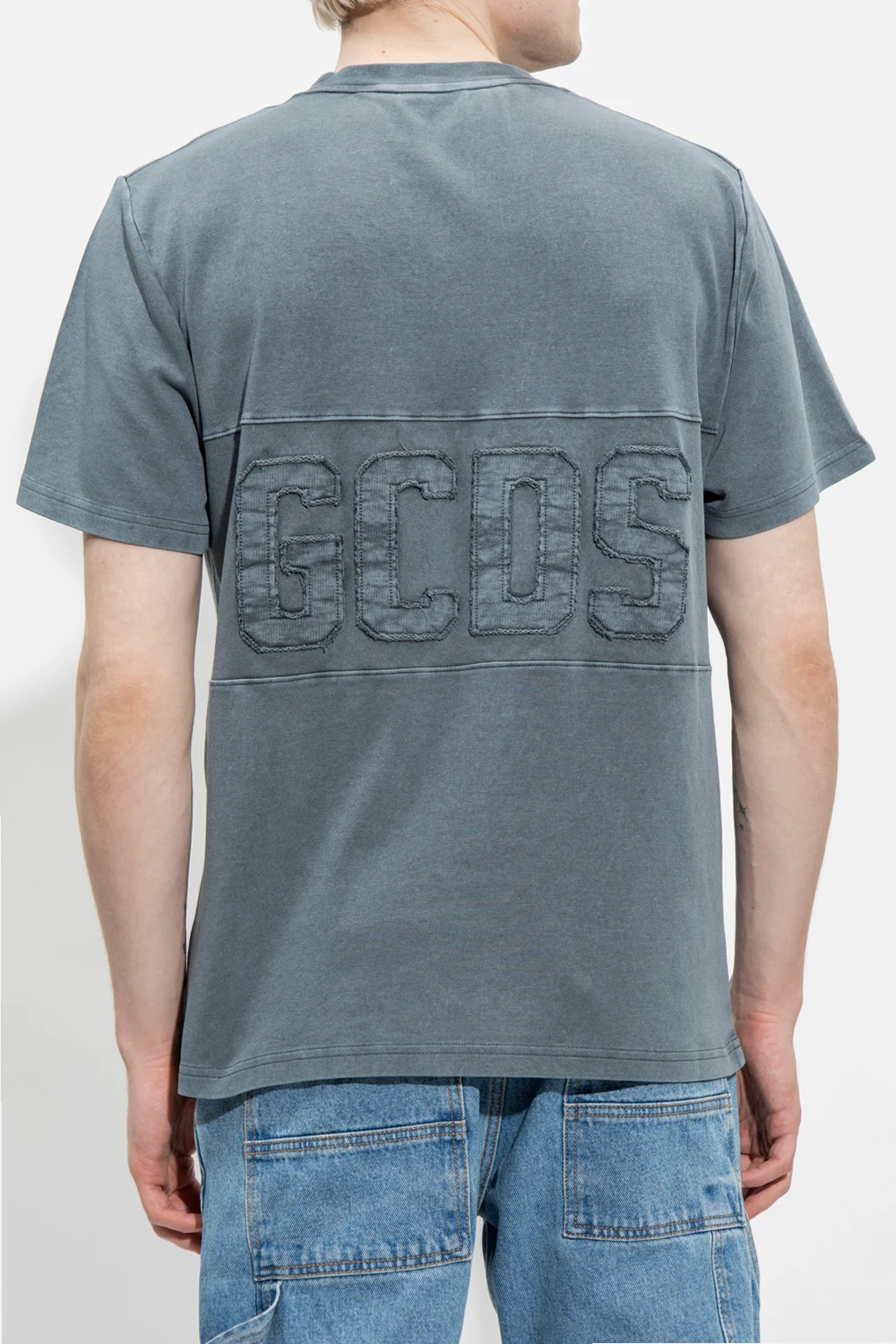Ciemnoniebieski t-shirt GCDS. Wykonany z bawełny. Ozdobiony naszywką z logo z surowym wykończeniem. Okrągły dekolt wykończony ściągaczem. Krótkie rękawy.