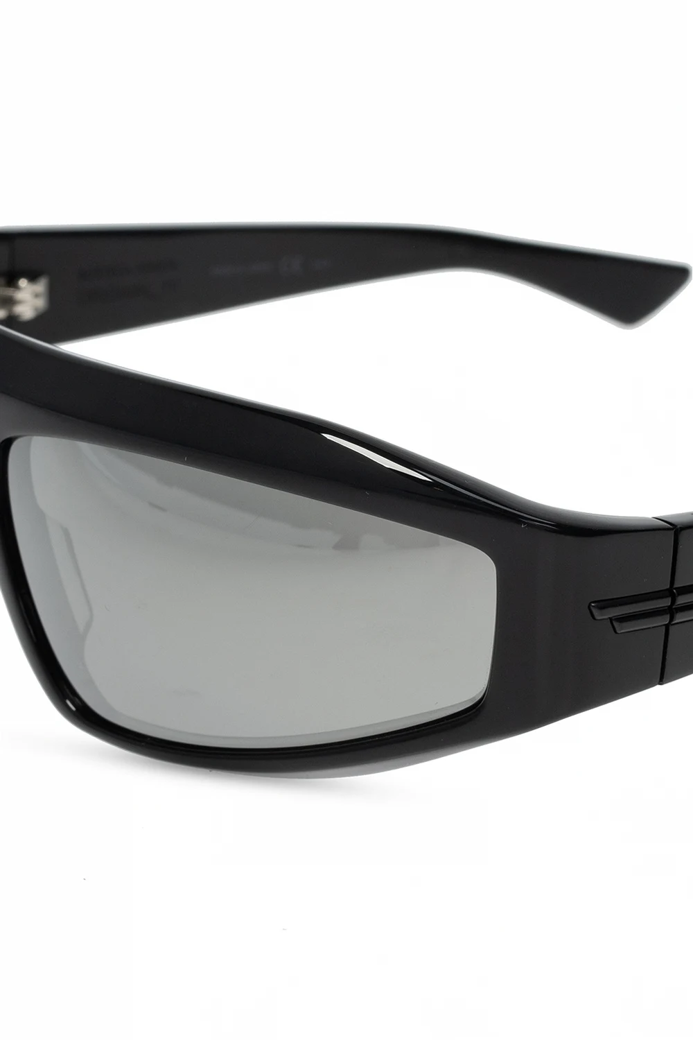 Czarne okulary przeciwsłoneczne Bottega Veneta. Zauszniki ozdobione dekoracyjnymi elementami w kolorze czarnym oraz wytłoczonym logo w kolorze srebrnym. Szare, certyfikowane soczewki UVA/UVB.