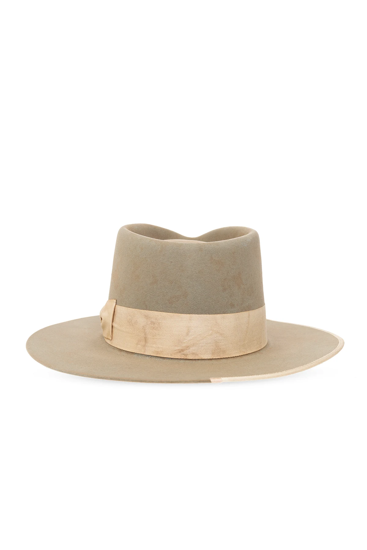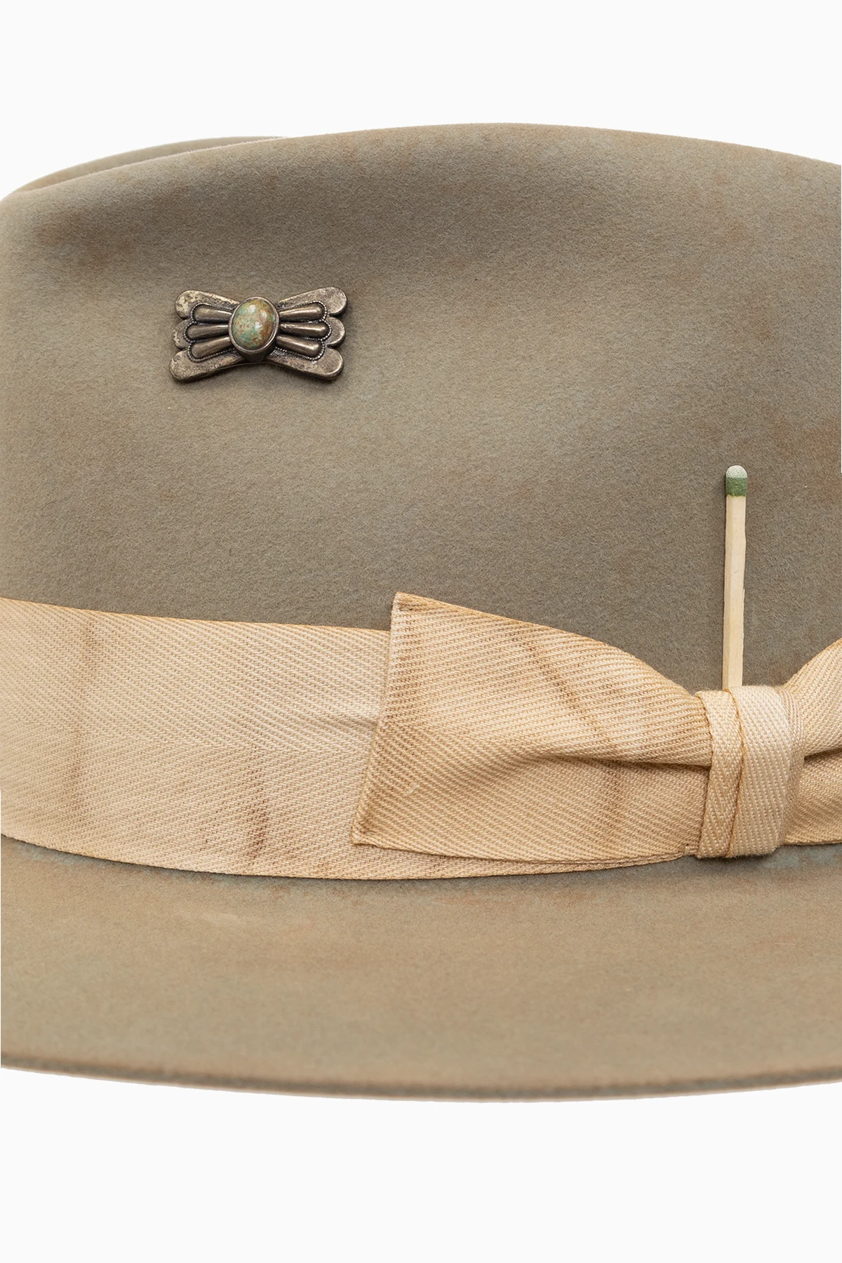Zielony kapelusz typu ‘fedora’, model ‘682’ Nick Fouquet. Wykonany z filcu. Ozdobiony beżowym paskiem z kokardą oraz zapałką.