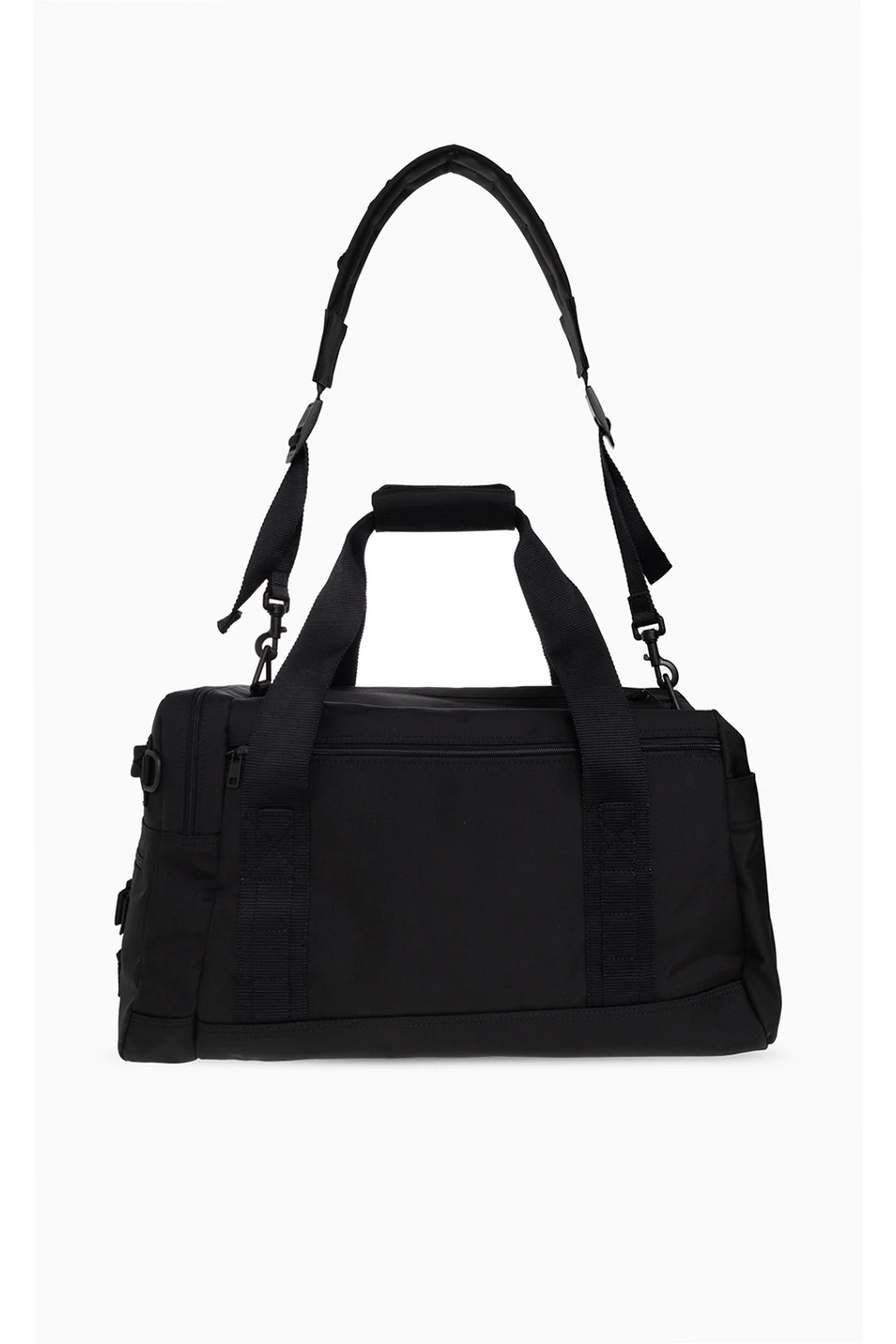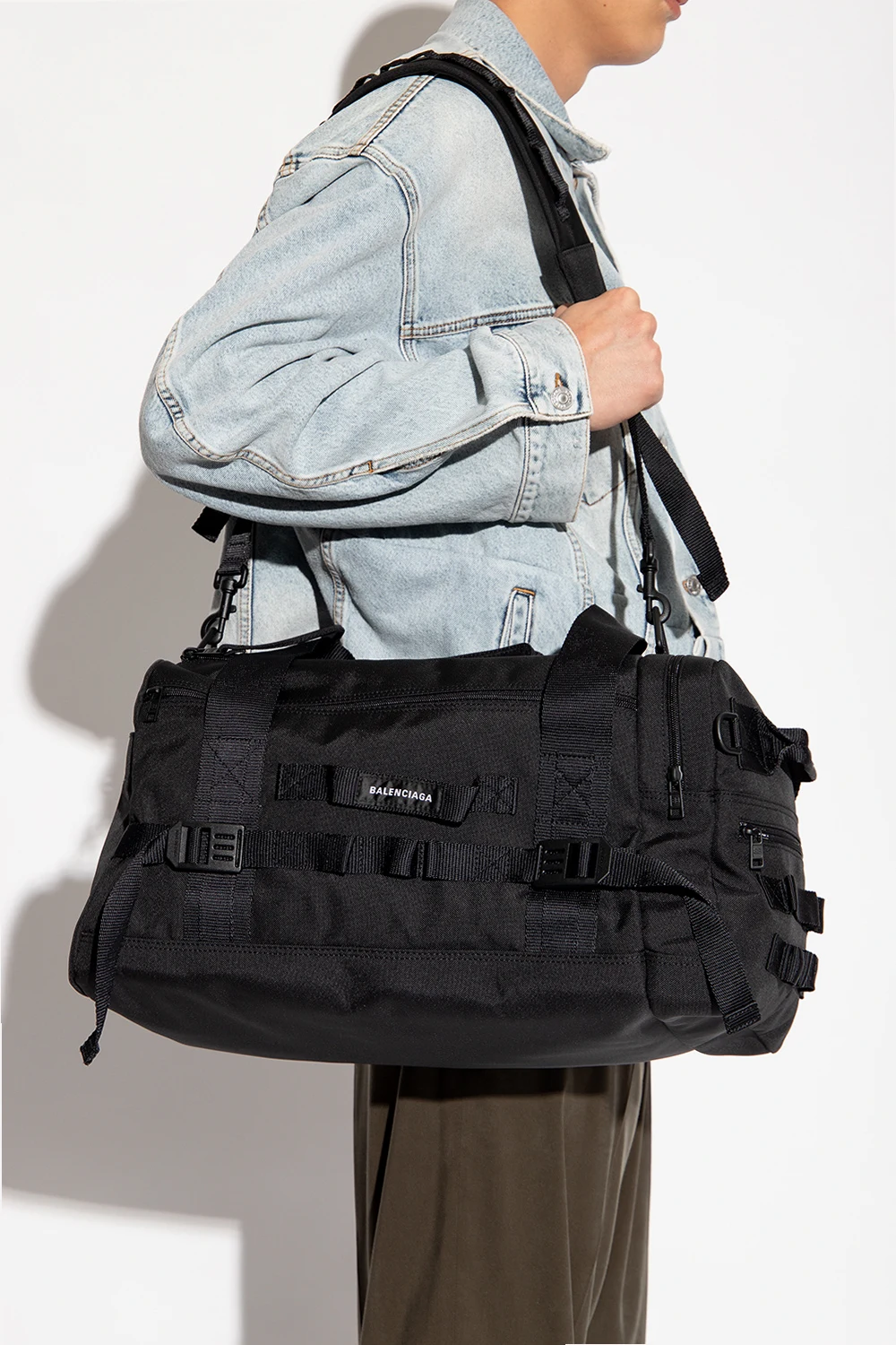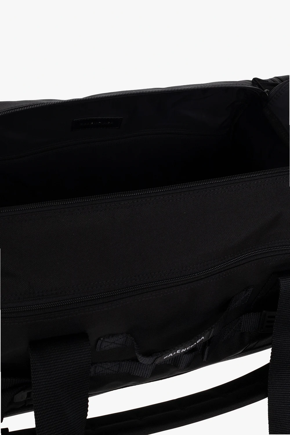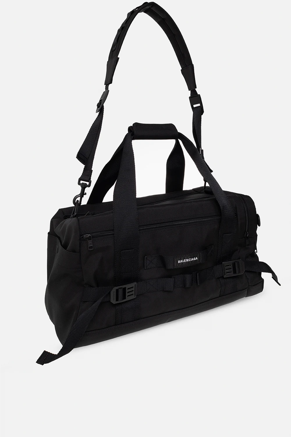 Czarna torba podręczna Balenciaga. Zamykana na dwa zamki. Ozdobiona naszywką z logo. Dekoracyjne paski z klamrami. Liczne kieszenie. Dwie półokrągłe rączki. Odpinany, regulowany pasek. Wewnątrz komora i kieszeń zamykana na zamek.