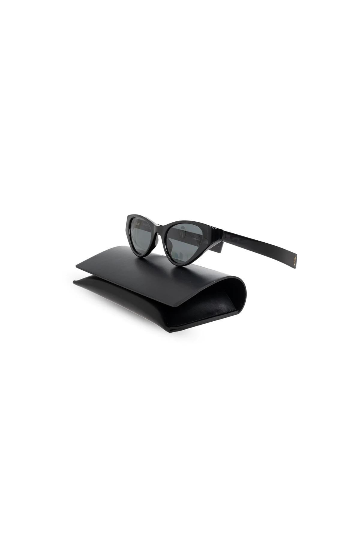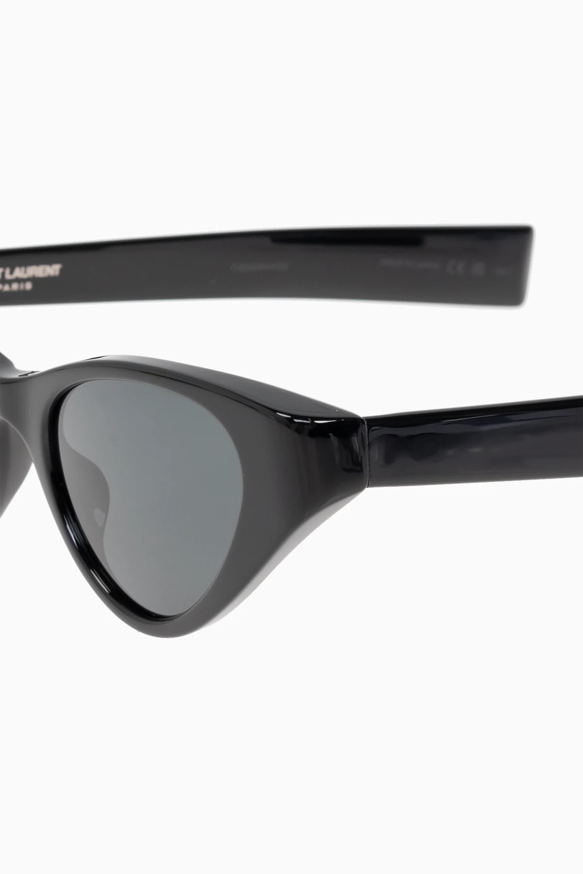 Soczewki są ciemne, co zapewnia skuteczną ochronę przed słońcem, w tym 100% ochrony przed promieniami UVA/UVB. Na wewnętrznej stronie zauszników znajduje się subtelne logo marki "Saint Laurent Paris", a całość jest dopełniona eleganckim, czarnym etui, które podkreśla luksusowy charakter produktu.