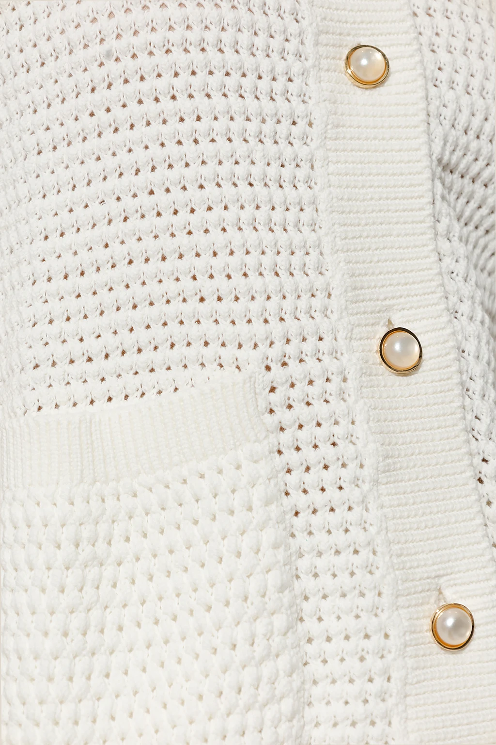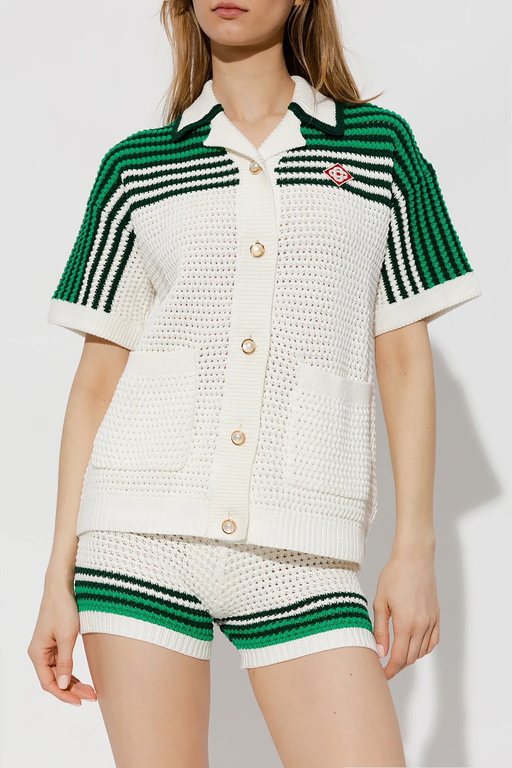 Biało-zielona koszula Casablanca. Wykonana z bawełnianej dzianiny o ażurowym splocie. Zapinana na guziki z perłowym wykończeniem. Ozdobiona wzorem w pasy oraz naszywką z logo w kolorze czerwonym. Dwie wsuwane kieszenie. Krótkie rękawy oraz dół wykończone ściągaczem.