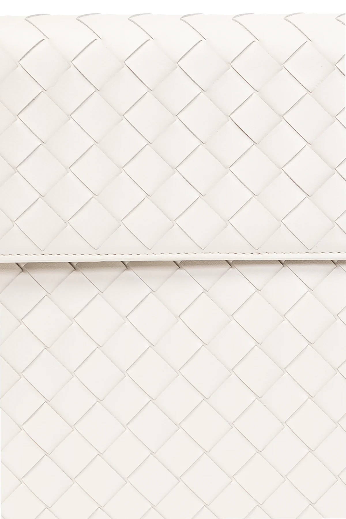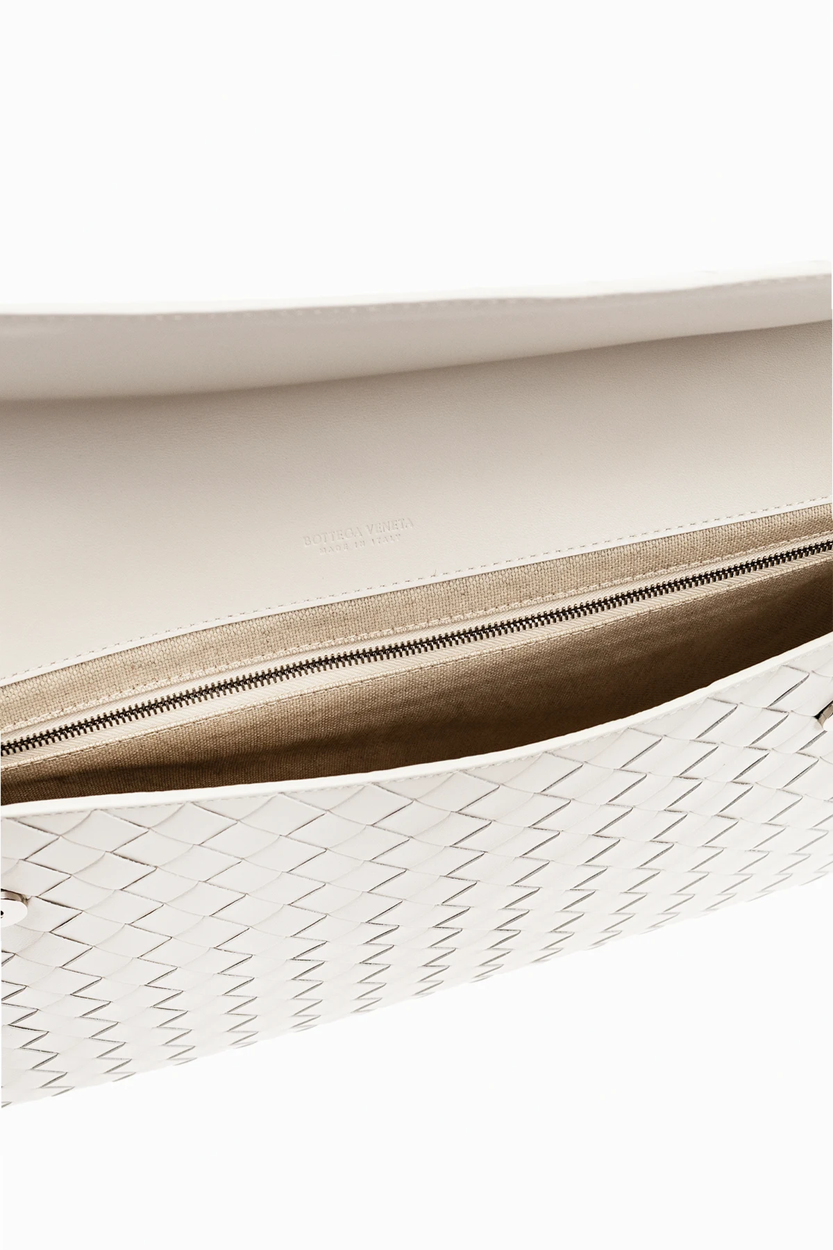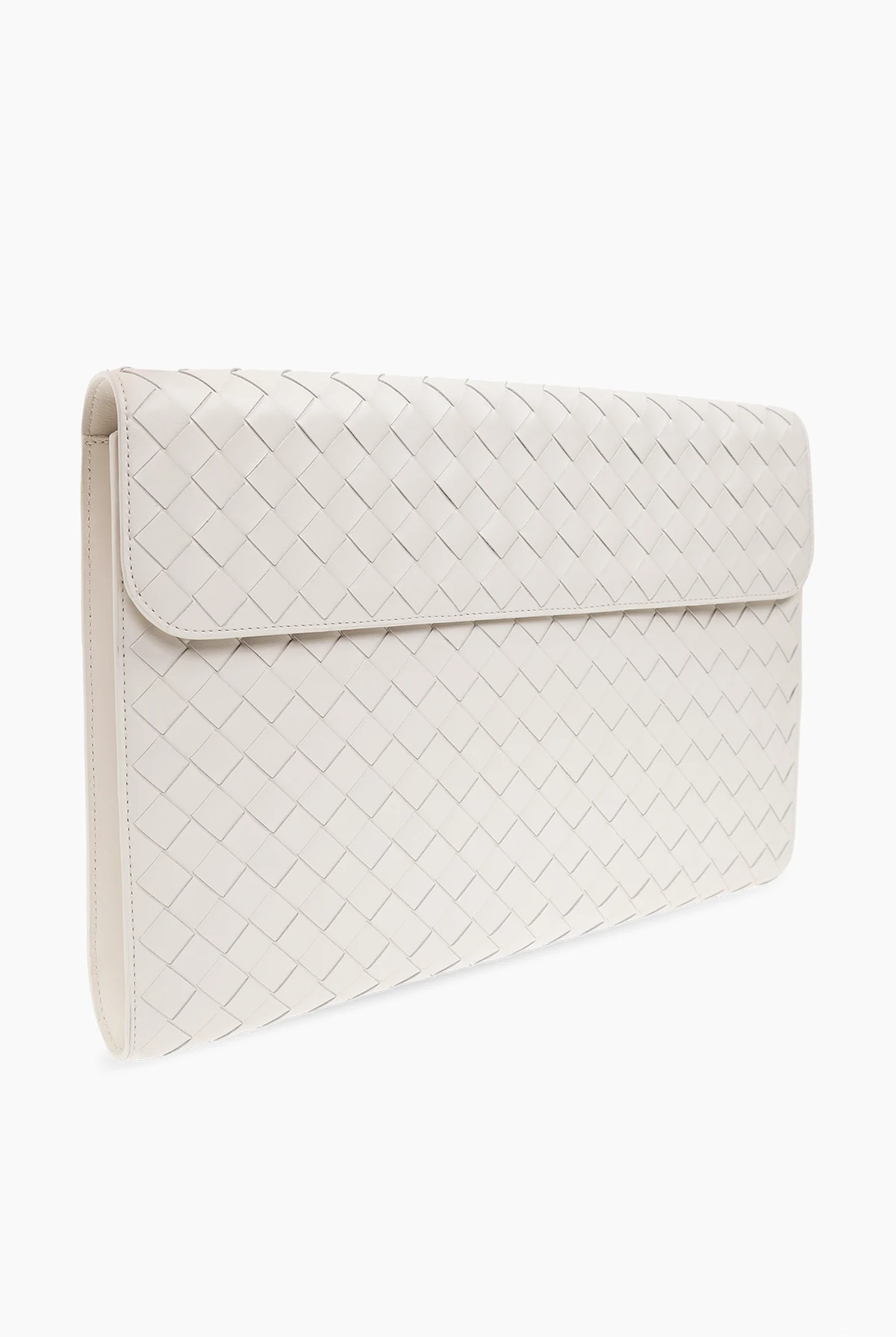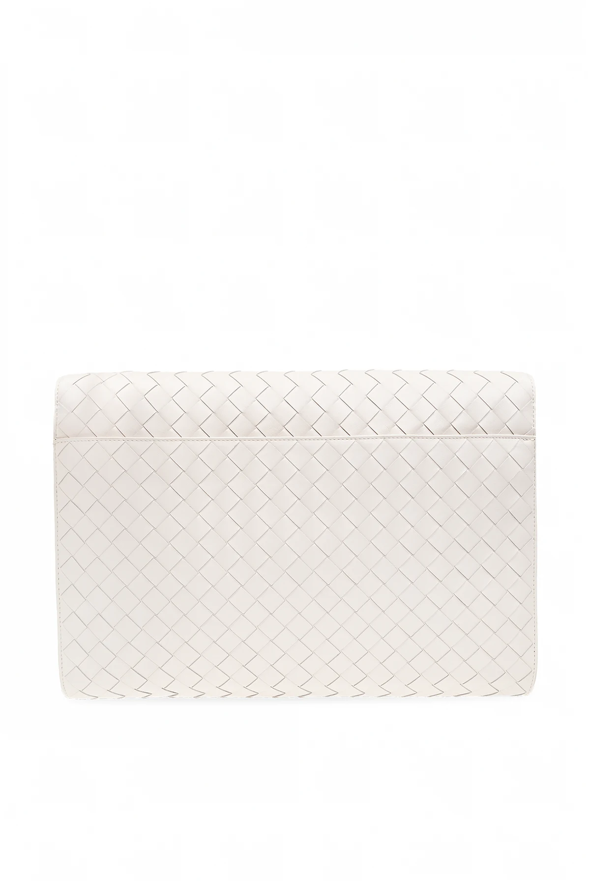 Biała aktówka, model ‘Avenue Large’ Bottega Veneta. Wykonana ze skóry. Klapa zamykana na magnetyczne zatrzaski. Ozdobiona charakterystyczną plecionką ‘Intrecciato’. Z tyłu wsuwana kieszeń. Wewnątrz komora i kieszeń zamykana na zamek. Metalowe elementy w kolorze srebrnym.