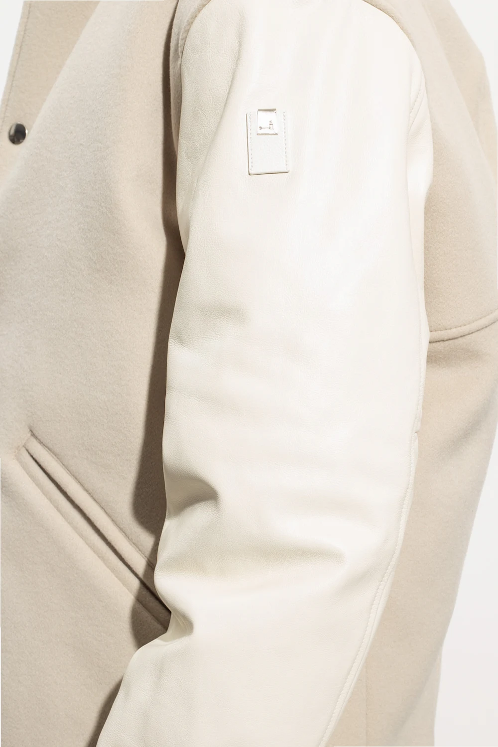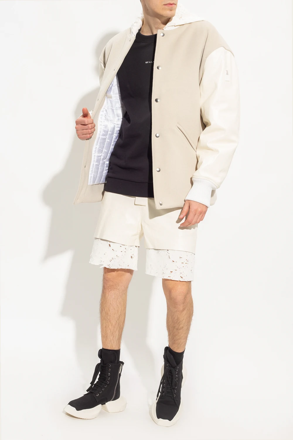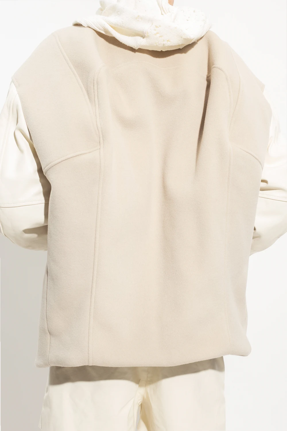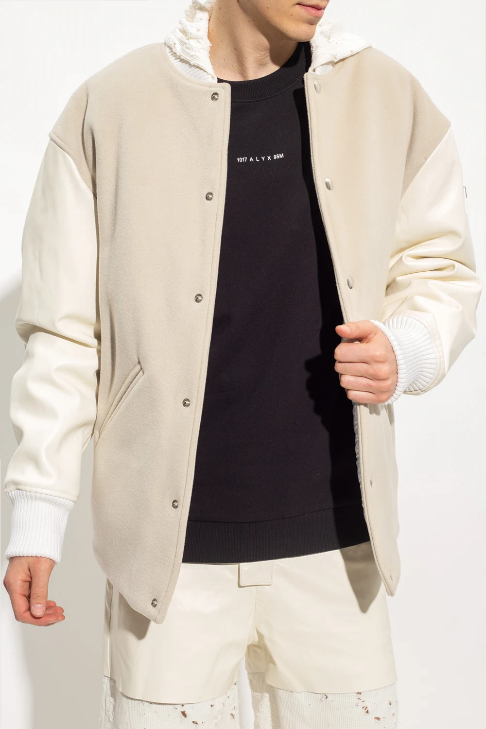Beżowo-kremowa ocieplana kurtka z kapturem 1017 ALYX 9SM. Wykonana z mieszanki wełny. Zapinana na zatrzaski. Bawełniany kaptur z efektem ‘vintage’. Kremowe, skórzane rękawy ozdobione charakterystyczną dla marki, metalową aplikacją ‘Lightercap’ w kolorze srebrnym. Kołnierz oraz rękawy zakończone ściągaczem.
