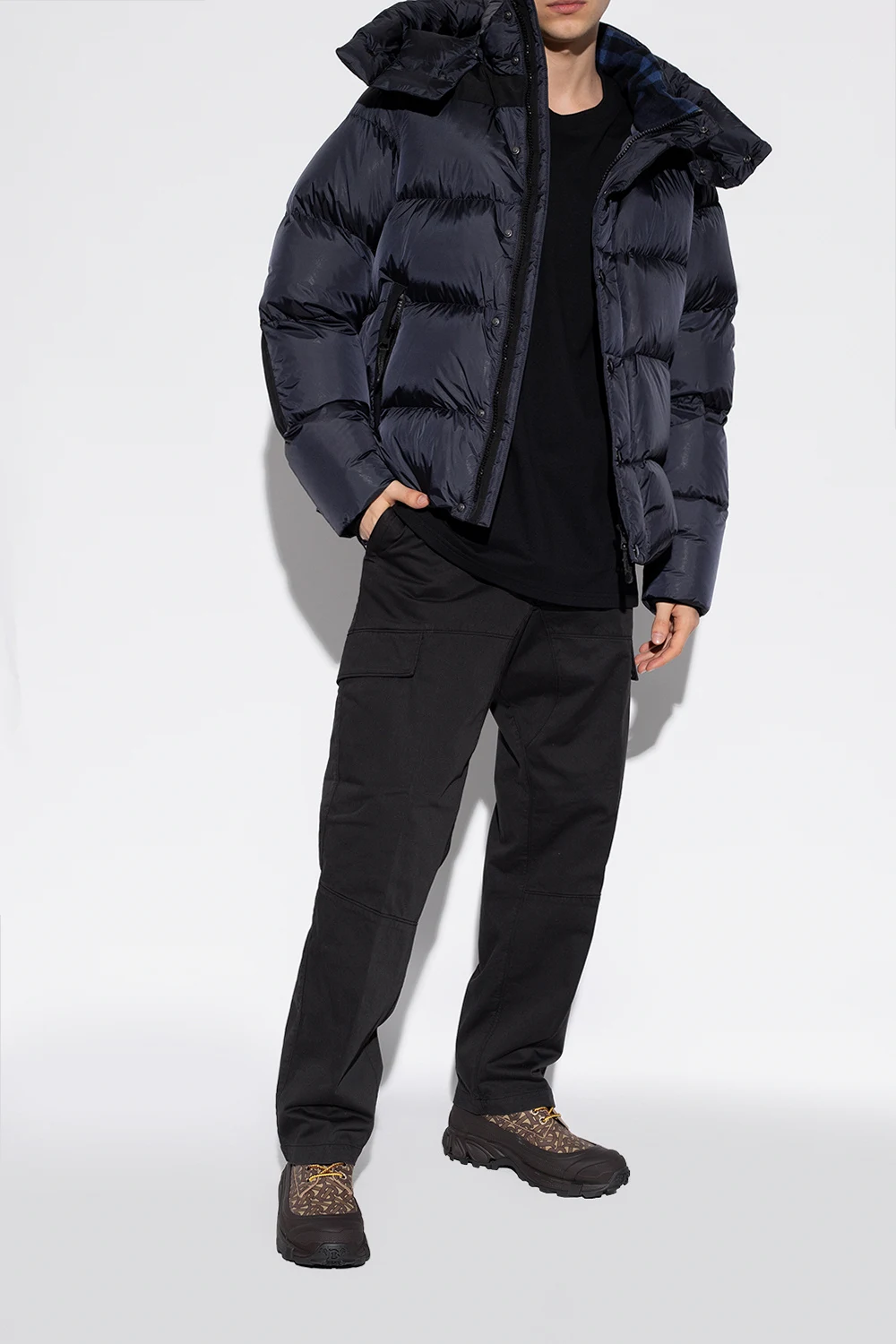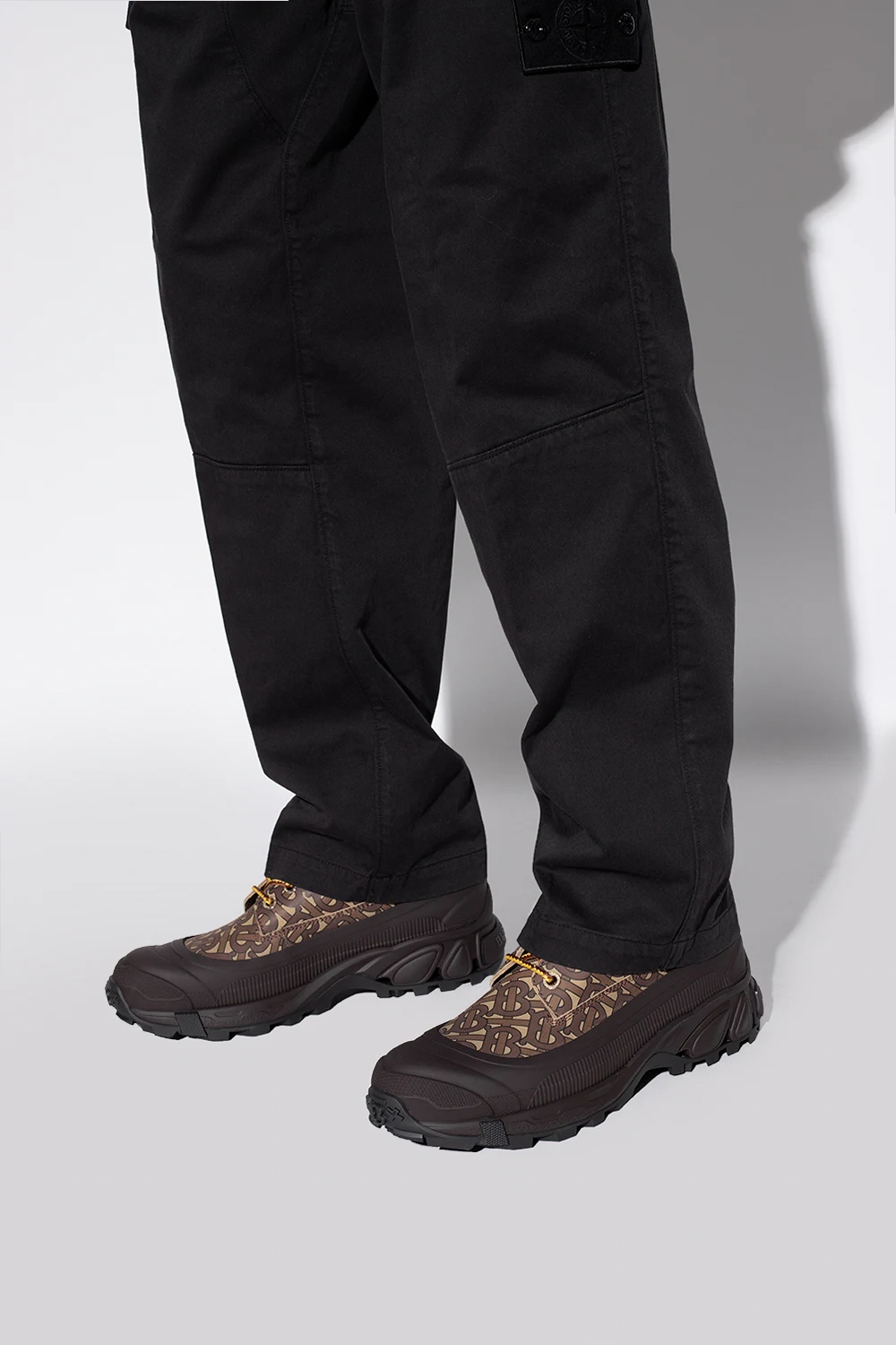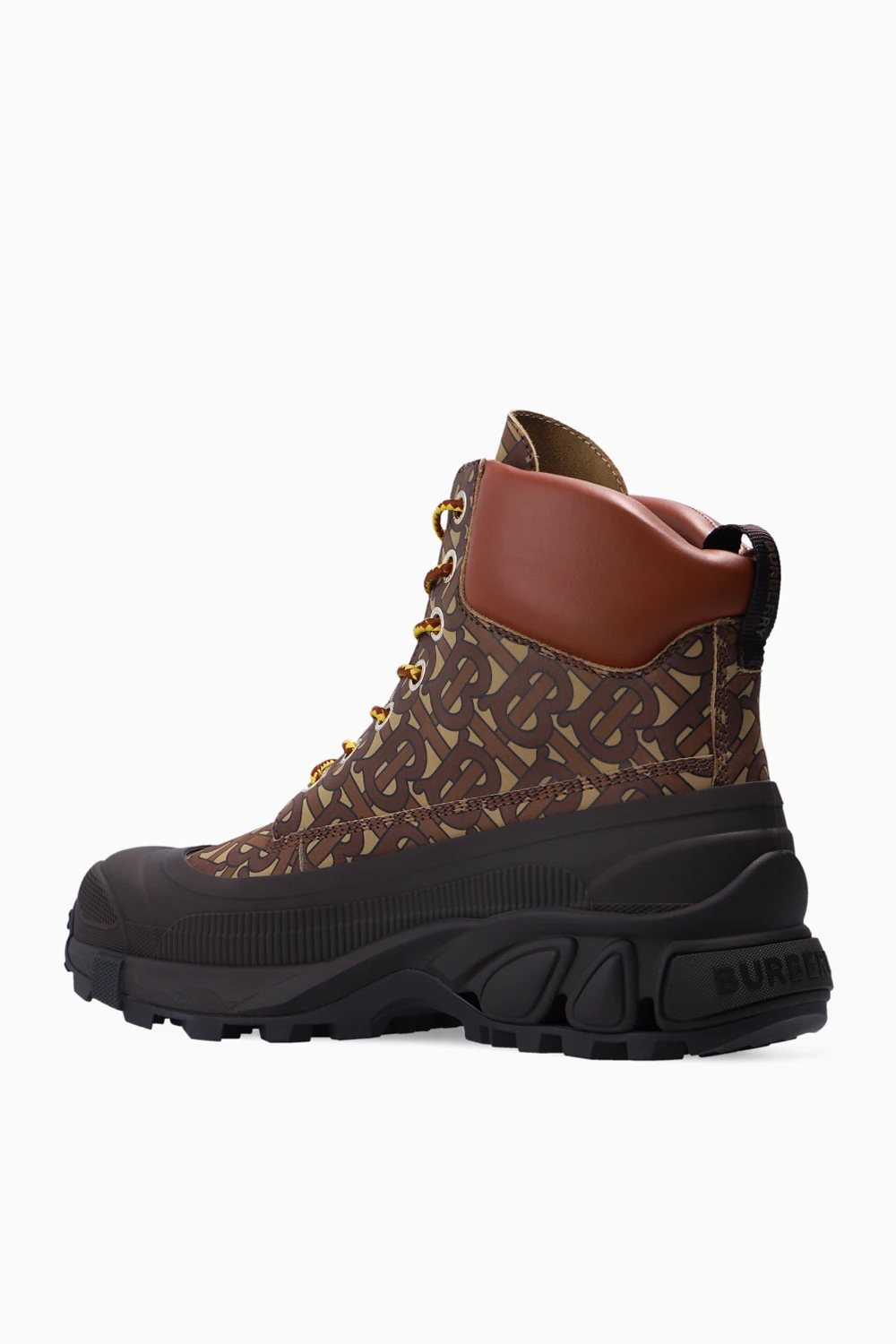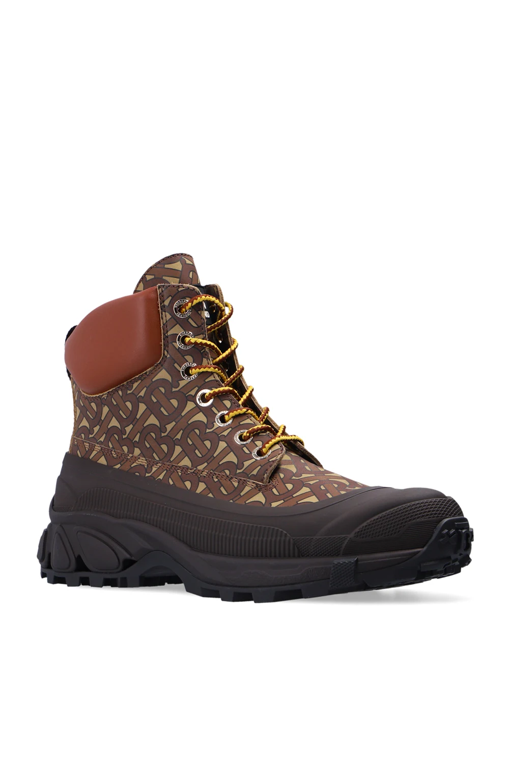 Brązowo-beżowe, sznurowane buty za kostkę Burberry. Wykonane ze skóry. Z tyłu wypukłe logo. Ozdobione wzorem z logo. Czarna, gumowa podeszwa.