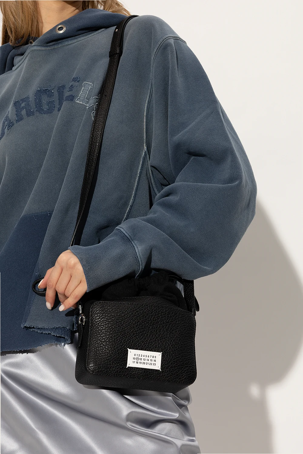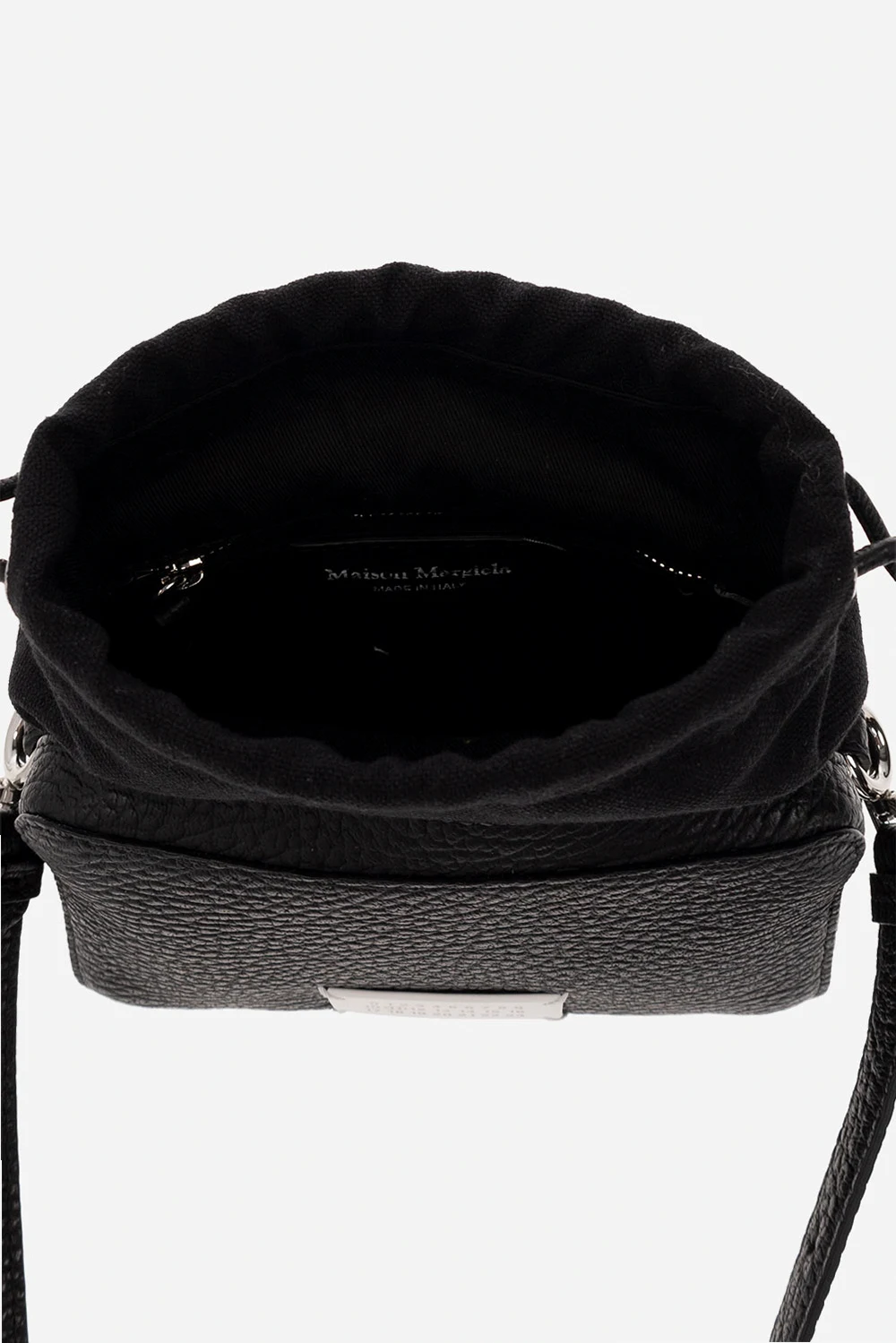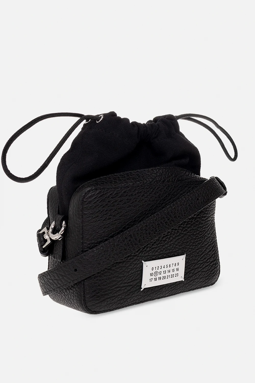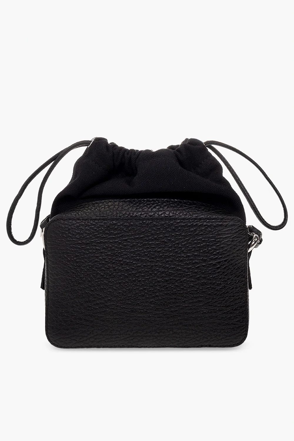 Czarna torba na ramię, model ' 5AC' Maison Margiela. Wykonana z cielęcej skóry i bawełny. Ściągana trokami. Z przodu ozdobiona białą naszywką z logo. Odpinany pasek na ramię z możliwością regulacji długości. Wewnątrz komora i kieszeń zamykana na zamek. Metalowe elementy w kolorze srebrnym.