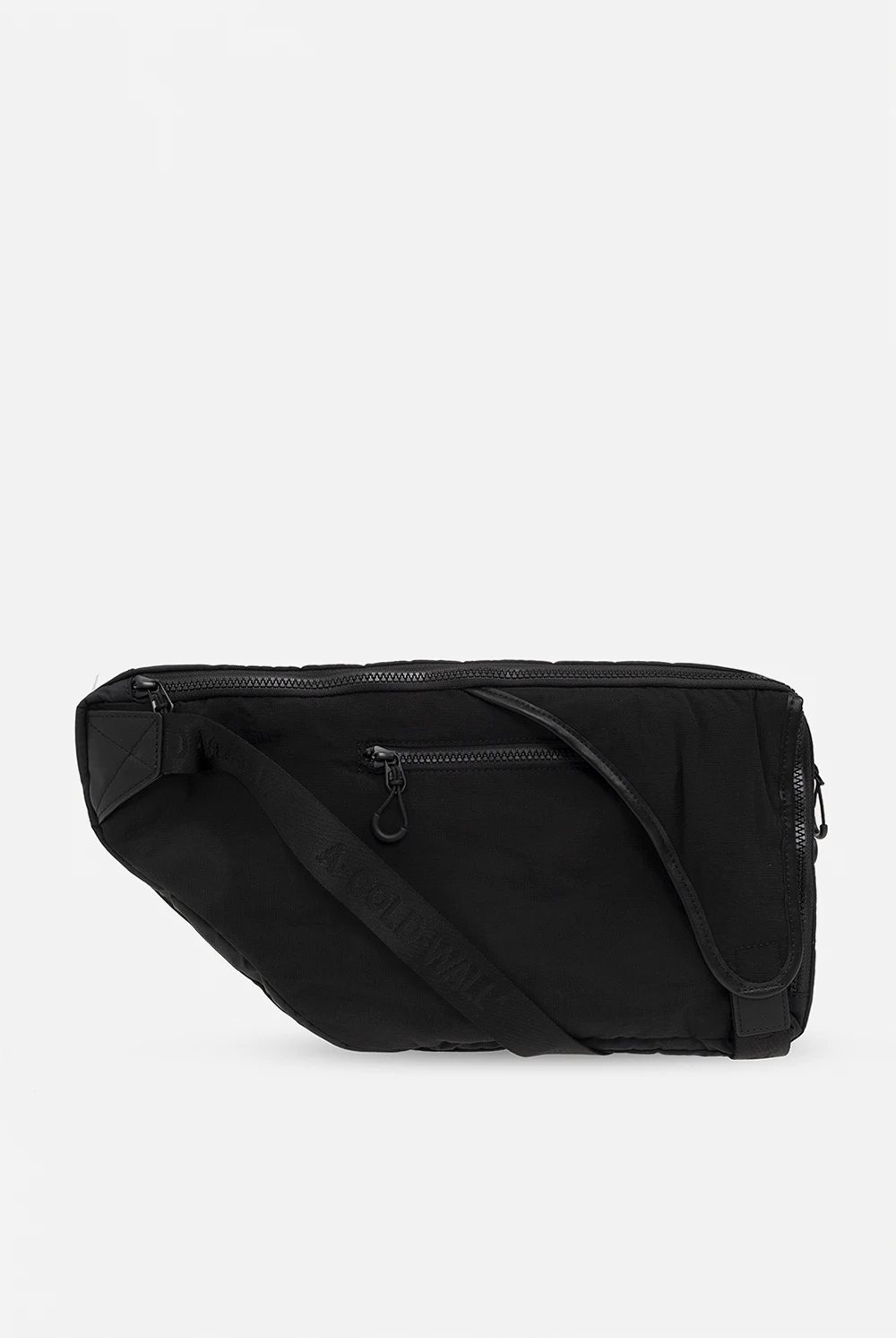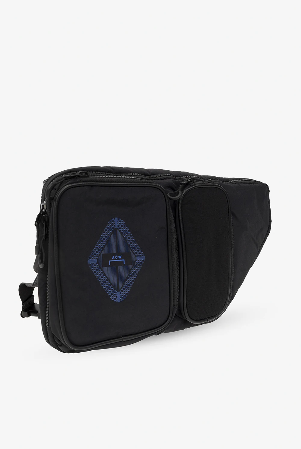 Czarny plecak na ramię A-COLD-WALL*. Zamykany na zamek. Ozdobiony niebieskim nadrukiem z logo. Pas na ramię z możliwością regulacji długości. Z przodu dwie kieszenie zamykane na zamek. Wewnątrz komora. Metalowe wykończenie w kolorze czarnym.