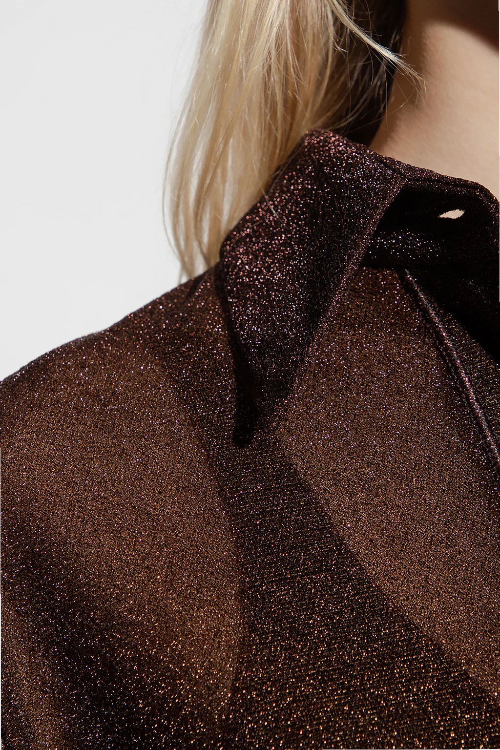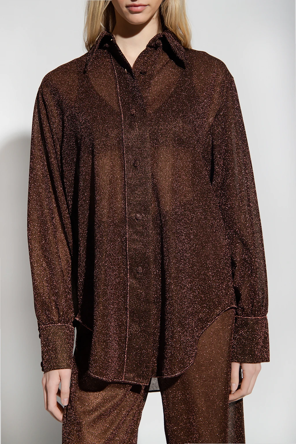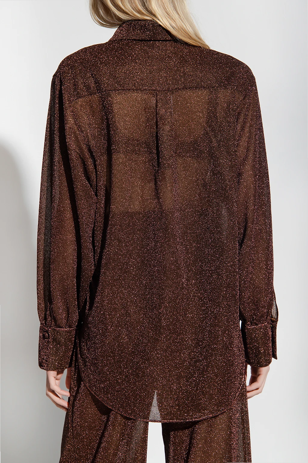 Brązowa koszula Oseree. Zapinana na guziki. Długie rękawy wykończone mankietami z zapięciem na guzik. Brokatowe wykończenie.
