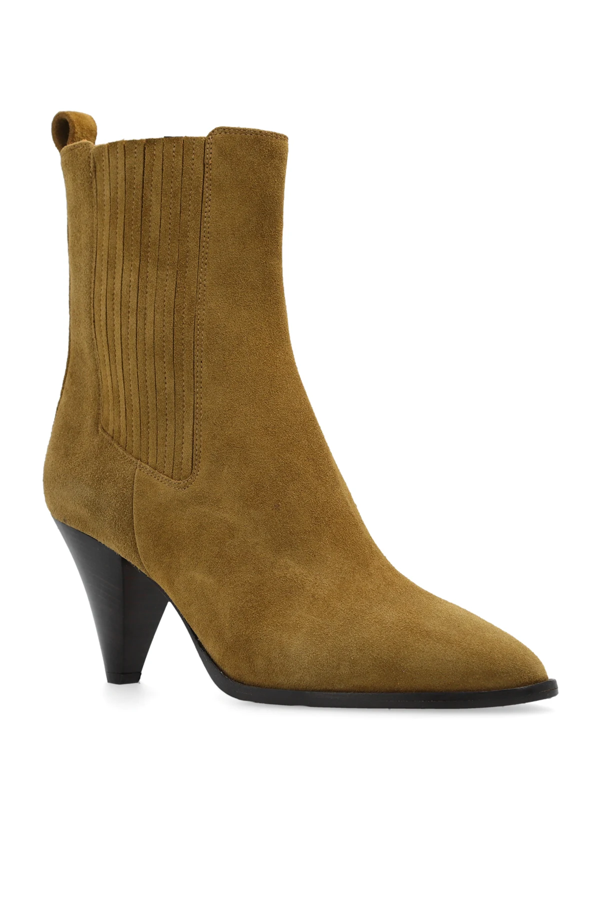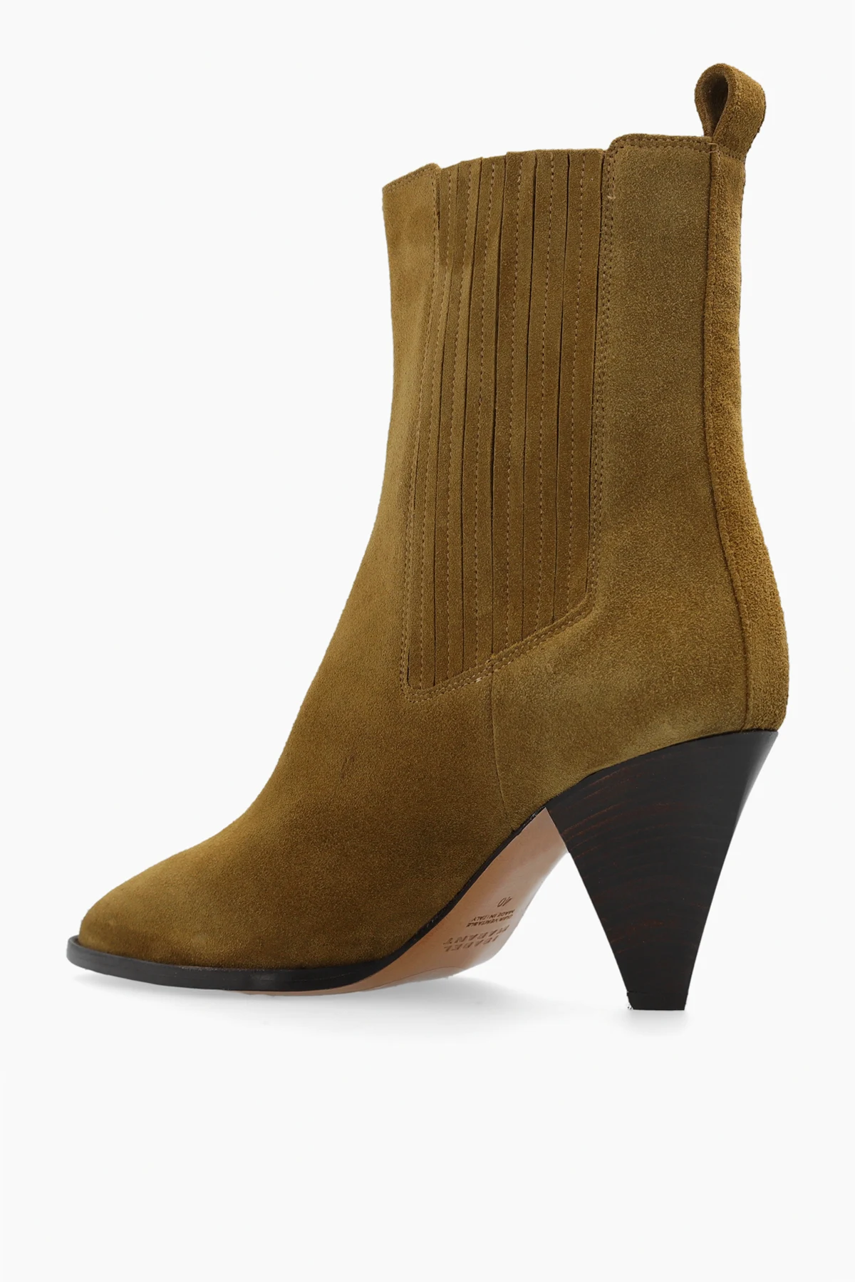 Brązowe botki na obcasie, model ‘Reliane’ Isabel Marant. Wykonane z zamszu. Po bokach wszyty ściągacz. Brązowa, skórzana podeszwa.