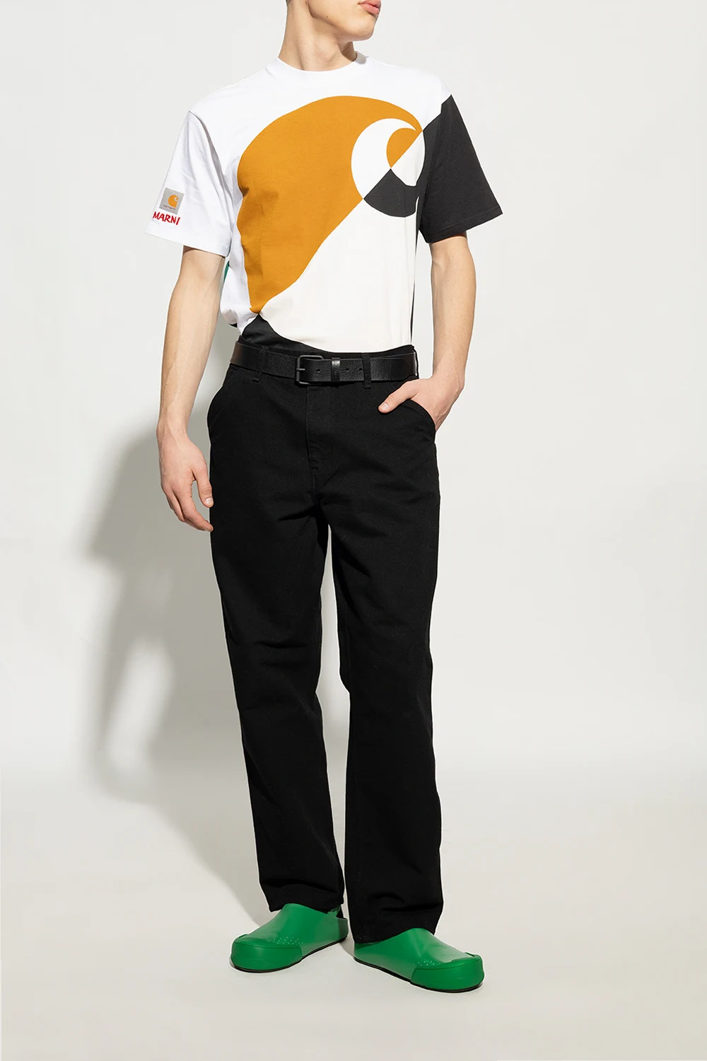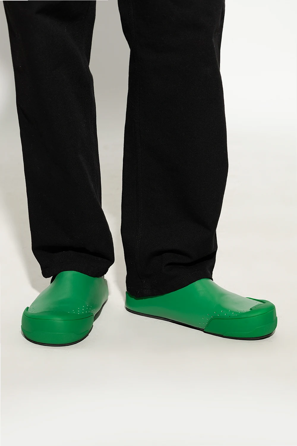 Zielone buty Marni. Wykonane ze skóry. Wykończone zamszem i gumą. Wokół kostki zapinane na regulowany pasek z klamrą. Z przodu perforacje i wytłoczone logo. Czarna, gumowa podeszwa.