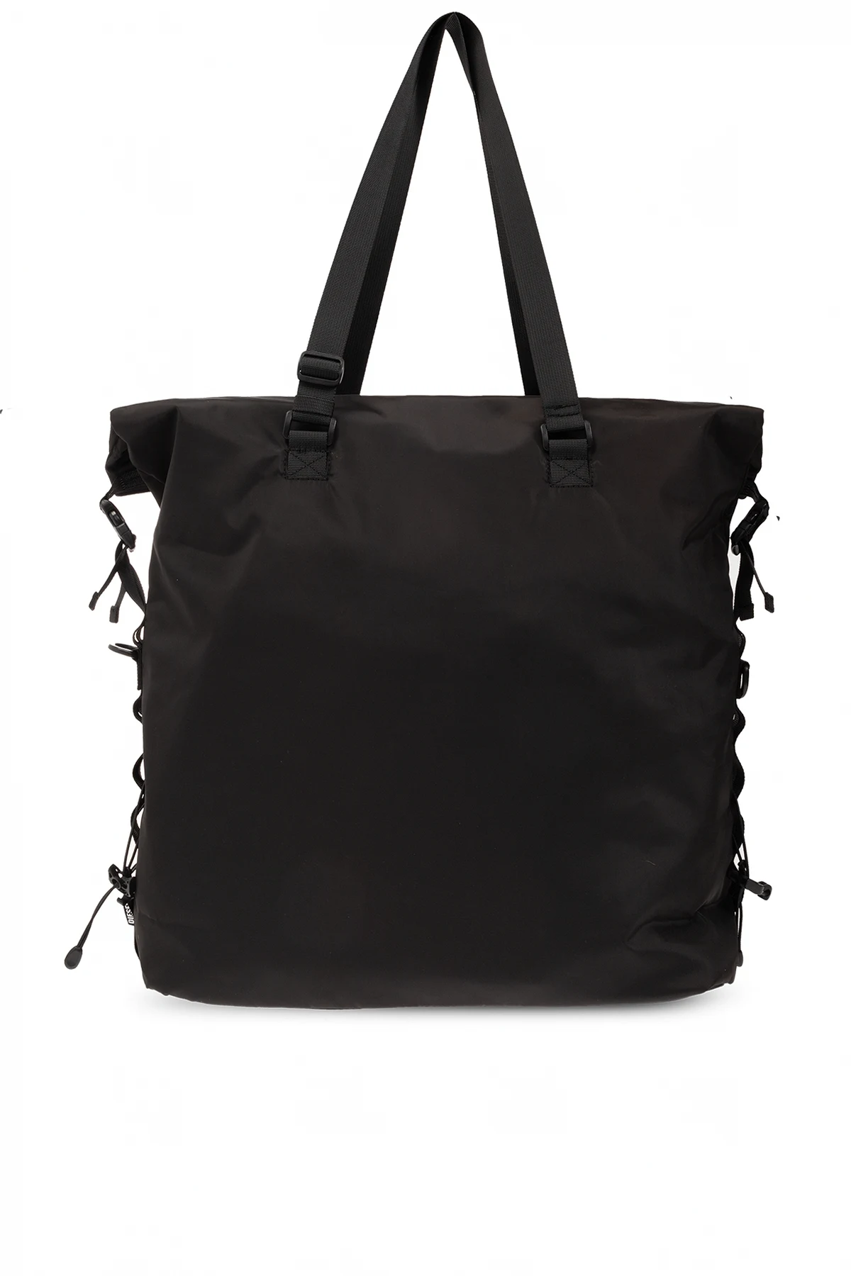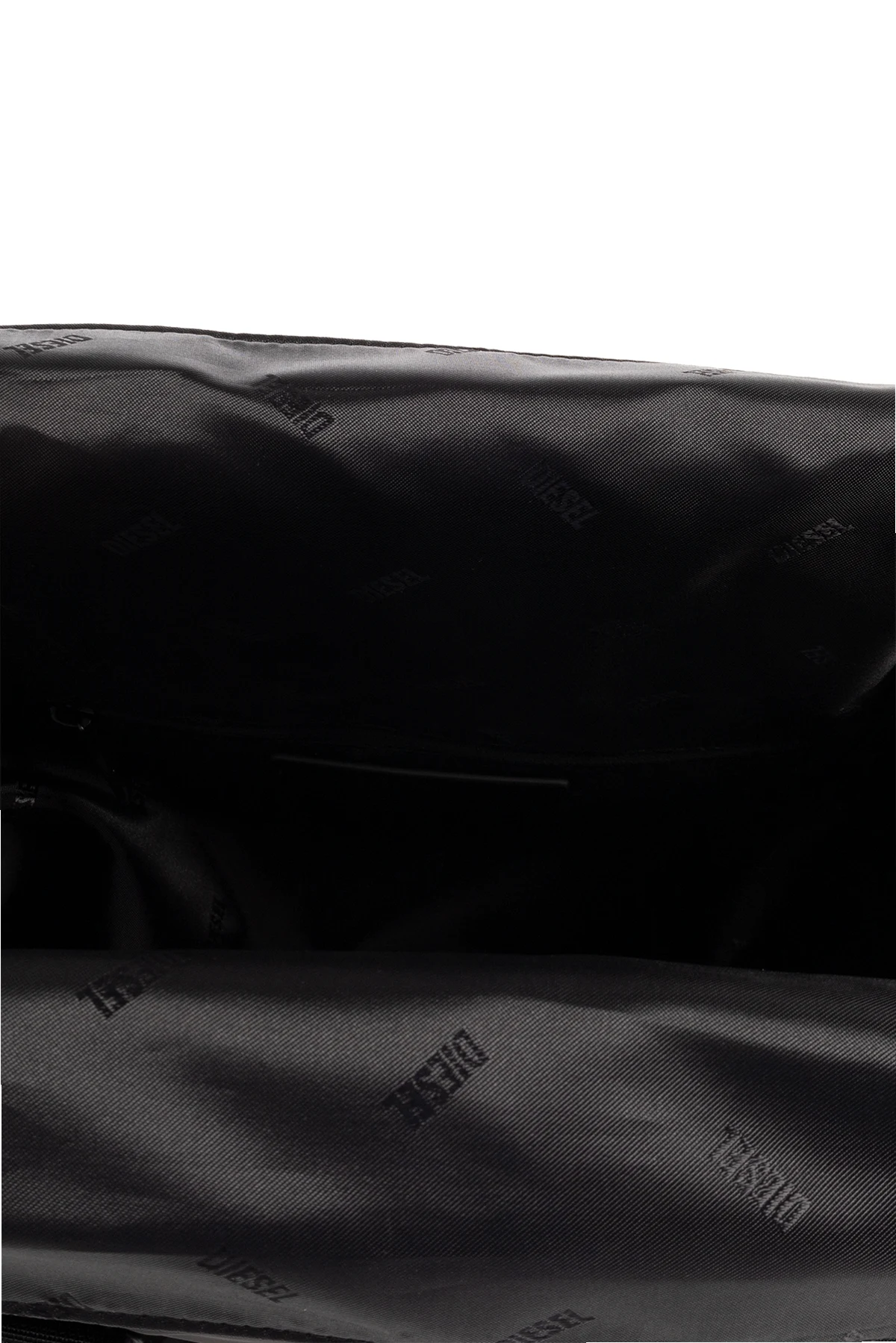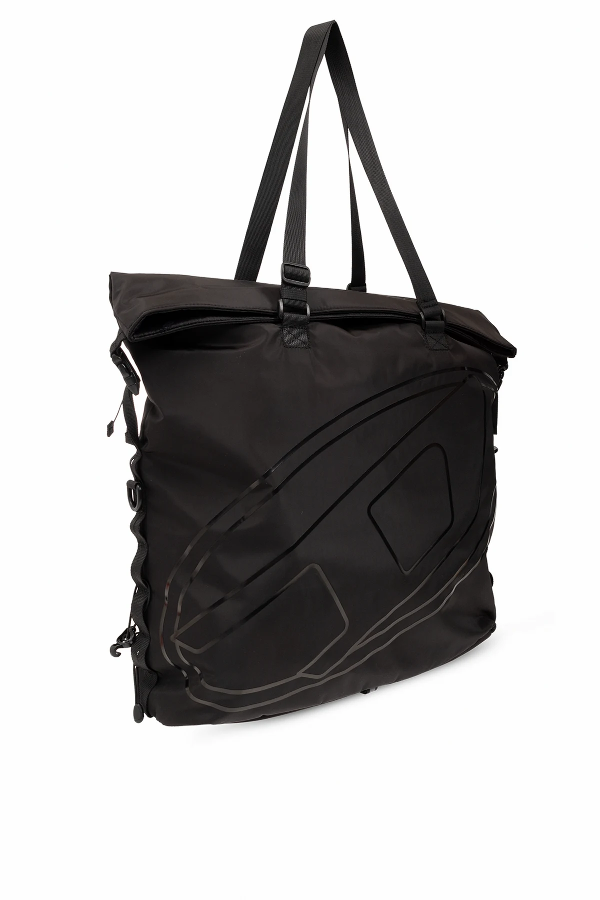 Czarna torba typu ‘shopper’, model ‘DRAPE’ Diesel. Wykonana z materiału. Ozdobiona nadrukowanym logo. Po bokach wszyty dekoracyjny pasek. Dwie półokrągłe rączki. Odpinany, regulowany pasek. Wewnątrz komora i kieszeń zamykana na zamek.