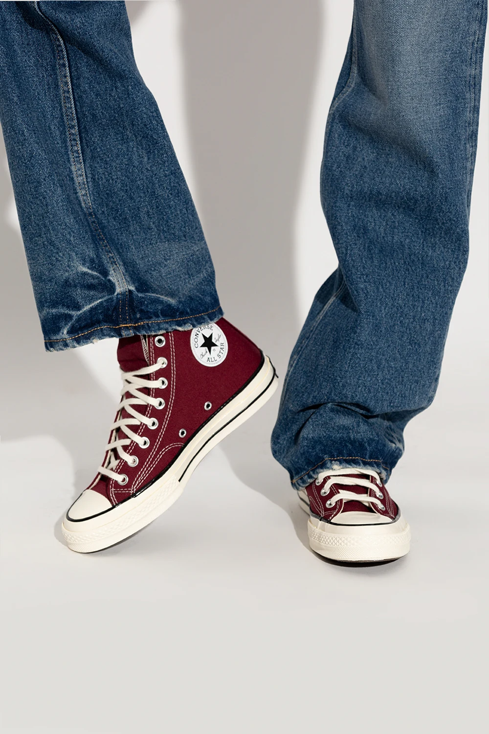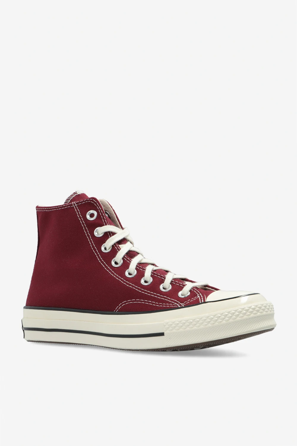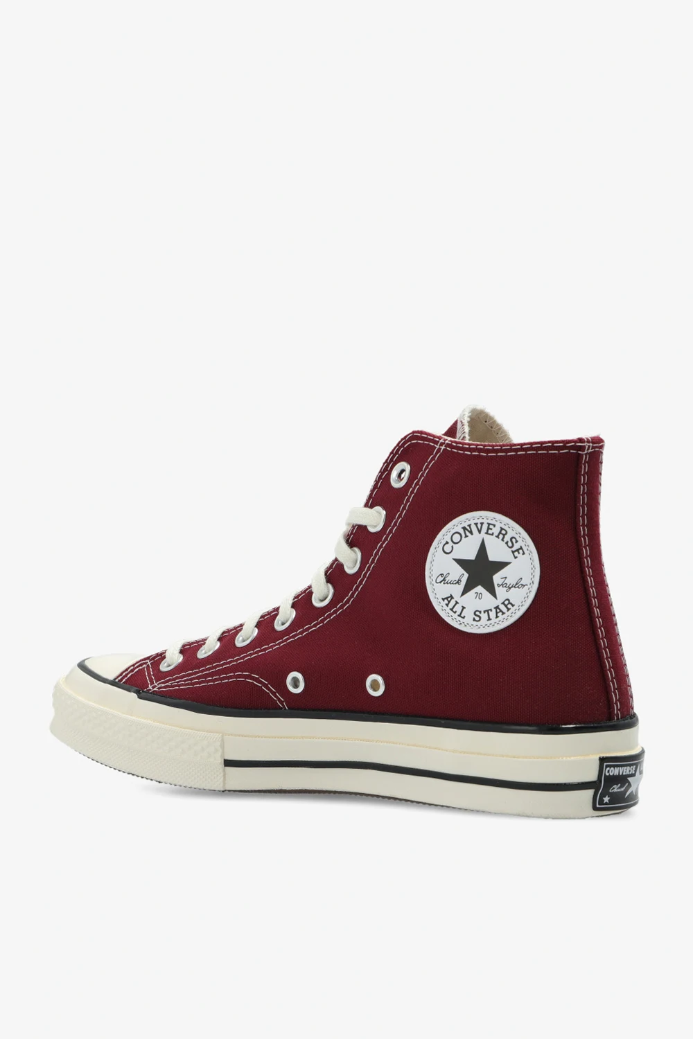 Bordowe, sznurowane buty sportowe za kostkę, model ‘Chuck 70 Hi’ Converse. Wykonane z płótna. Z boku naszywka z logo. Brązowa, gumowa podeszwa. Metalowe elementy w kolorze srebrnym.