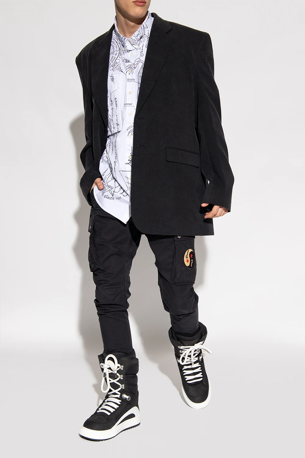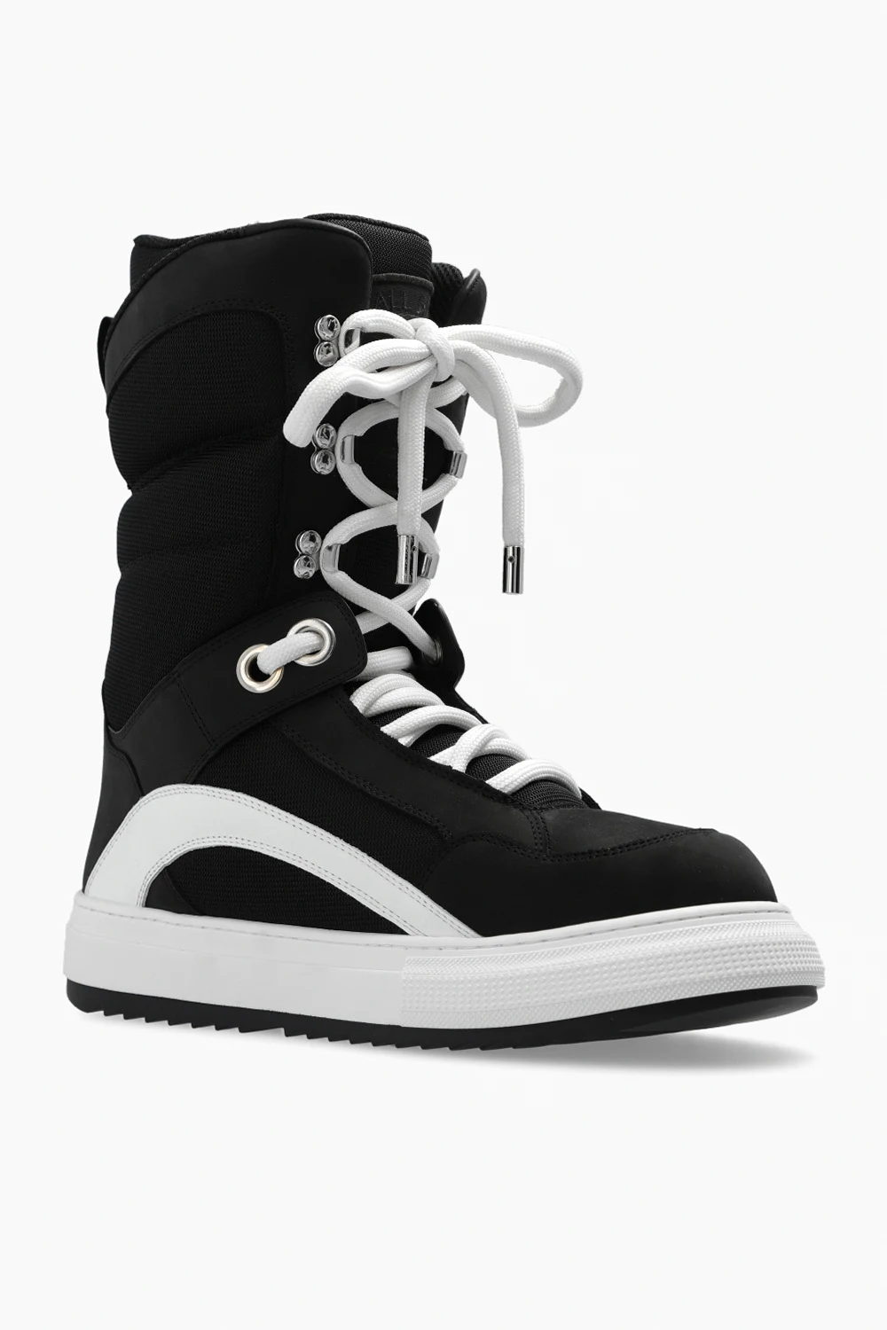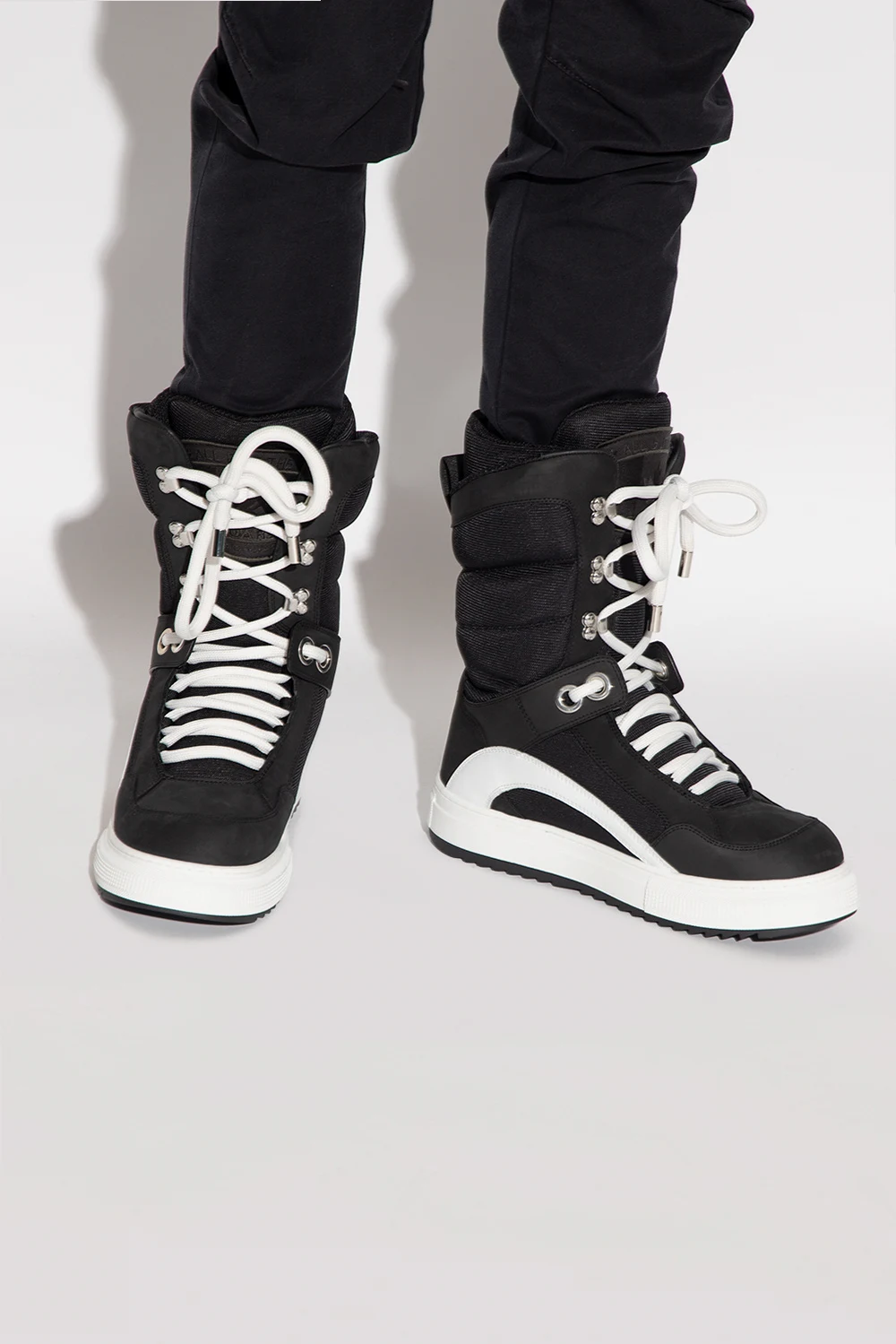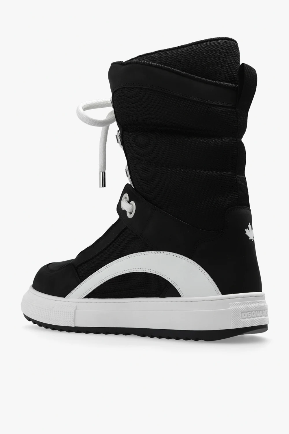 Czarno-białe, sznurowane śniegowce, model 'Boogie' Dsquared2. Wykonane ze skóry, wykończone materiałem. Z tyłu ozdobione logo. Czarna, gumowa podeszwa.