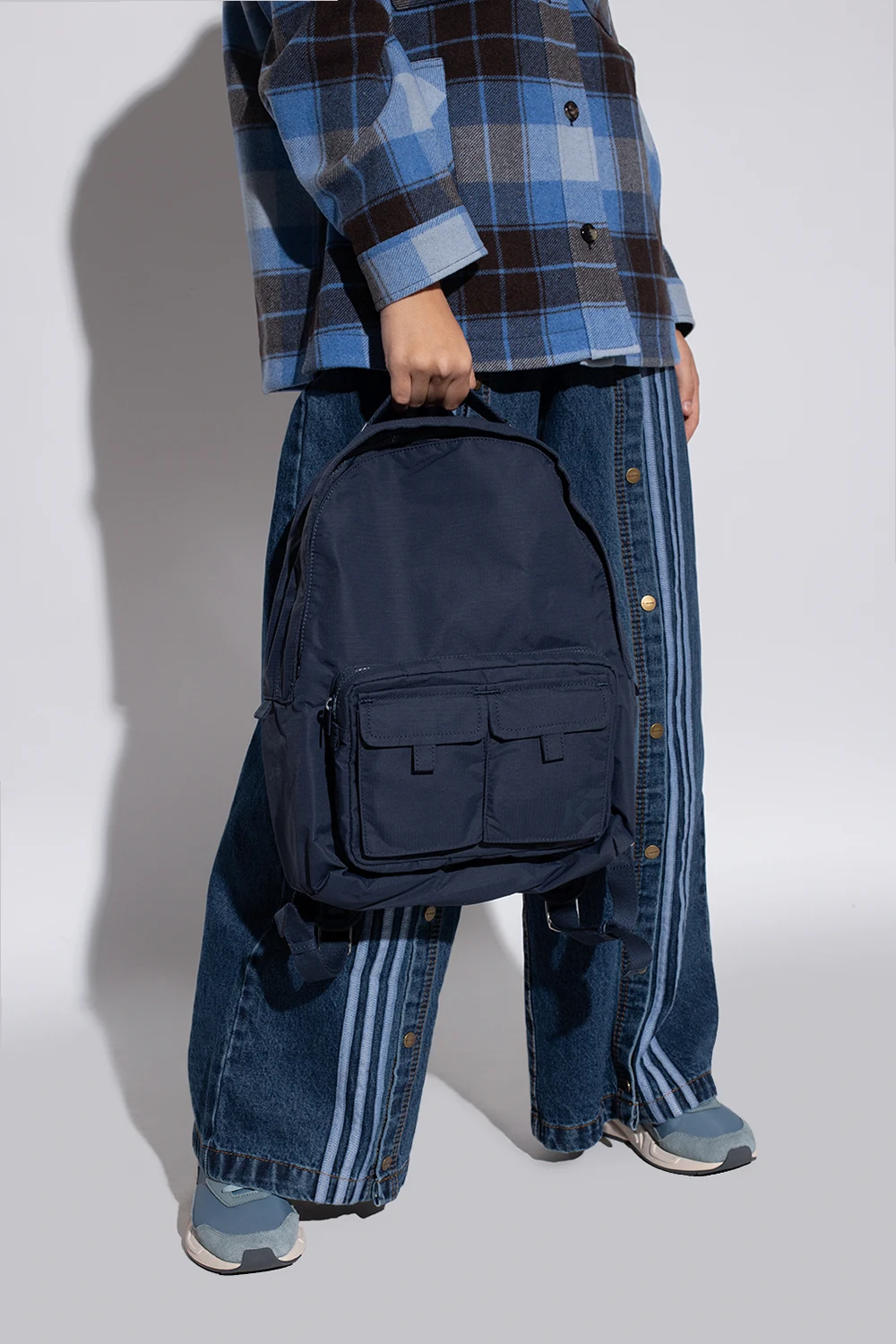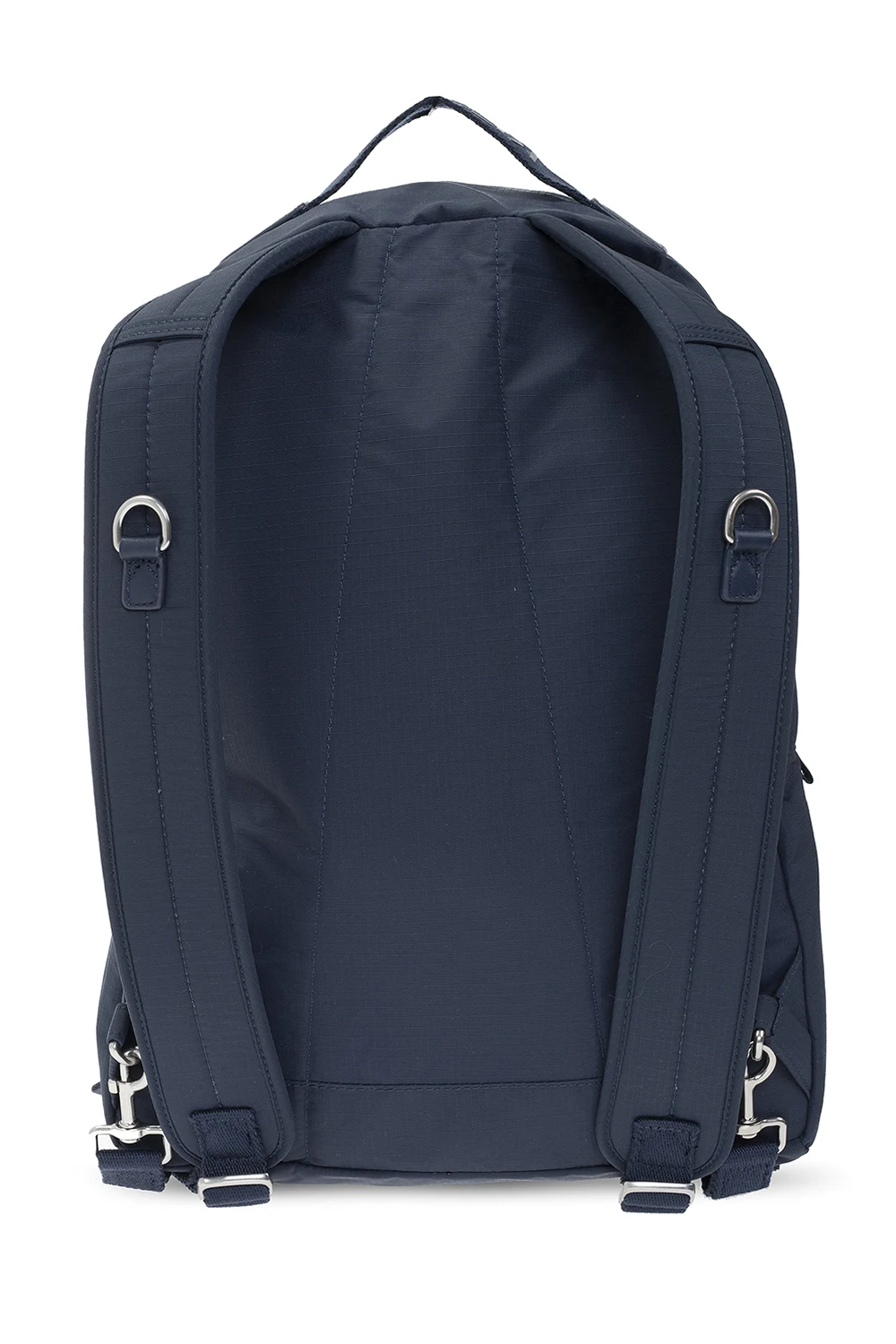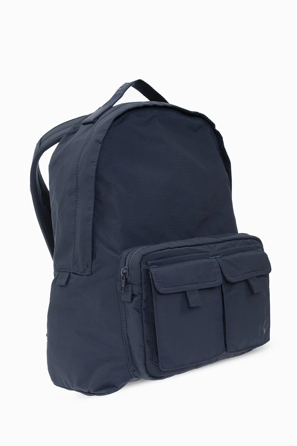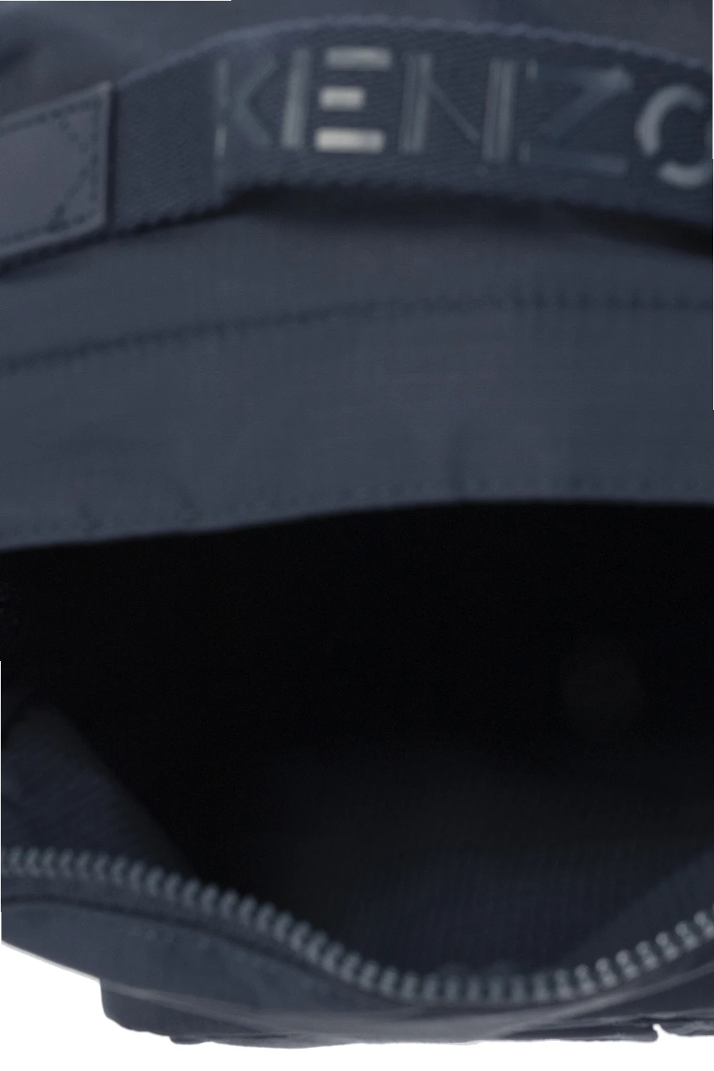 Granatowy plecak Kenzo. Zamykany na zamek biegnący dookoła. Ozdobiony nadrukowanym logo. Z przodu trzy kieszenie – dwie z patkami zamykanymi na magnetyczne zapięcie i jedna na zamek. Półokrągła rączka. Z tyłu regulowane szelki. Dołączony pasek z karabińczykami. Wewnątrz komora ze wsuwaną kieszenią.