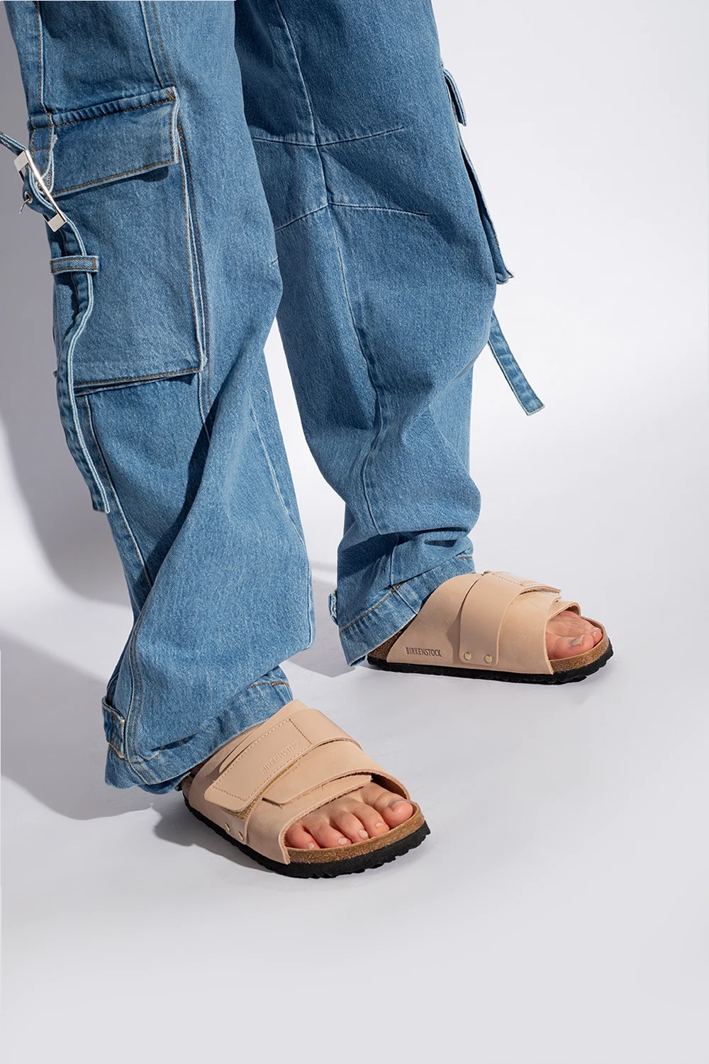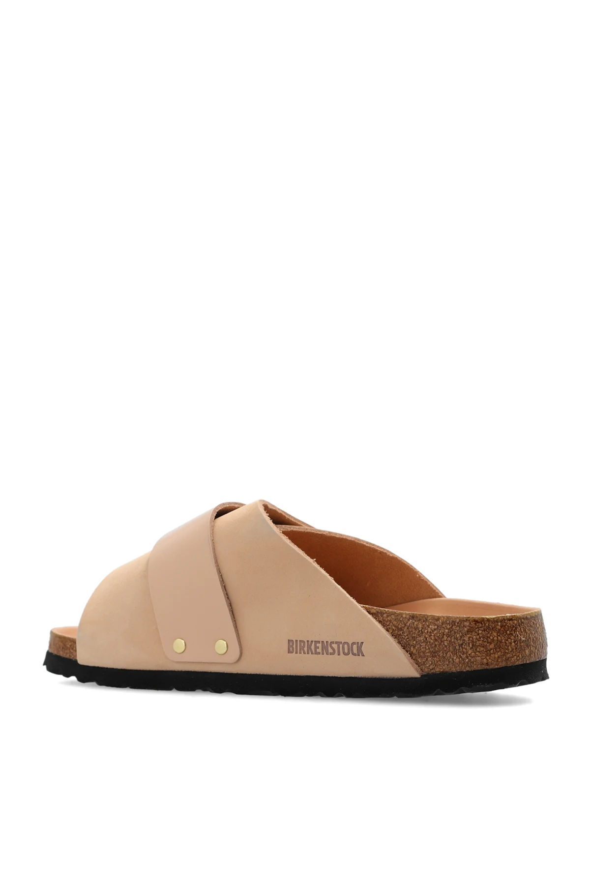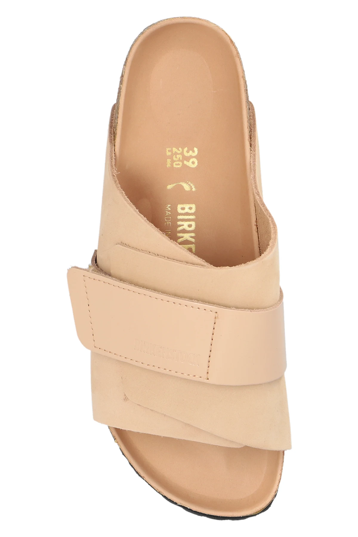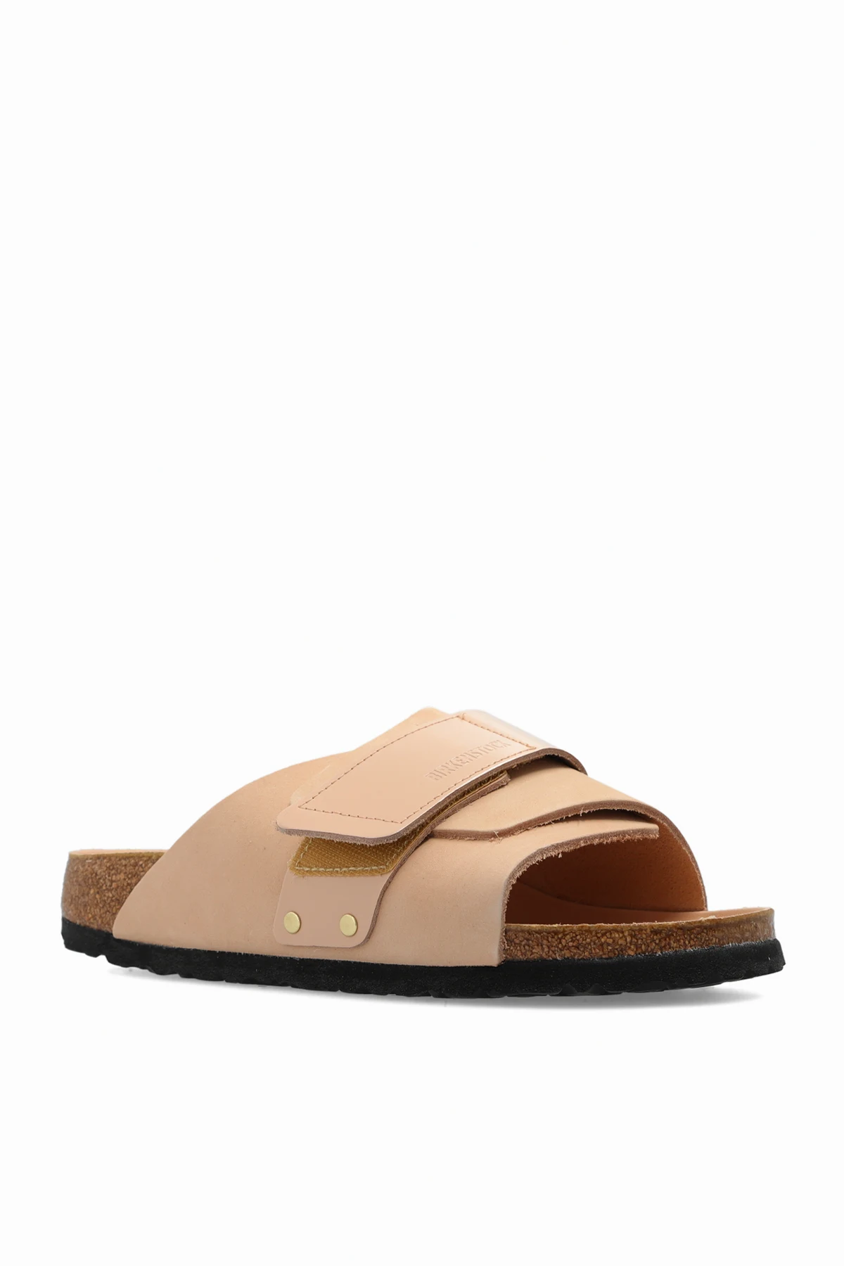 Pudroworóżowe klapki, model ‘Kyoto’ Birkenstock. Wykonane ze skóry nubukowej i skóry polerowanej. Zapinane na rzep ozdobiony wytłoczonym logo. Anatomicznie ukształtowana wkładka korkowo-lateksowa o zwężanej szerokości. Czarna podeszwa zewnętrzna wykonana z pianki EVA.