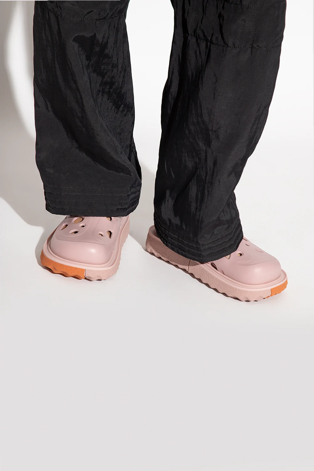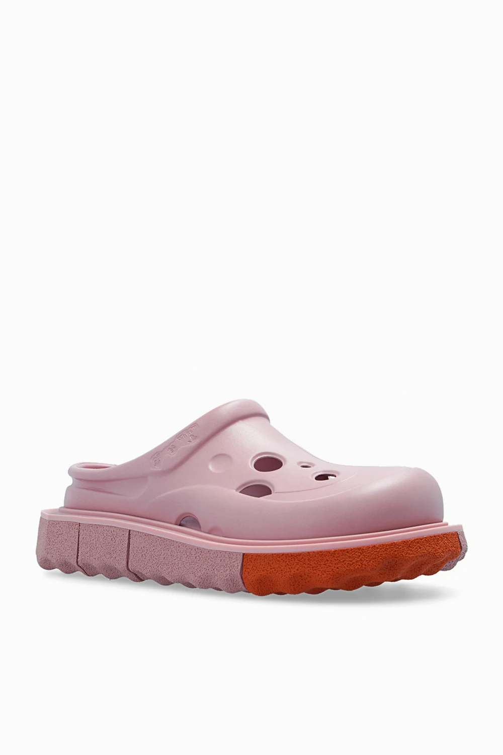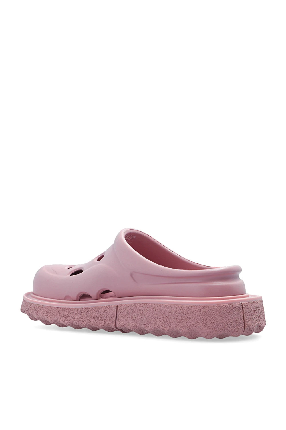 Różowe klapki, model ‘Meteor’ Off-White. Dekoracyjne wycięcia. Wytłoczone logo. Warstwa wewnętrzna wykończona skórą. Różowo-pomarańczowa, gumowa podeszwa.