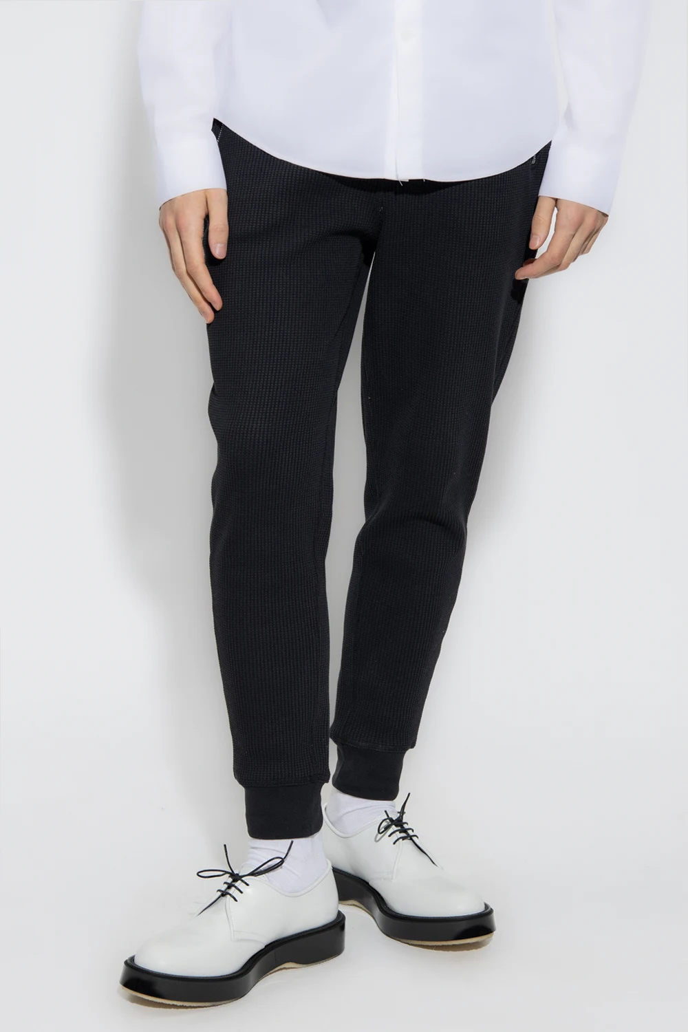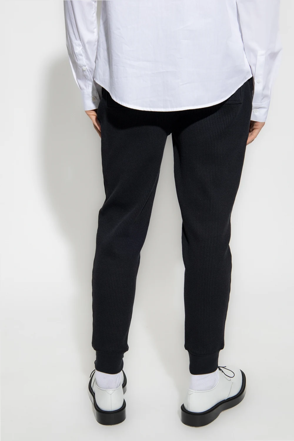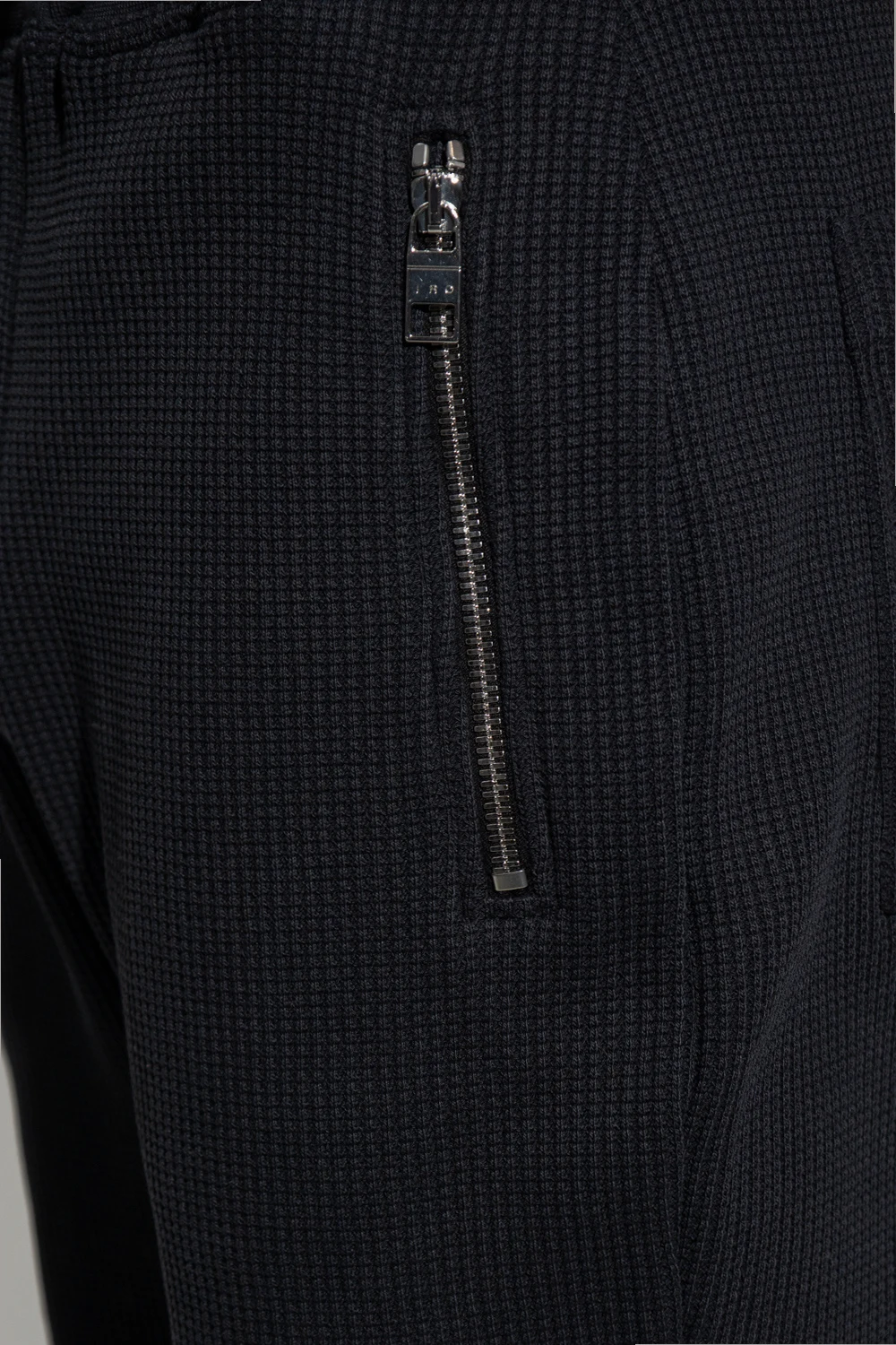 Czarne spodnie dresowe, model ‘Lucio’ Iro. Wykonane z bawełny o specjalnej fakturze. W pasie wszyta guma ściągana trokami. Cztery kieszenie: z przodu dwie zapinane na zamek i z tyłu dwie wsuwane. Długie nogawki zakończone ściągaczem.
