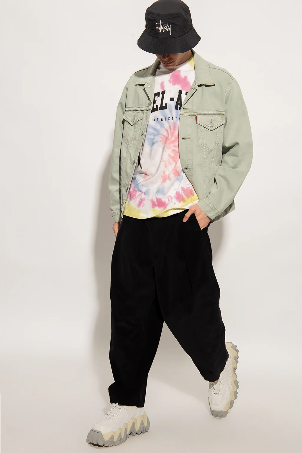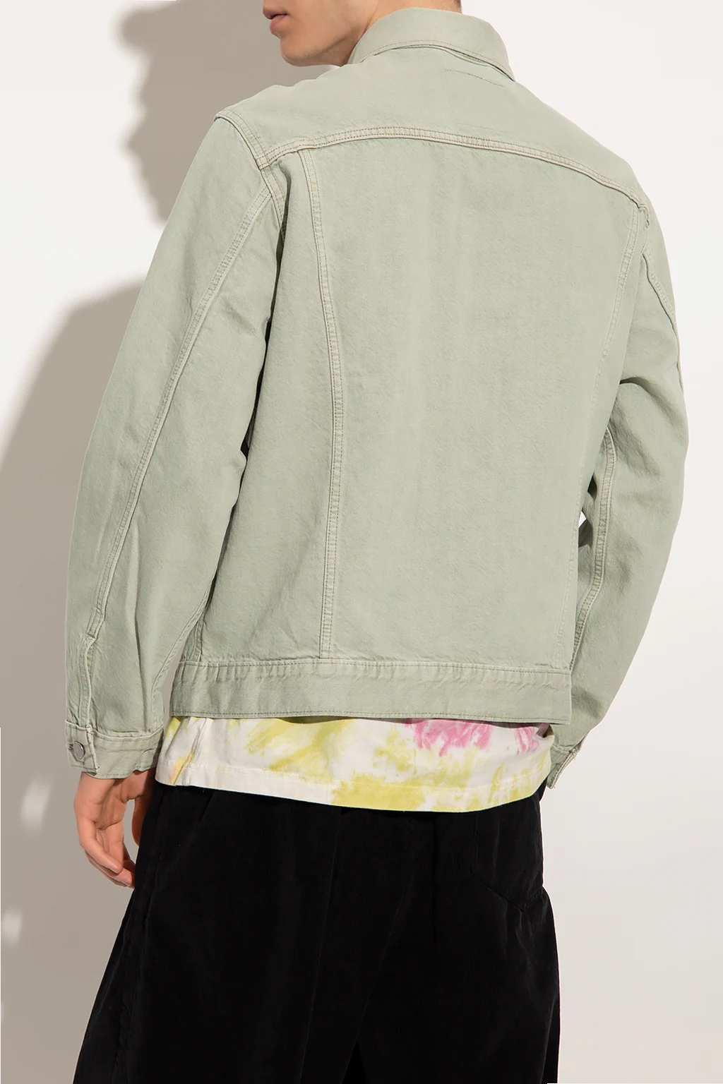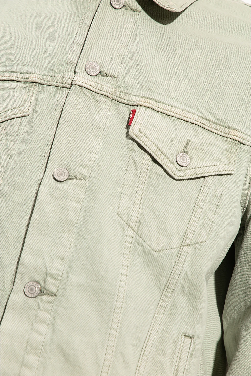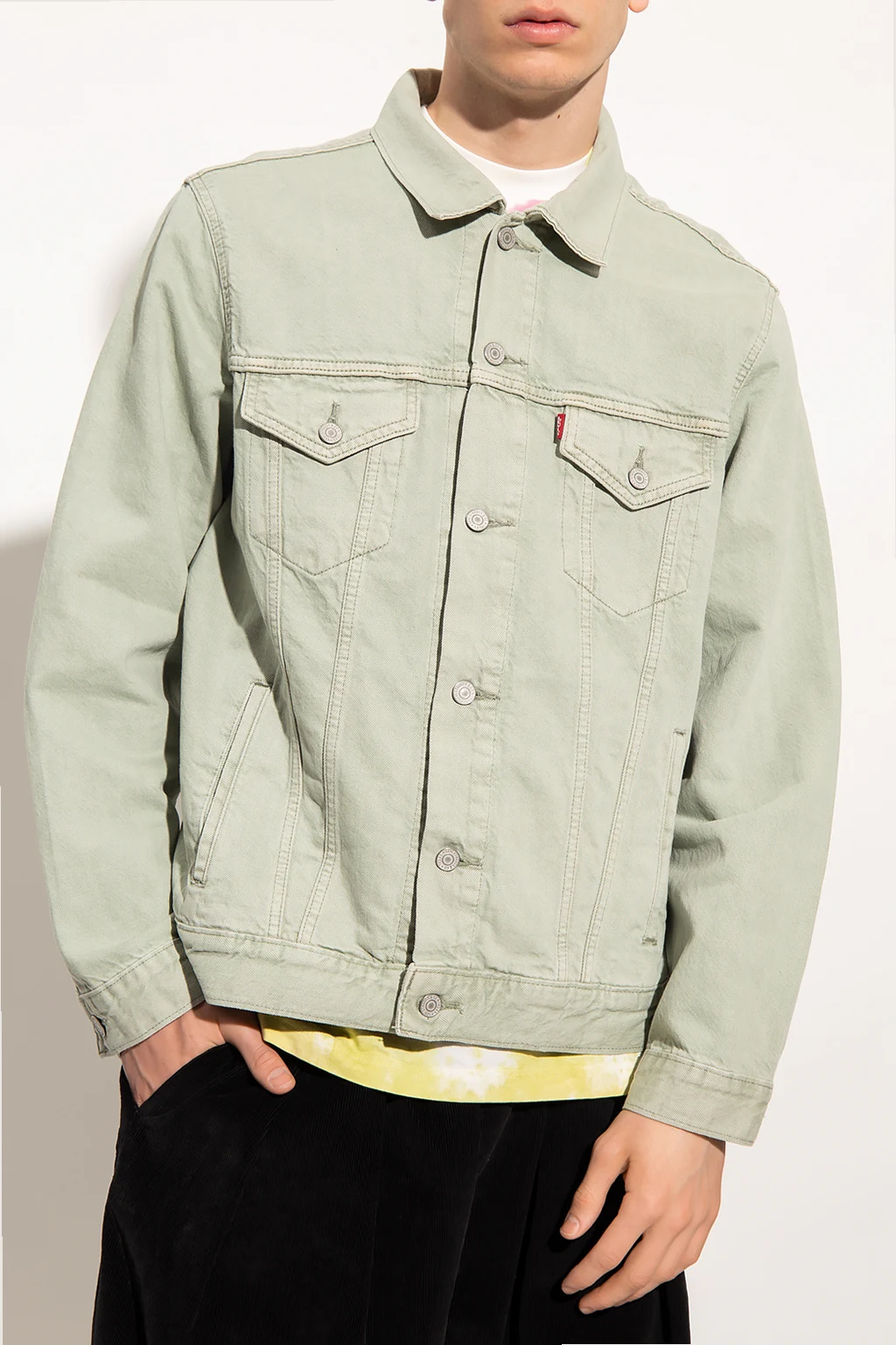 Zielonoszara, jeansowa kurtka Levi’s, kolekcja ‘WellThread™’. Zapinana na guziki. Cztery kieszenie: dwie wsuwane oraz dwie z patkami. Ozdobiona naszywką z logo w kolorze czerwono-białym. Długie rękawy.