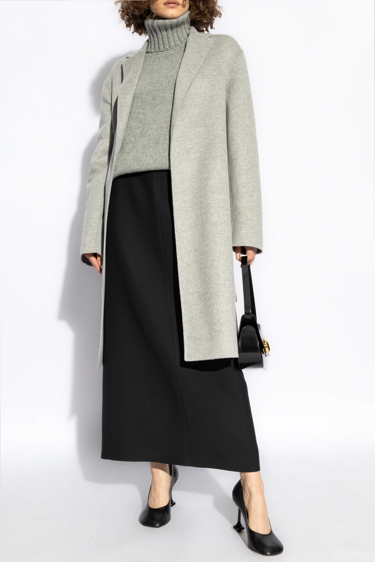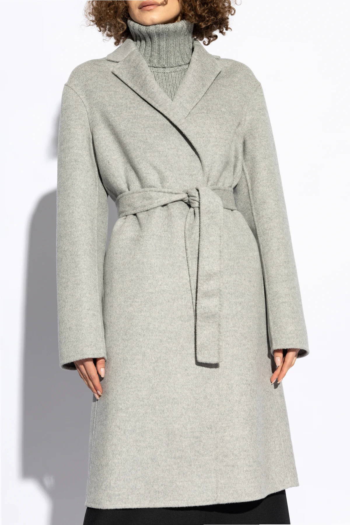 Prezentujemy Państwu wyrafinowany wełniany płaszcz od cenionej projektantki Fabiany Filippi , który stanowi kwintesencję elegancji i wysmakowanego stylu. Wykonany z najwyższej jakości mieszanki wełny i kaszmiru, ten szary płaszcz zachwyca swoją minimalistyczną estetyką, podkreśloną jednolitą, gładką strukturą materiału bez zbędnych ozdób. Długość do połowy uda, wykładany kołnierz oraz długie rękawy nadają modelowi klasyczny charakter, natomiast wyjątkowy sposób zamknięcia - wiązany pasek w pasie - pozwala na zmysłowe podkreślenie sylwetki, dodając całości niepowtarzalnego uroku.