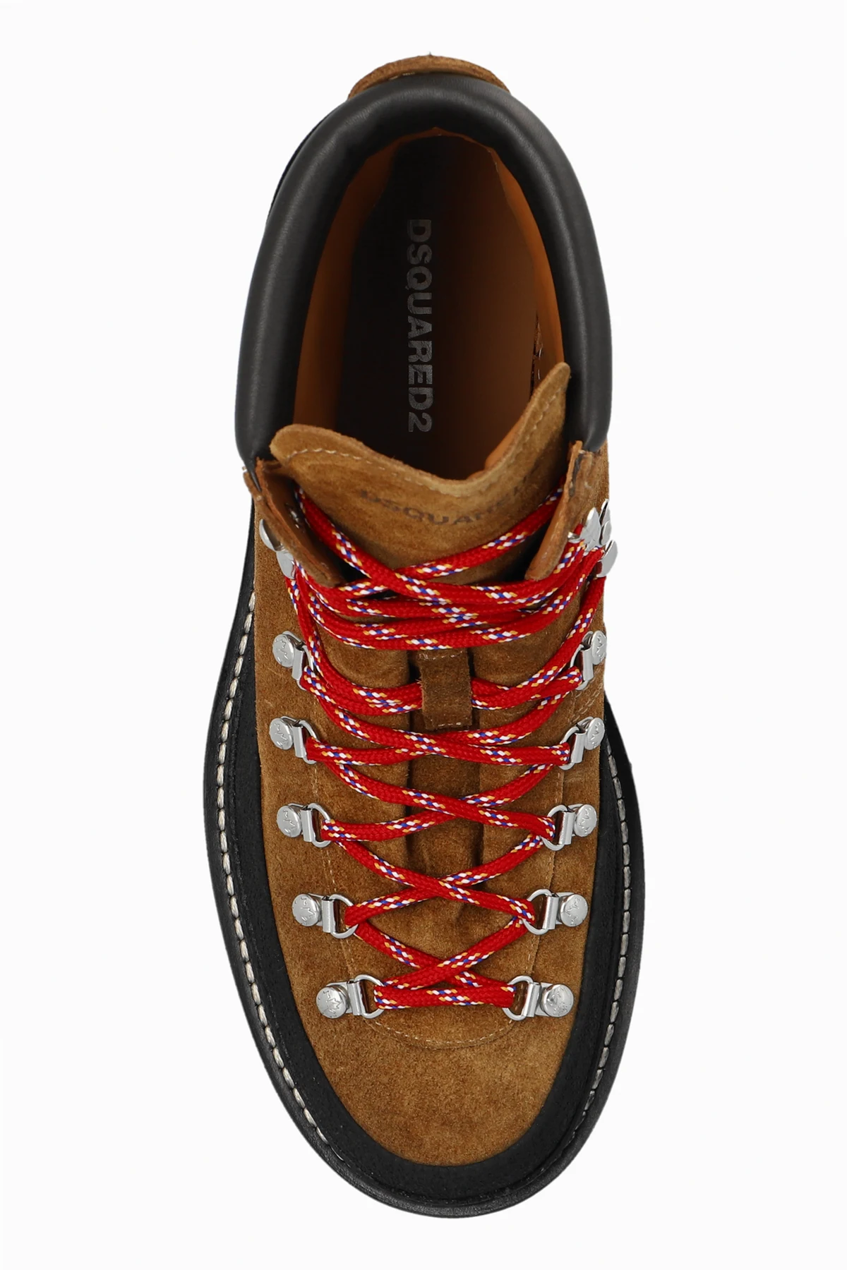 Stylowe, czerwone sznurówki z metalowymi hakami.