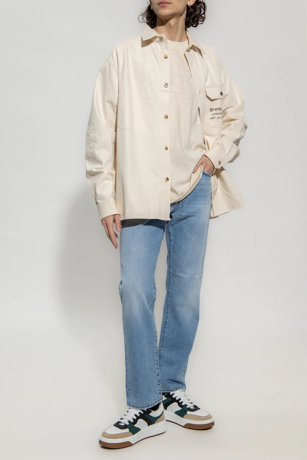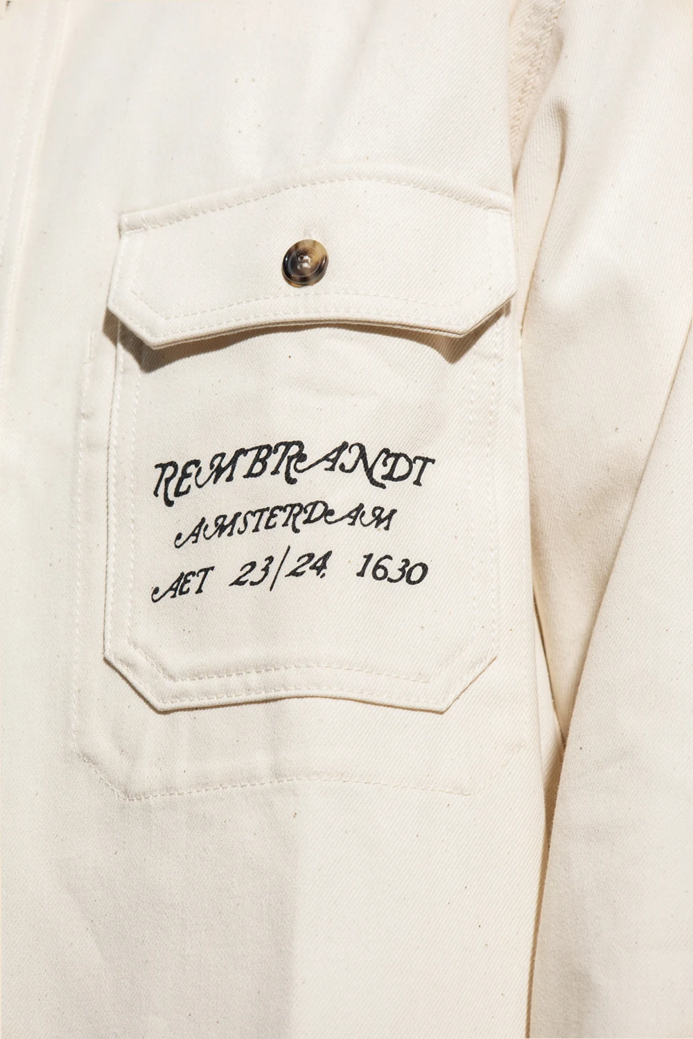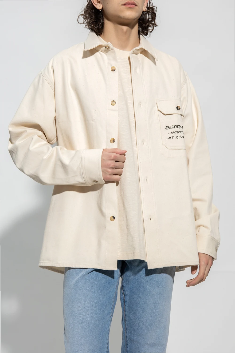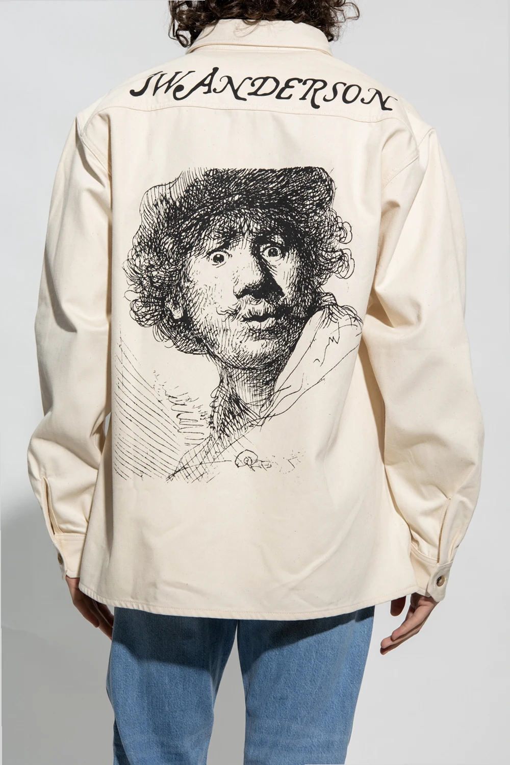 Kremowa, bawełniana koszula o luźnym kroju JW Anderson. Zapinana na guziki. Z przodu i z tyłu nadrukowane napisy oraz motyw autoportretu Rembrandta. Kieszeń z patką zapinana na guzik. Długie rękawy zakończone mankietami.
