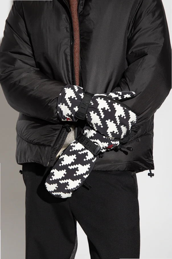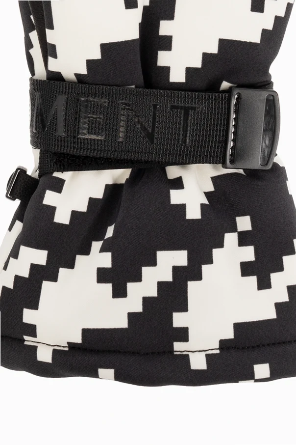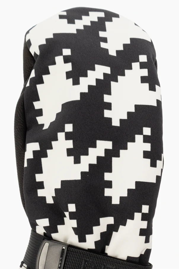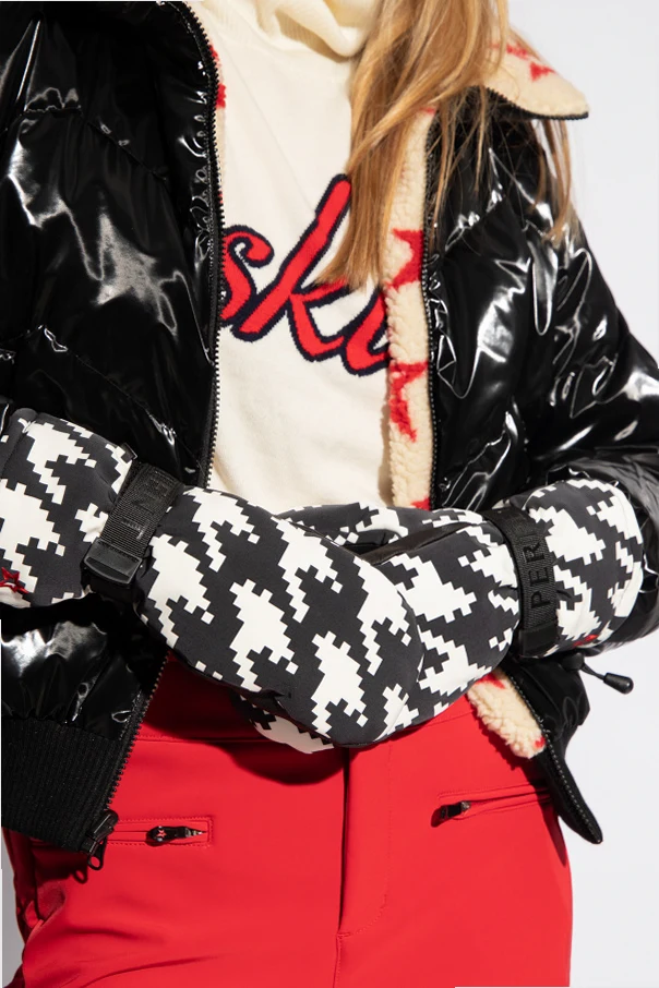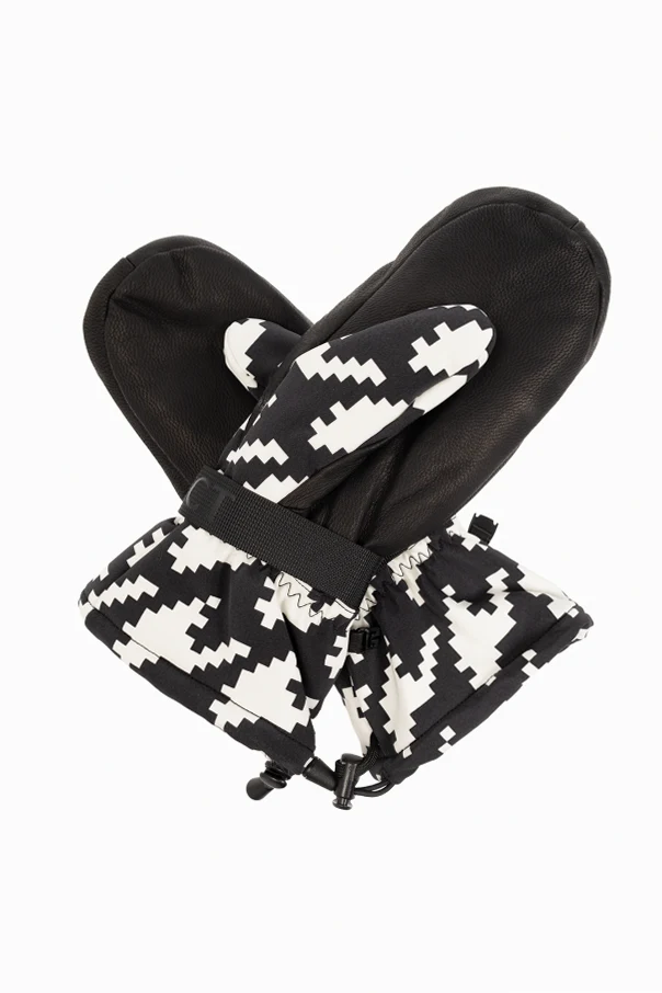 Biało-czarne, wodoodporne rękawice narciarskie Perfect Moment. Wykończone koźlęcą skórą. Ozdobione wzorem. Ściągane trokami i zapinane na pasek z rzepem. Posiadają izolację Thinsulate chroniącą przed żywiołami.