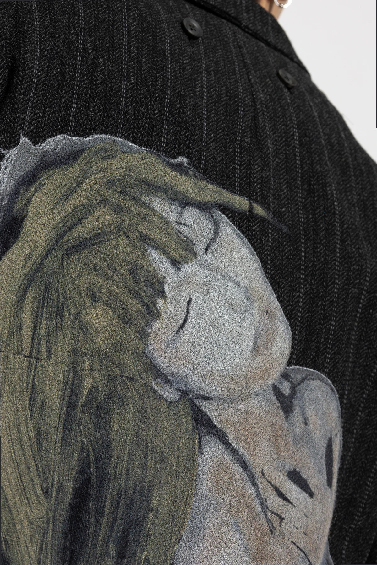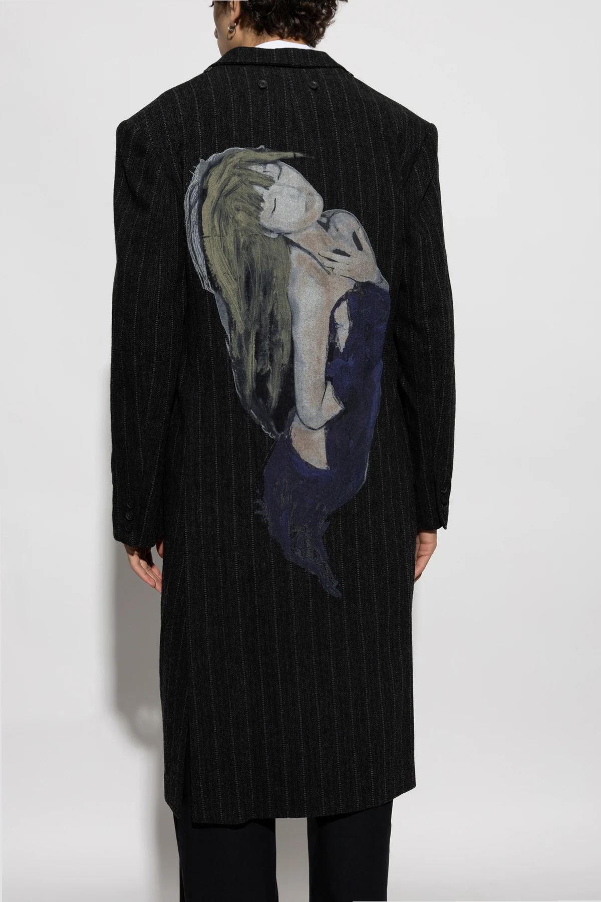 Płaszcz charakteryzuje się ciemnym kolorem z subtelnym prążkowanym wzorem, idealnym do formalnych stylizacji. Na plecach znajduje się malowany motyw artystyczny przedstawiający postać kobiety, co dodaje unikalności temu wyjątkowemu okryciu. Zapięcie na guziki oraz dwie kieszenie z przodu podkreślają praktyczne walory płaszcza.