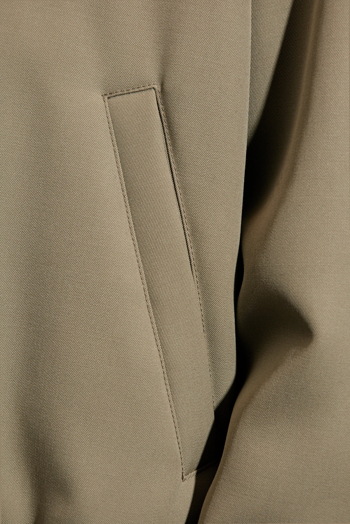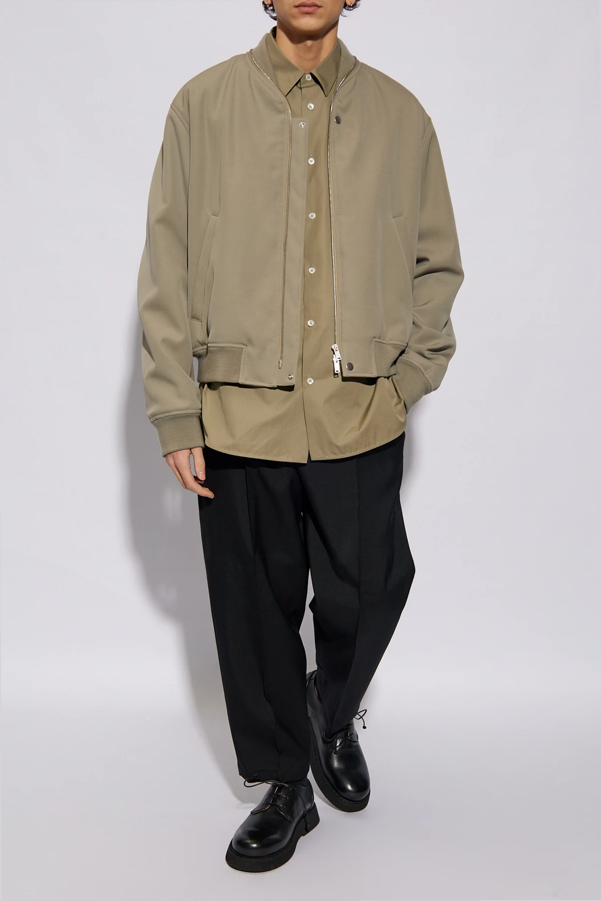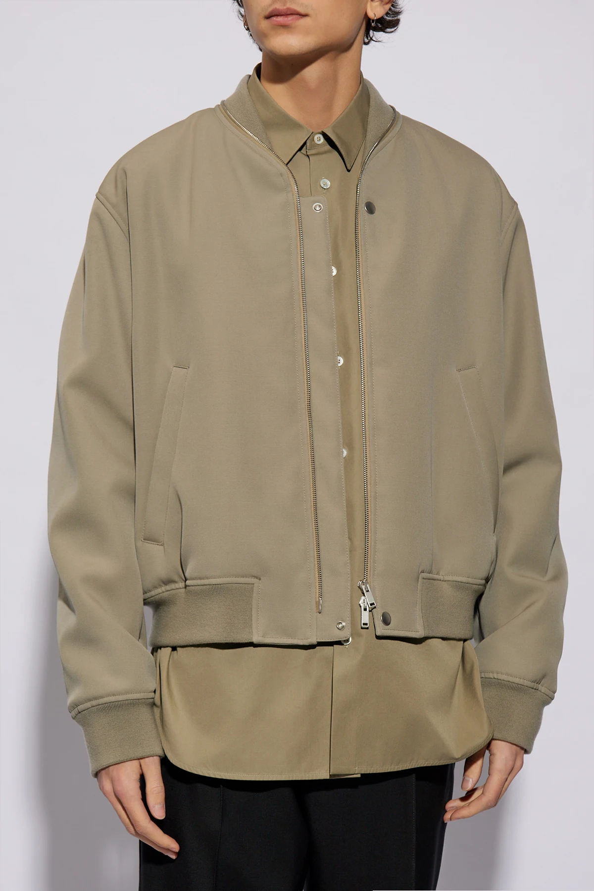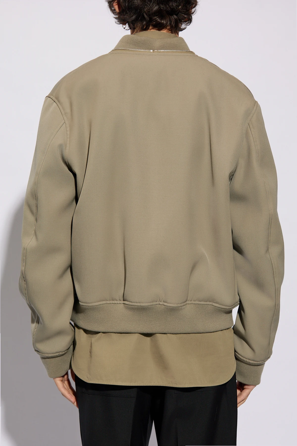Zielonoszara, ocieplana kurtka typu ‘bomber’ JIL SANDER. Wykonana z wełny. Zapinana na dwubiegunowy zamek. Dwie kieszenie zapinane na zatrzask. Dekolt, długie rękawy i dół zakończone ściągaczem.